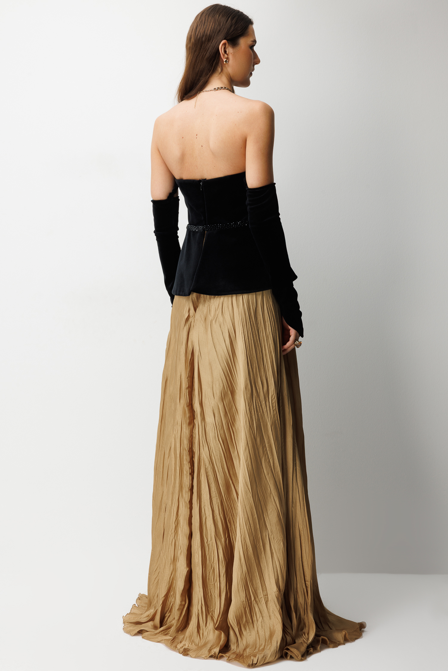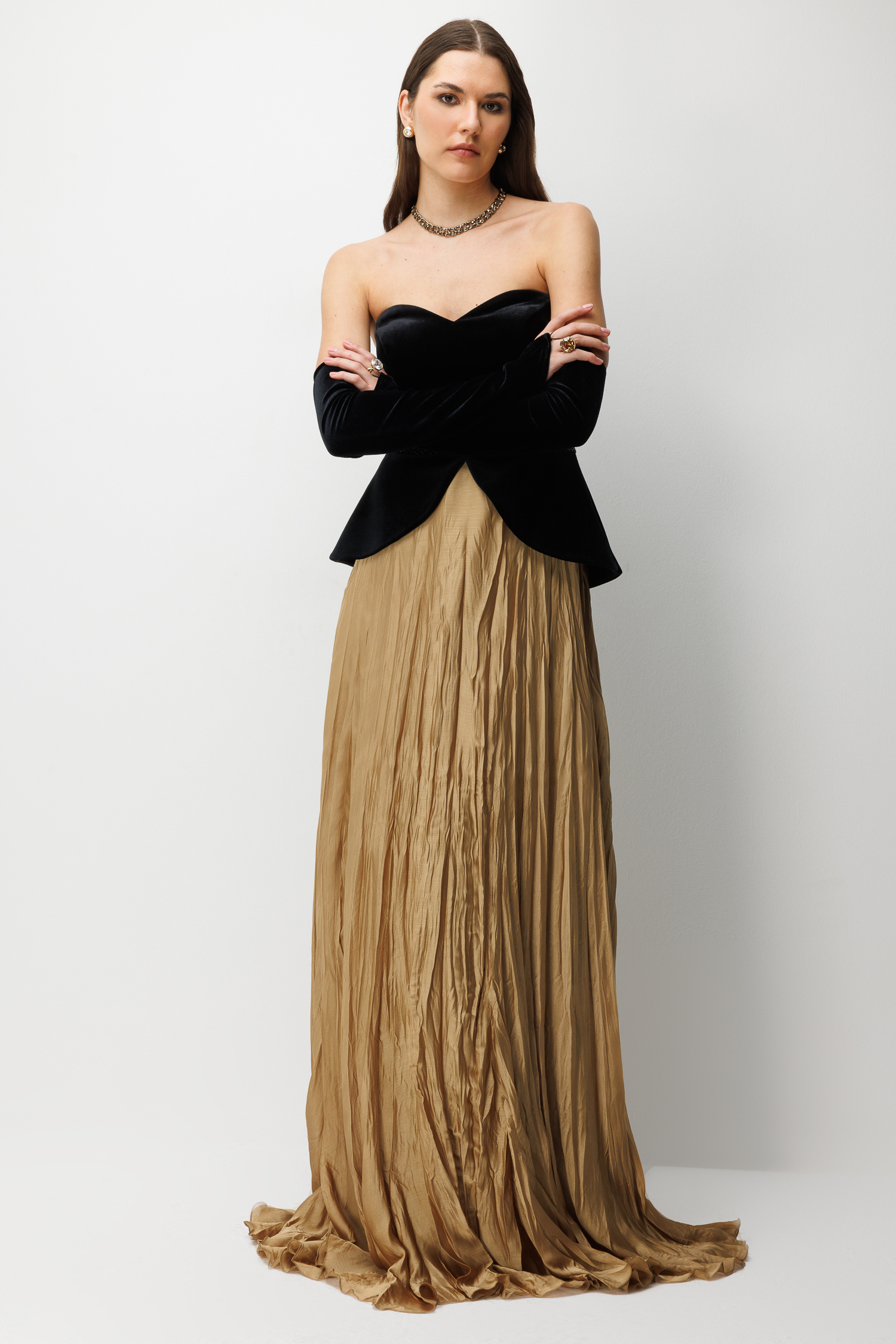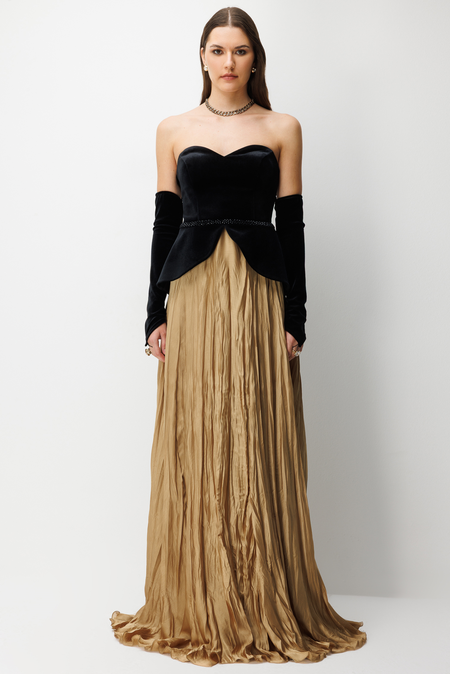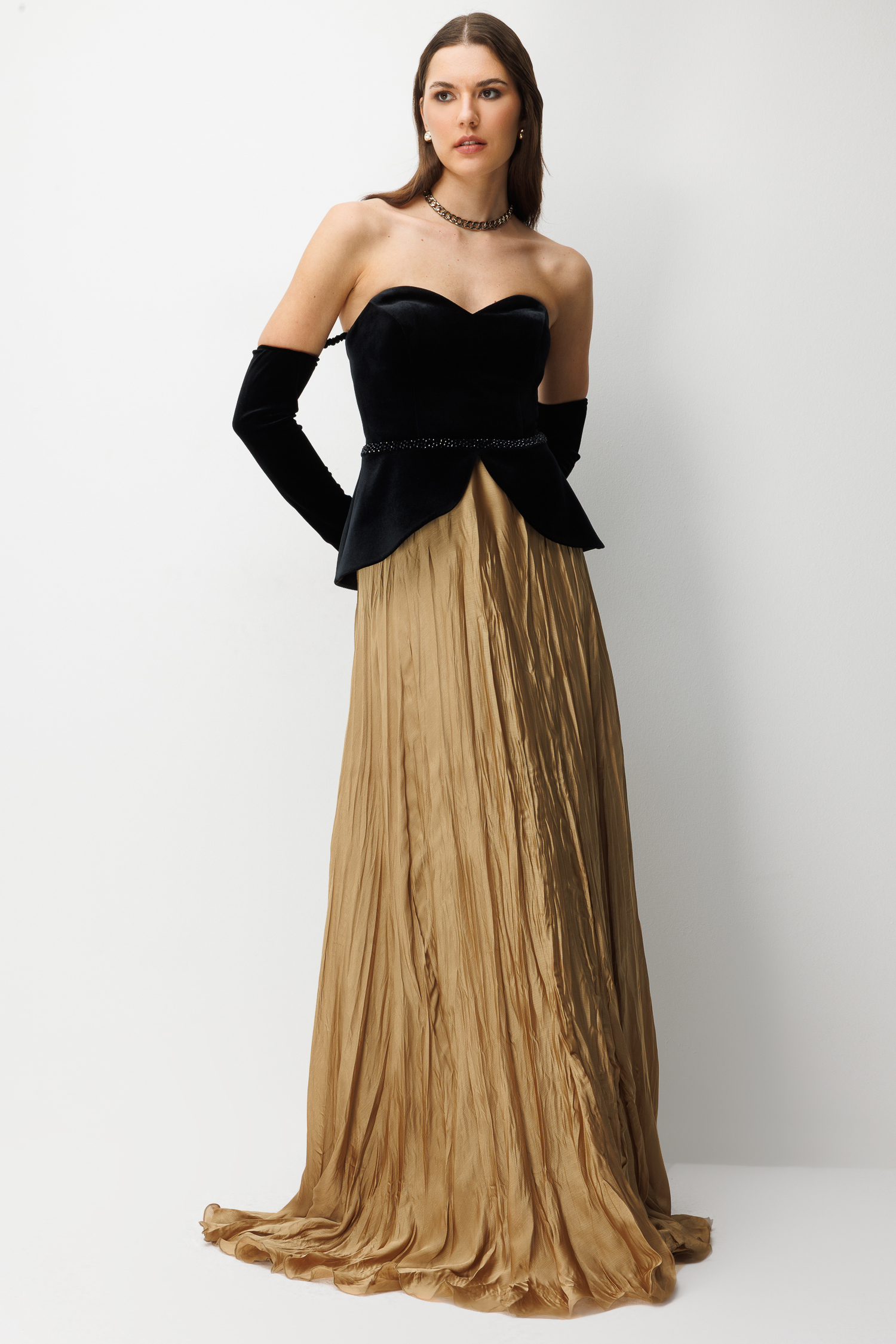 Kumaş: Üst kısımda asil ve derin siyah kadife; alt kısımda ise hareketle birlikte ışık oyunları yaratan, krinkıl (kırışık) efektli altın/bronz metalik dokulu maxi etek.