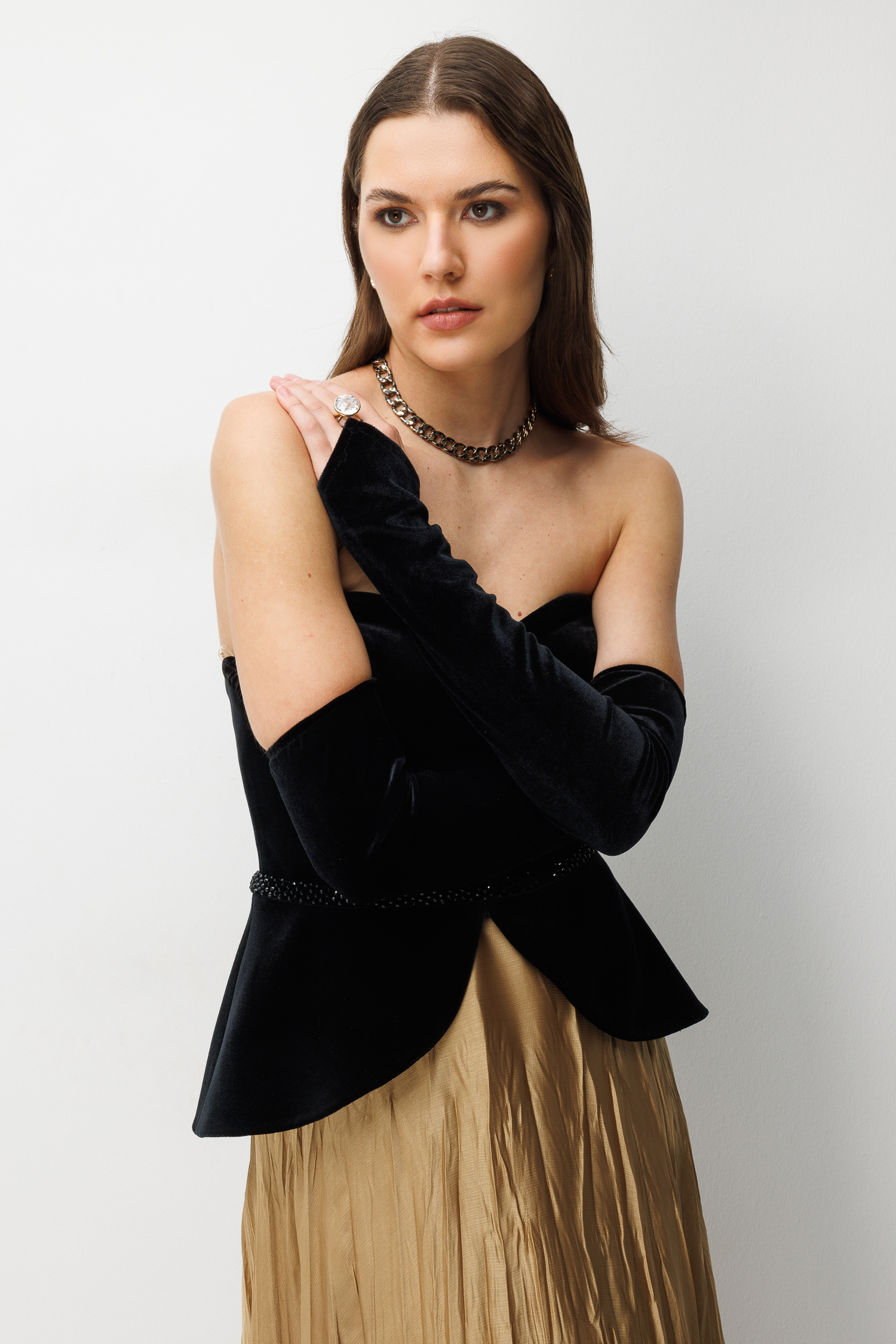 Eldiven Detayı: Elbisenin kol kısımlarına entegre (dikili), dirsek üzerine kadar uzanan siyah kadife eldivenler; aksesuar arayışına gerek bırakmayan, ikonik bir görünüm sağlar.