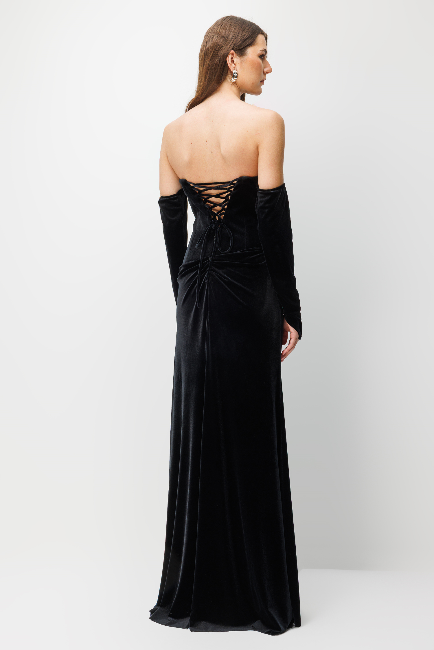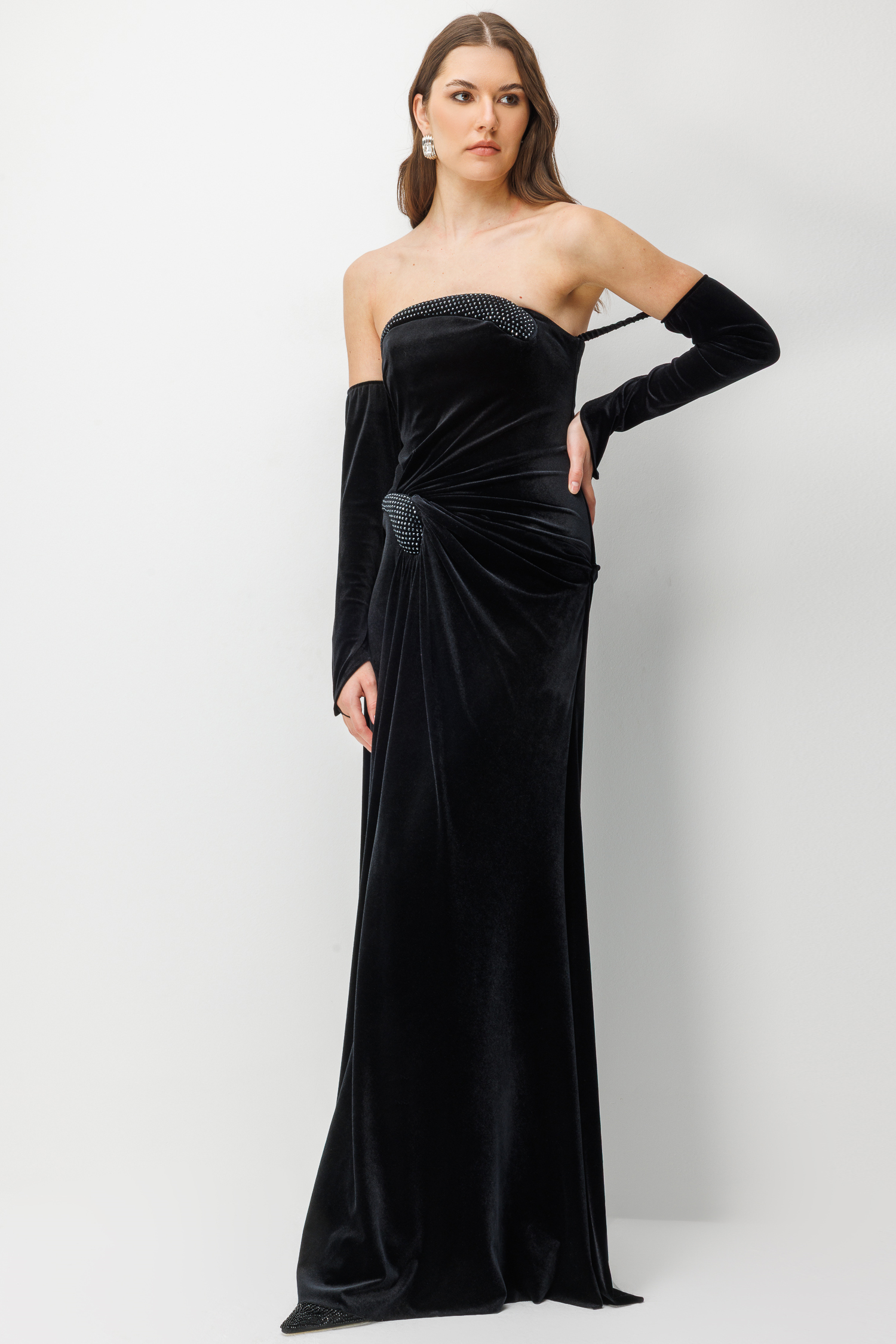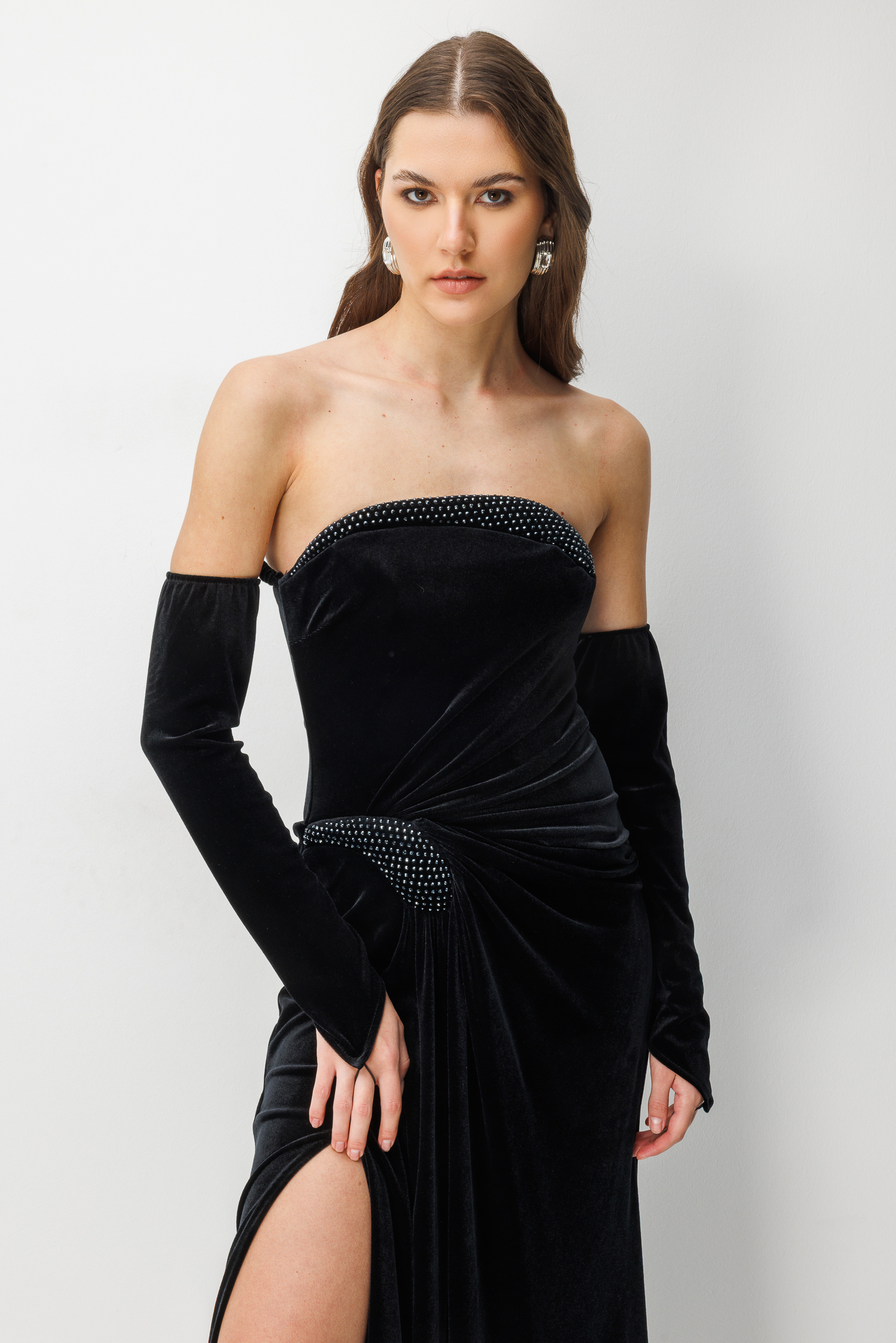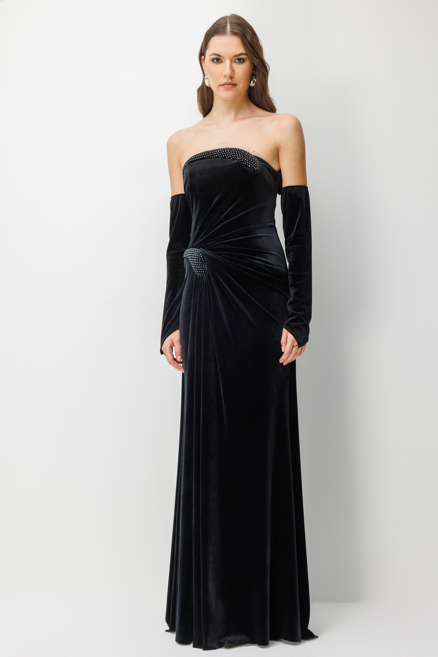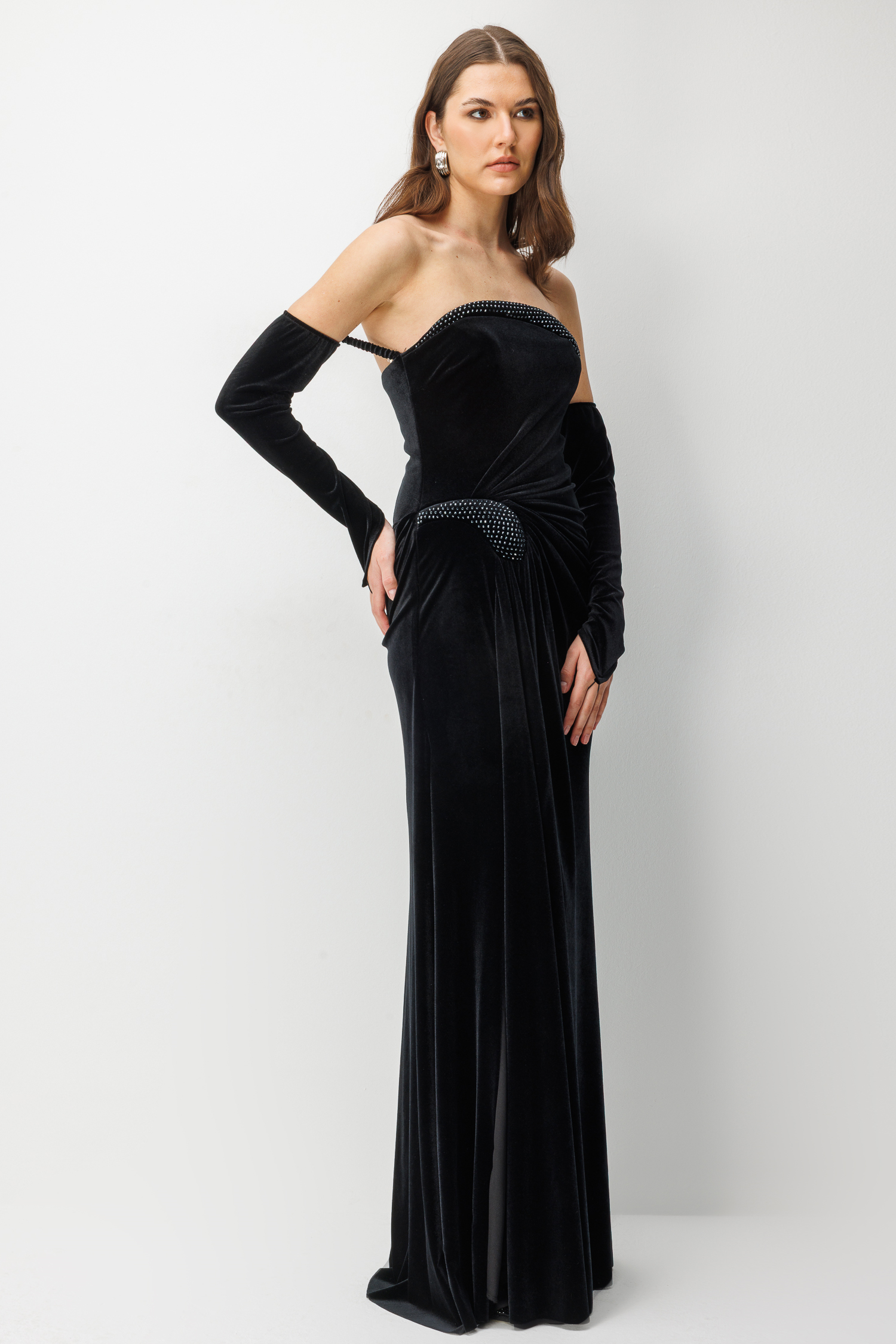 Kadifenin asaletini kristal taş detaylarıyla birleştiren bu uzun elbise, "femme fatale" bir şıklık arayanlar için tasarlandı. Eldiven detayları ve derin yırtmacı ile unutulmaz bir silüet yaratır.
