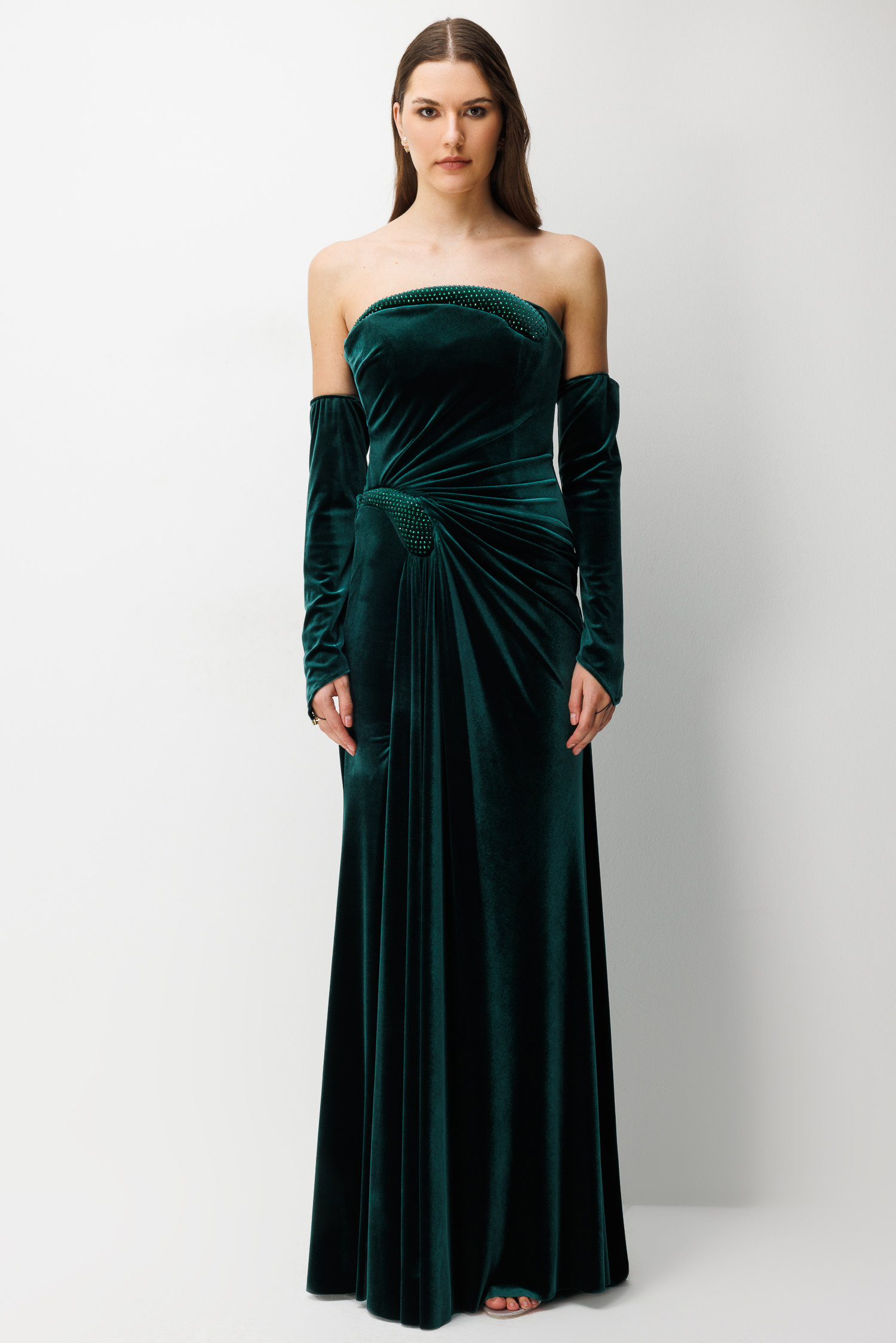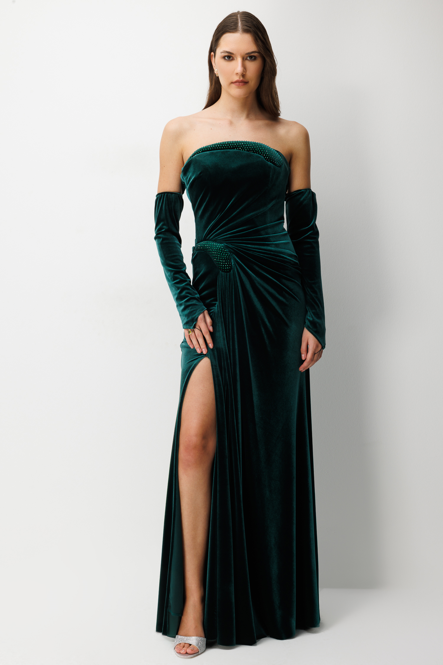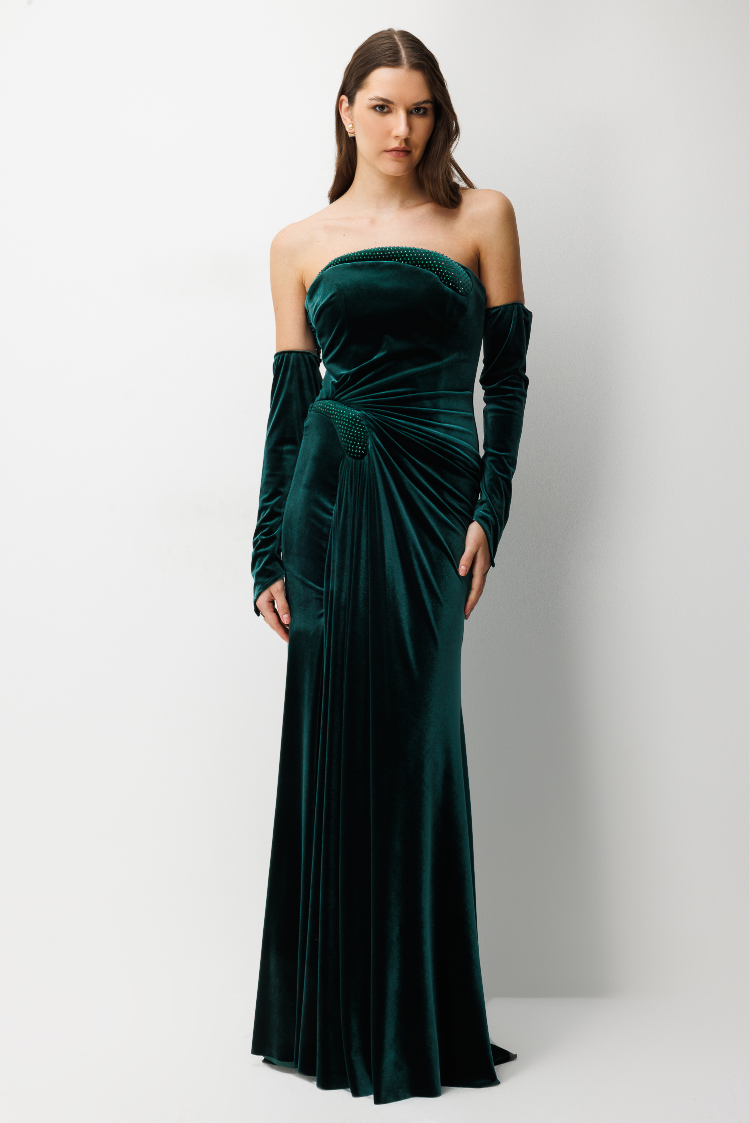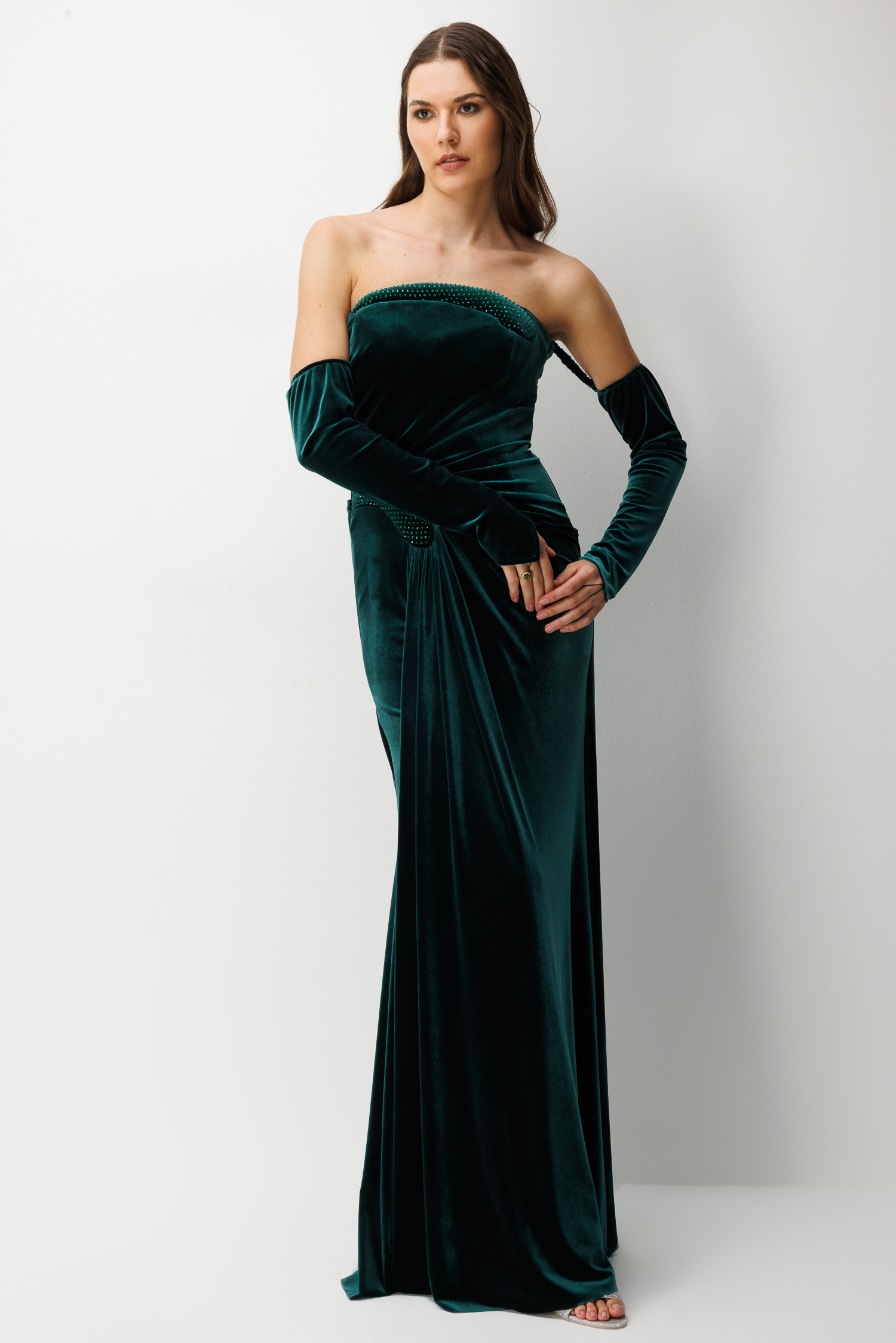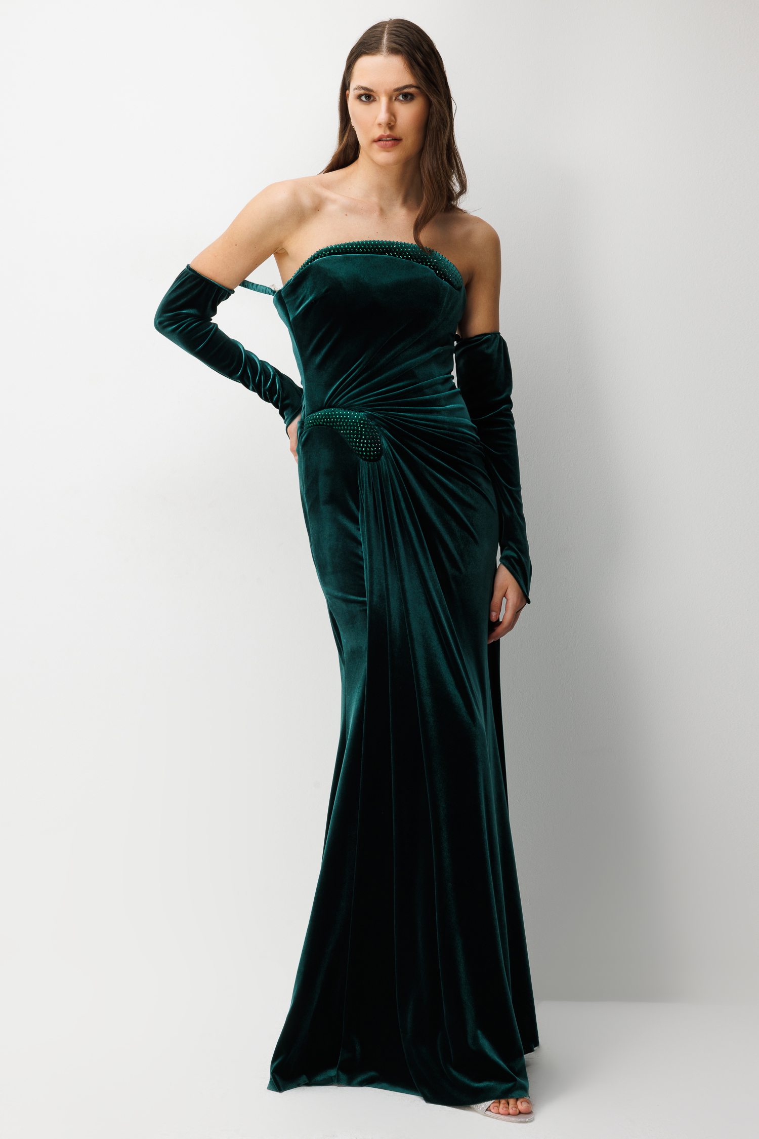 Kadifenin asaletini kristal taş detaylarıyla birleştiren bu uzun elbise, "femme fatale" bir şıklık arayanlar için tasarlandı. Eldiven detayları ve derin yırtmacı ile unutulmaz bir silüet yaratır.