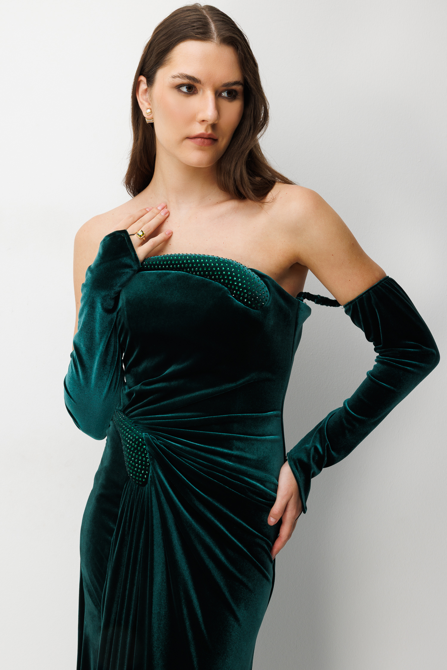 Eldiven Detayı: Elbiseyle bütünleşik, kolu saran şık kadife eldivenler.