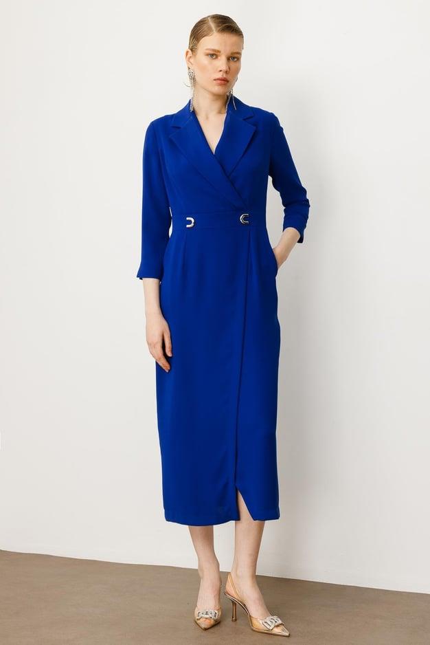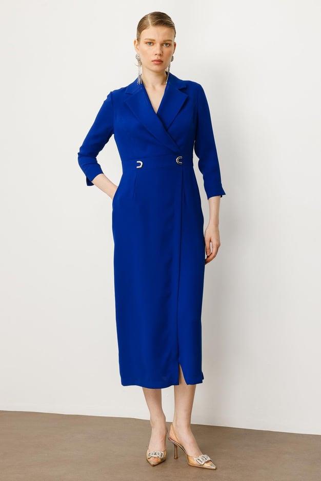 Aksesuarlar: Bel kısmında yer alan modern ve dikkat çekici metal toka detayları, elbiseye rafine bir şıklık katmaktadır.