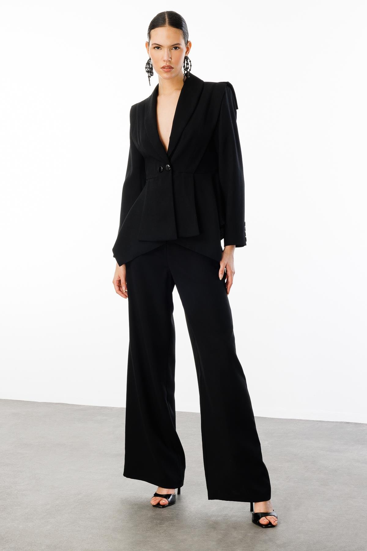 Kruvaze kesimli ceket, modern ve iddialı bir siluet sunarken, vücuda oturan kesimi feminen bir hava katar. Omuz detayları ve beldeki vurgu, cekete ayrı bir şıklık katarken, uyumlu pantolon takımı tamamlar. Bu takımı iş toplantılarında, özel davetlerde veya şık bir akşam yemeğinde tercih edebilirsiniz. Topuklu ayakkabılar ve zarif bir çantayla kombinleyerek şıklığınızı tamamlayabilirsiniz.