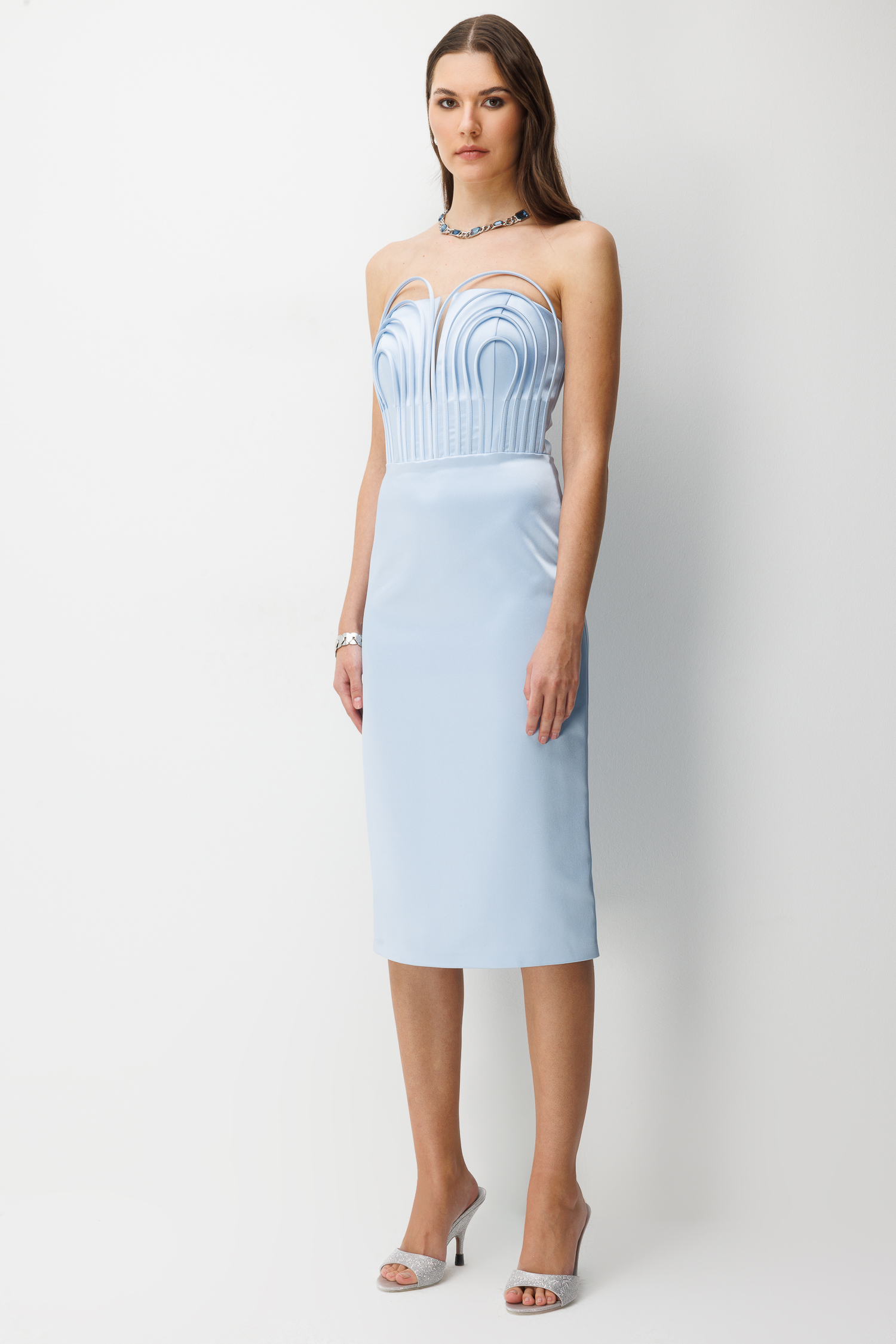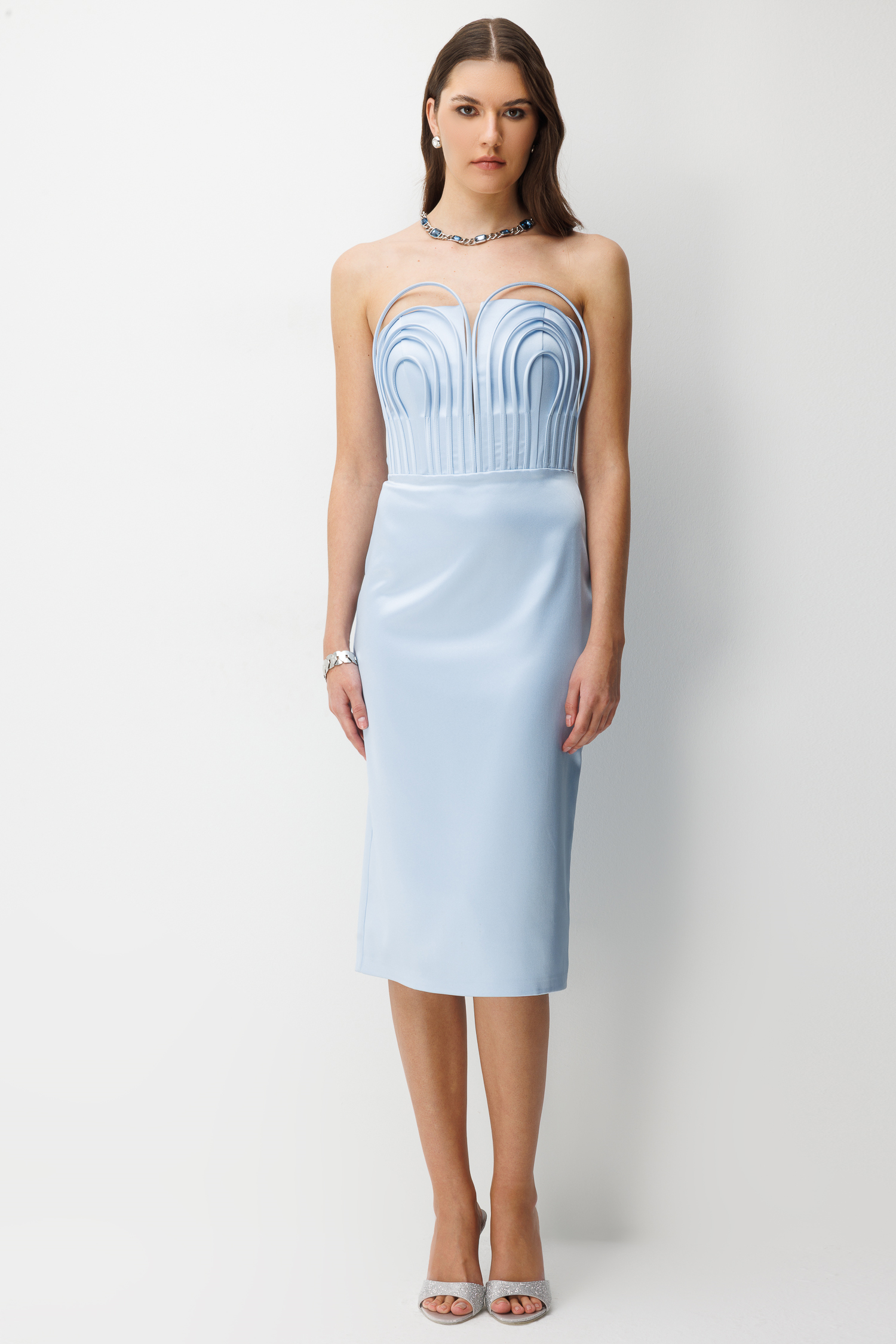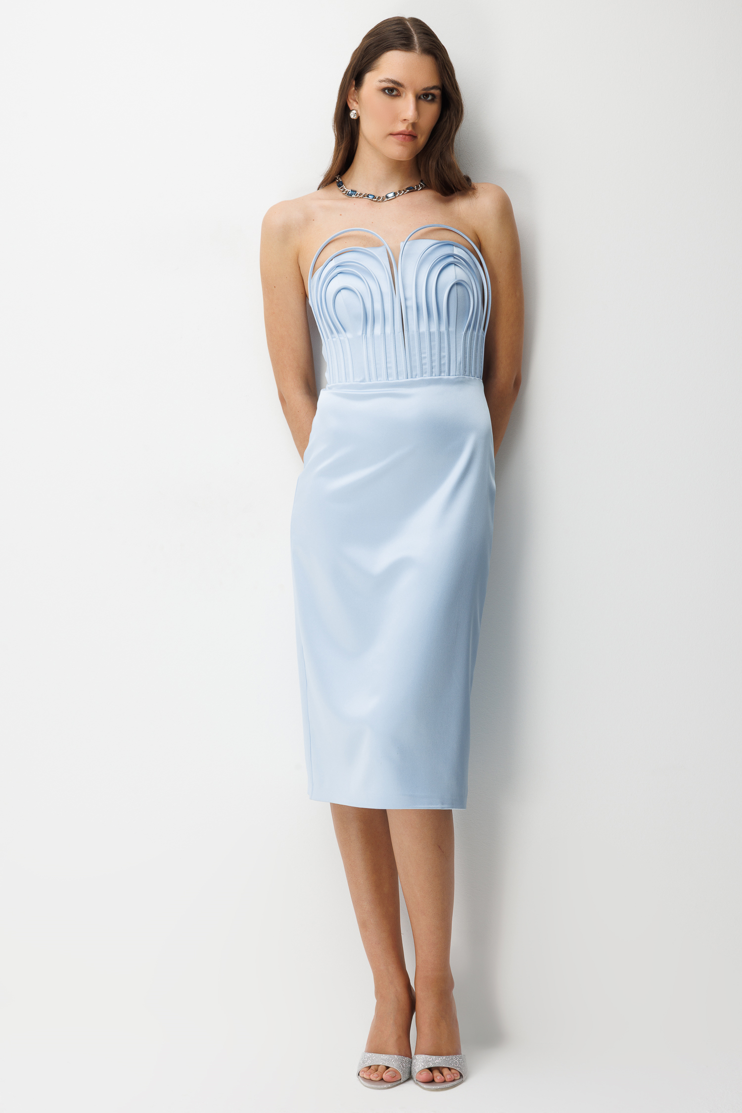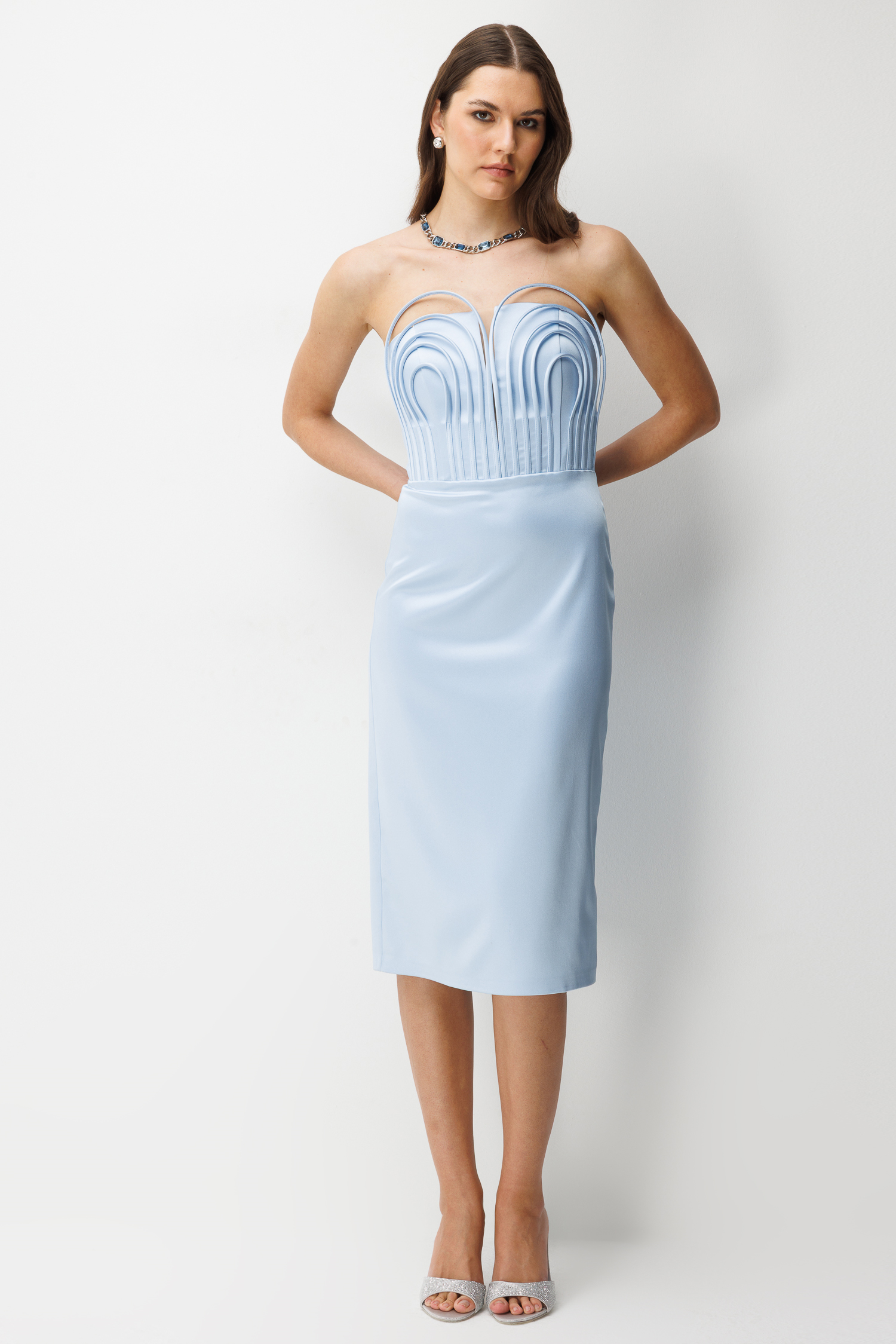 Özel günlerinizde tüm gözleri üzerinize çekecek, sofistike ve çarpıcı bir parça. Mavi rengindeki bu balenli midi boy straplez elbise, modern kesimi ve üst bedendeki dikkat çekici balen detaylarıyla silüetinizi kusursuzca şekillendirir.