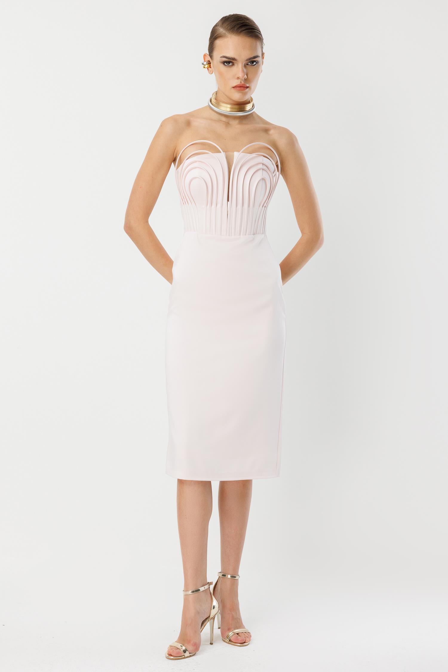 Özel günlerinizde tüm gözleri üzerinize çekecek, sofistike ve çarpıcı bir parça. Pudra rengindeki bu balenli midi boy straplez elbise, modern kesimi ve üst bedendeki dikkat çekici balen detaylarıyla silüetinizi kusursuzca şekillendirir.