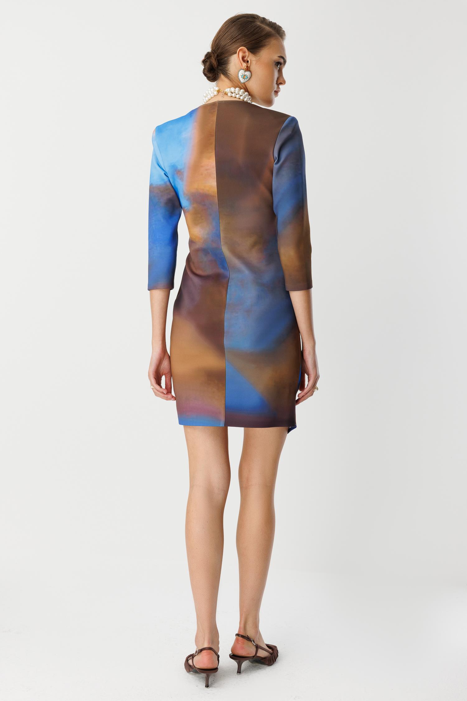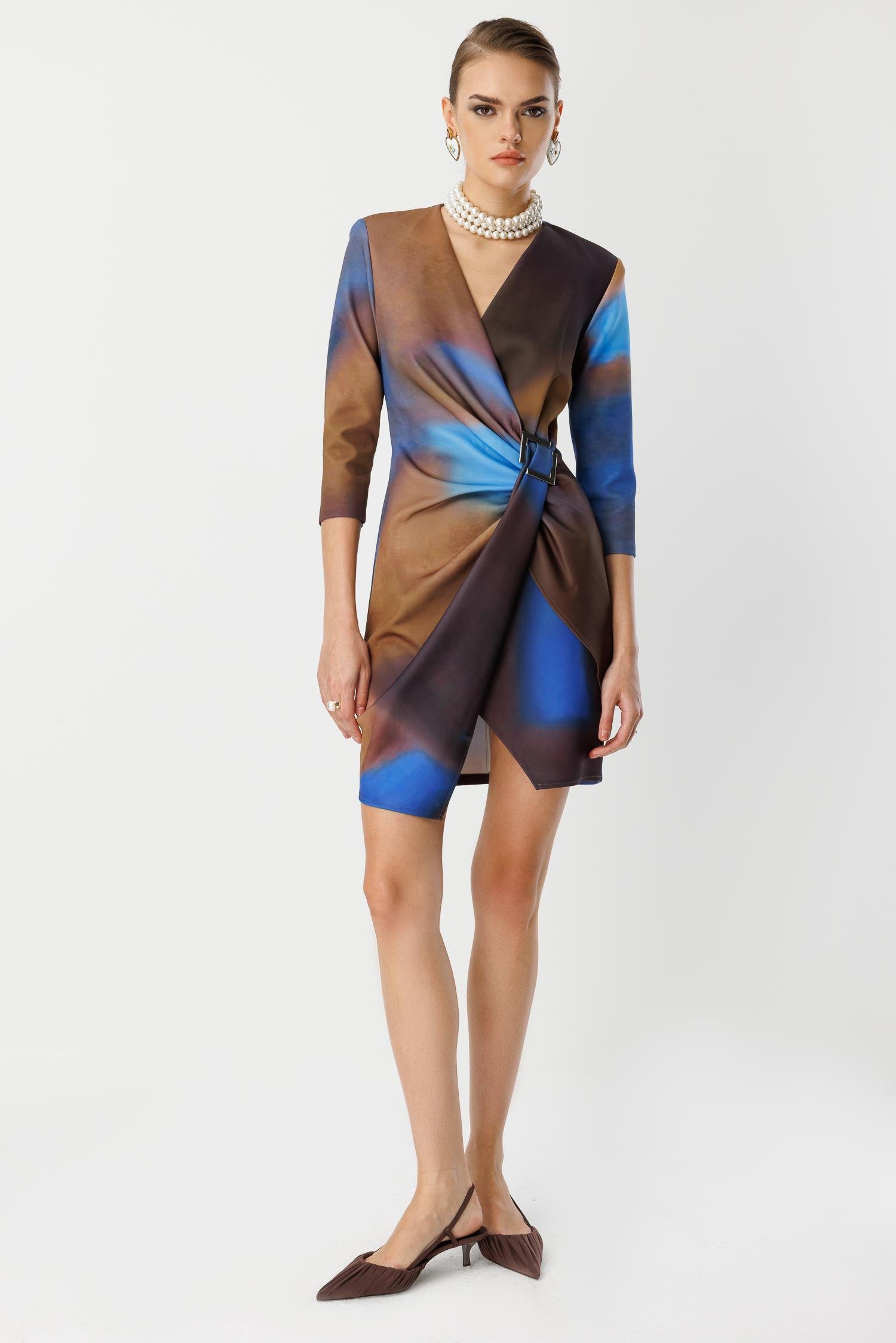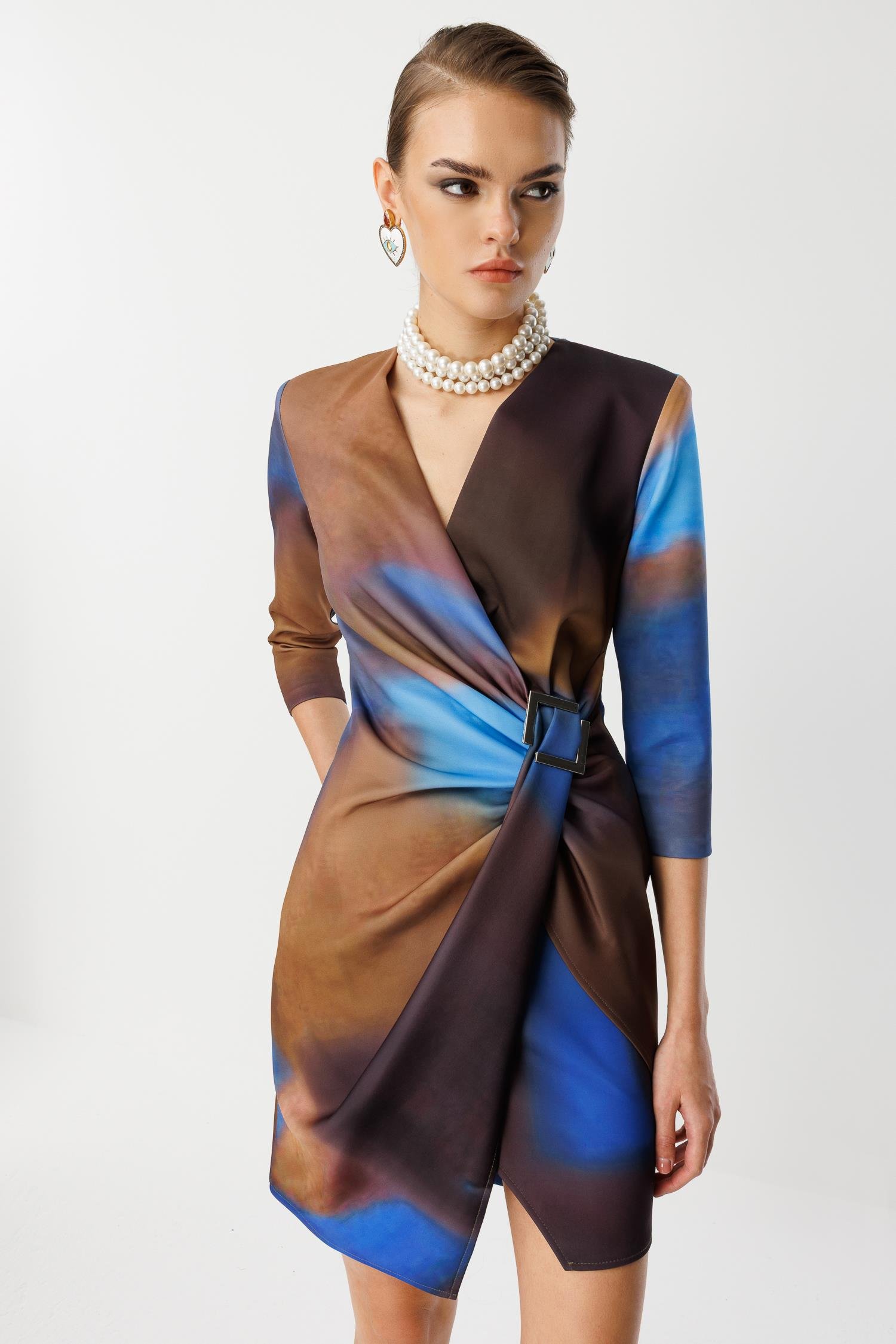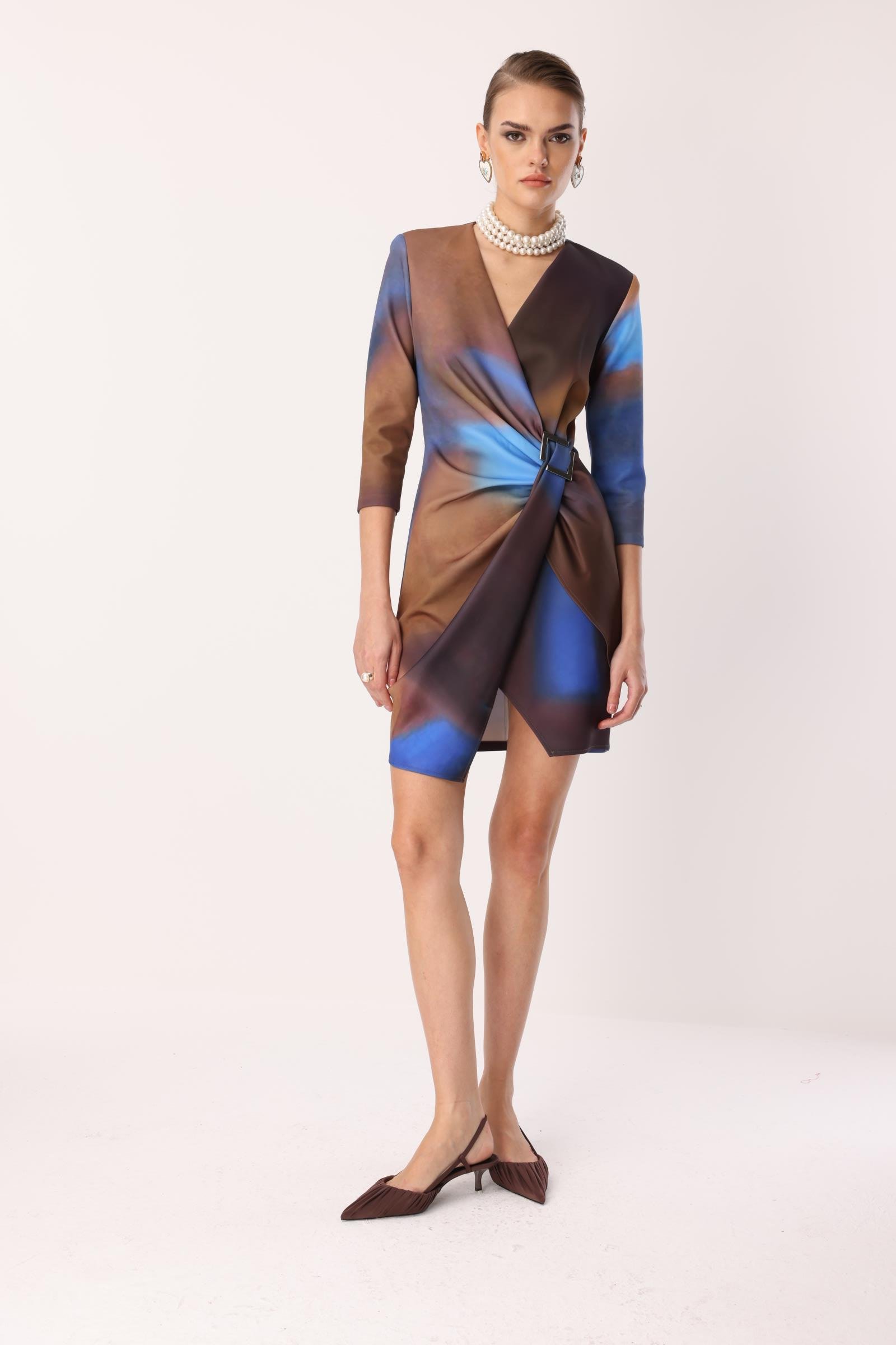 Şık kokteyller, özel iş yemekleri veya modern davetler için tasarlanmış, iddialı ve sanatsal bir model. Mavi ve kahverengi tonlarındaki fırça darbelerini anımsatan soyut deseni, kruvaze kesim ve toka detaylarıyla birleşerek dinamik bir silüet yaratır.
