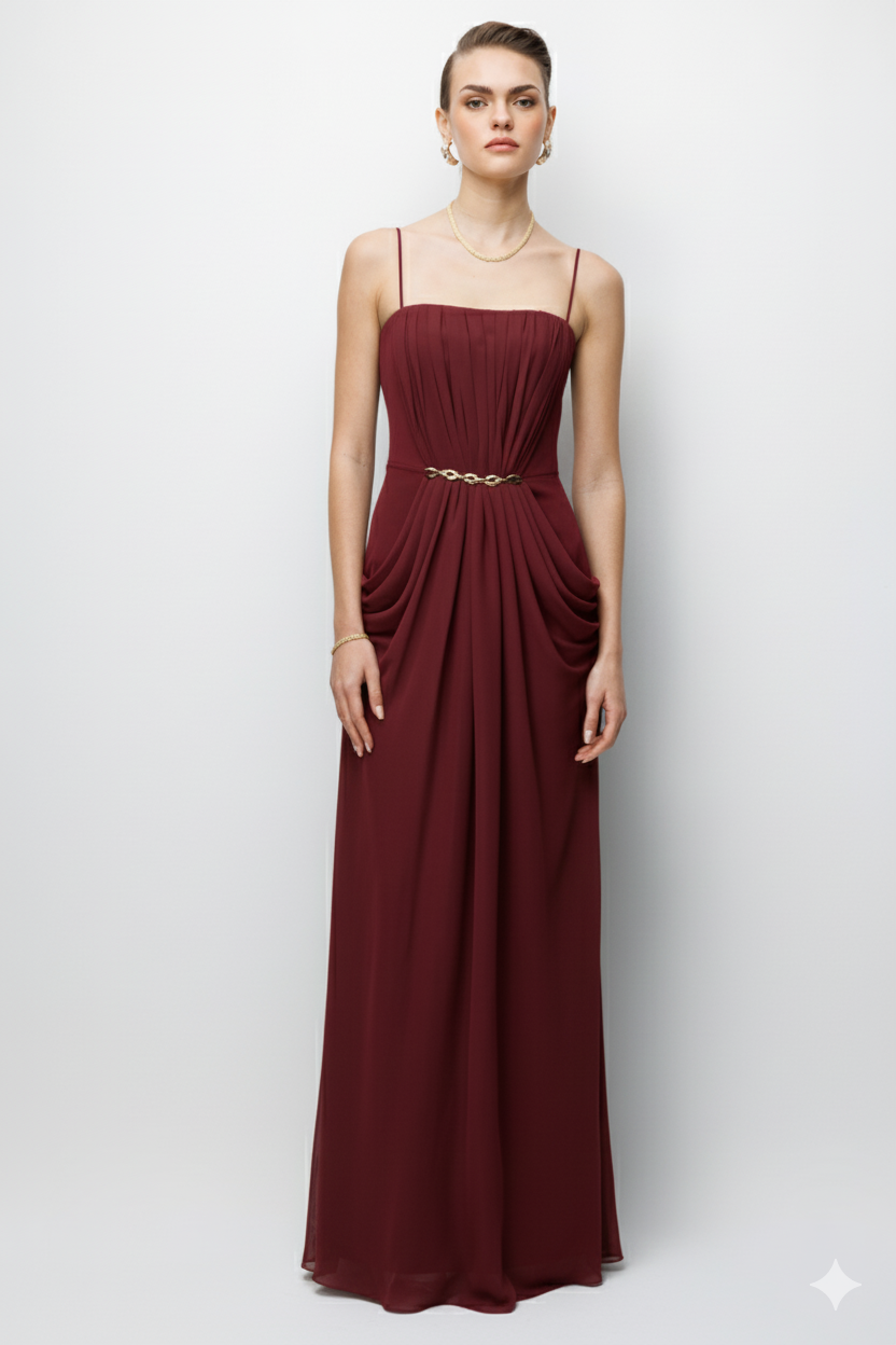 Tasarımın lüks odak noktası Bel Aksesuar Detayı'dır. Bu özel detay, drapelerin kesişim noktasında yer alarak beli ince gösterir ve elbiseye bir mücevher etkisi katar. Aksesuar, tasarımı tamamlayarak başka bir takıya ihtiyaç bırakmaz ve kıyafete imza niteliğinde bir dokunuş ekler. Elbisenin genel akıcı ve toparlayıcı yapısı, size kendinden emin ve kusursuz bir görünüm sağlar.