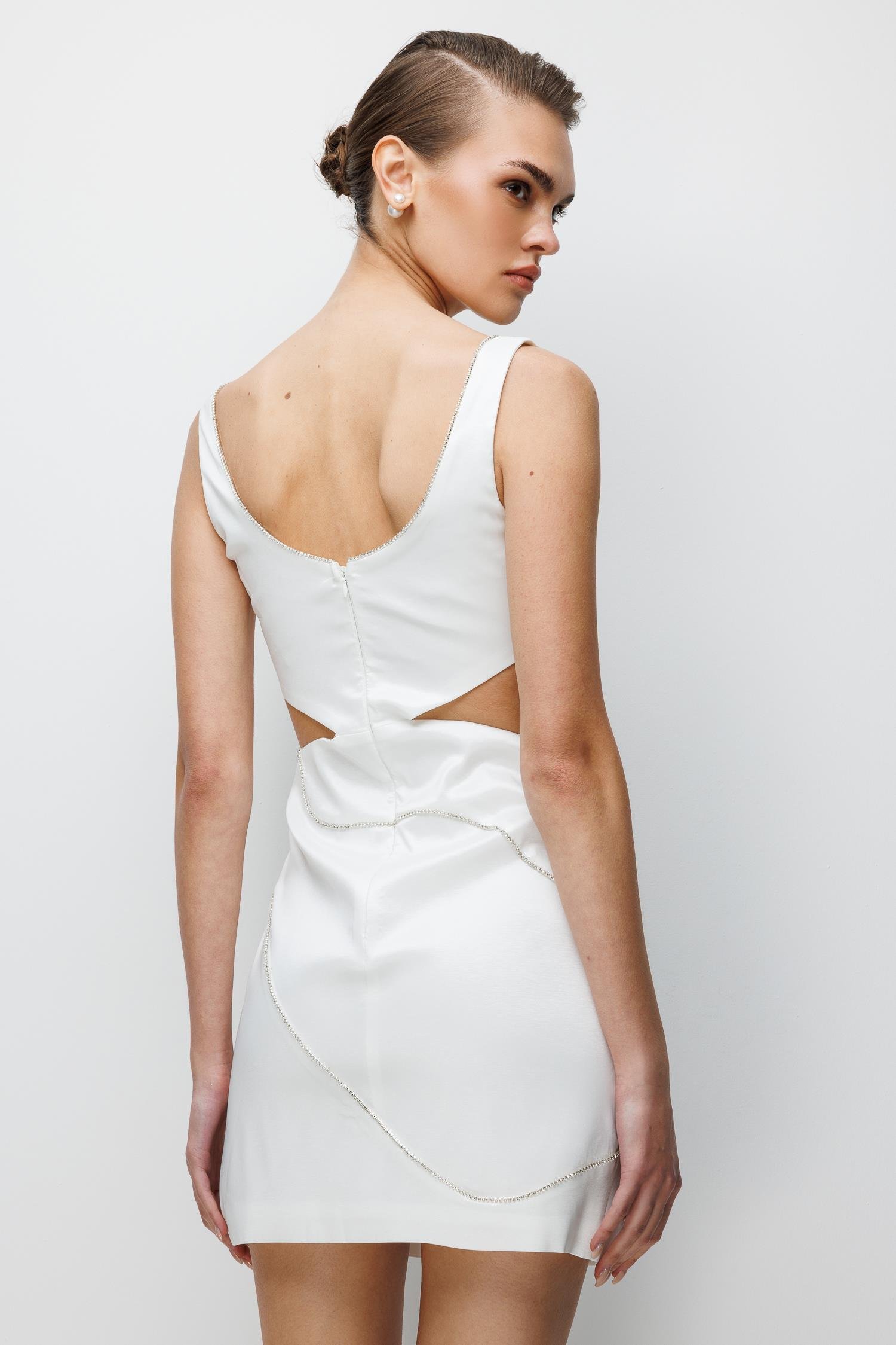 Bu Nefeli elbisesi, modern ve iddialı bir silüet arayanlar için tasarlandı. Ekru rengin masum ve asil dokusu, tasarımın cüretkar kesimleriyle çarpıcı bir tezat oluşturur. Elbisenin hatları saran Mini Boy kesimi, dinamik bir enerji verirken, vücudu toparlayan kaliteli kumaşı kusursuz bir görünüm sağlar.