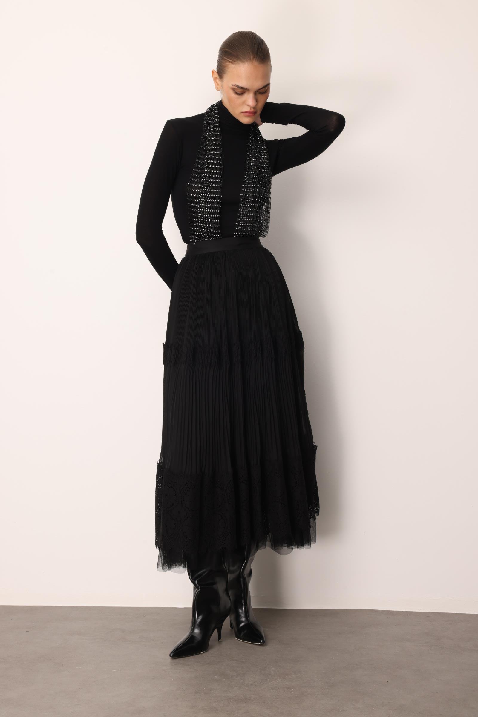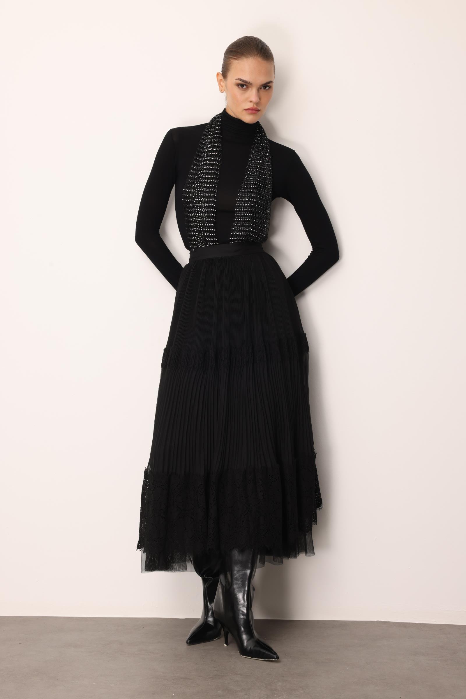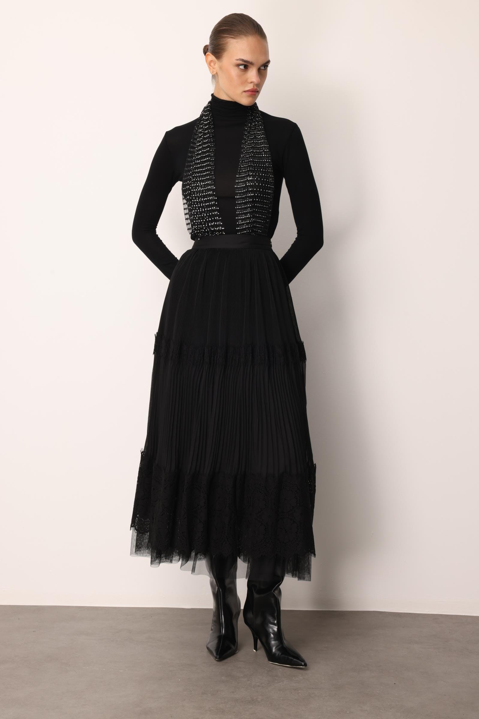 Zarafet ve dramanın buluştuğu nokta. Bu siyah maksi etek, katmanlı tül yapısı ve etek ucundaki zengin dantel işlemeleriyle hareketli ve sofistike bir silüet yaratıyor. Klasik siyah rengiyle her kombine anında lüks bir doku katın.