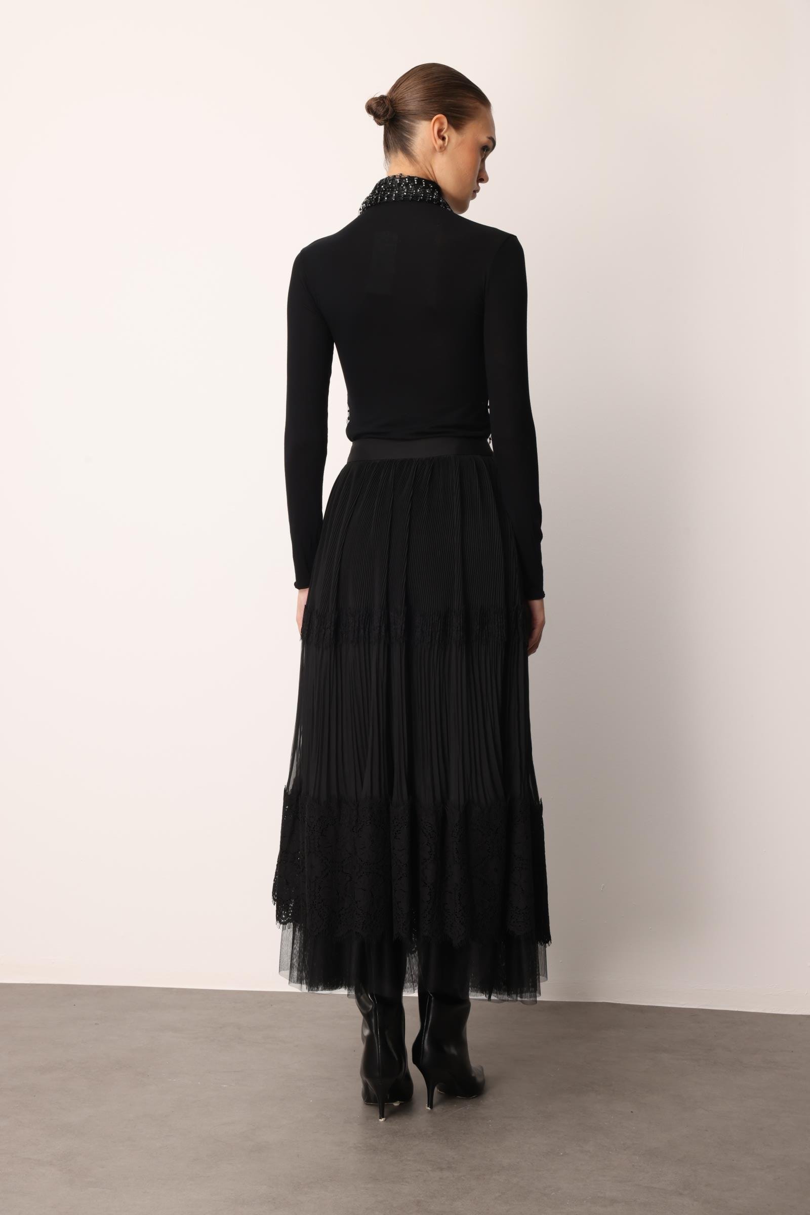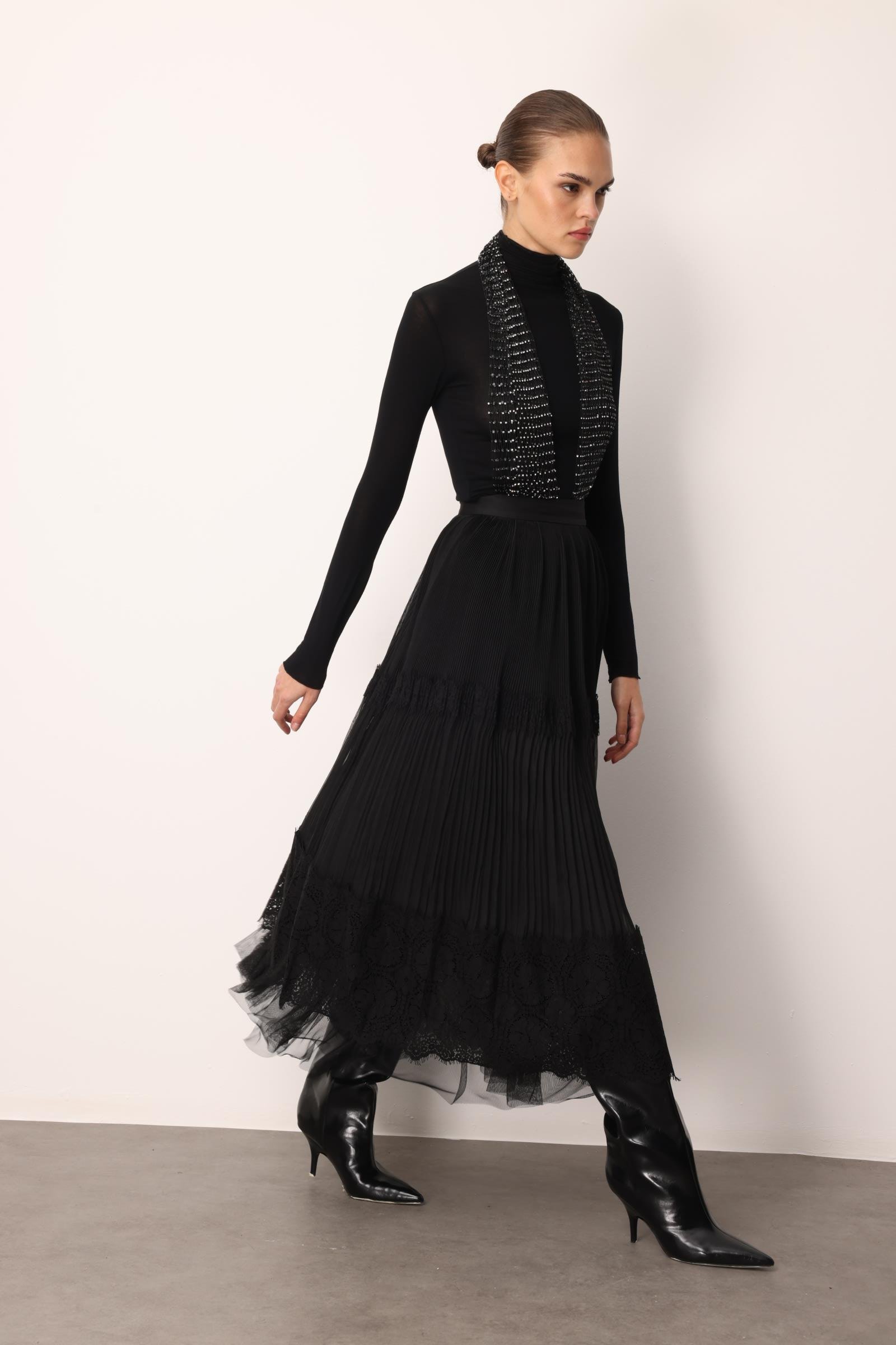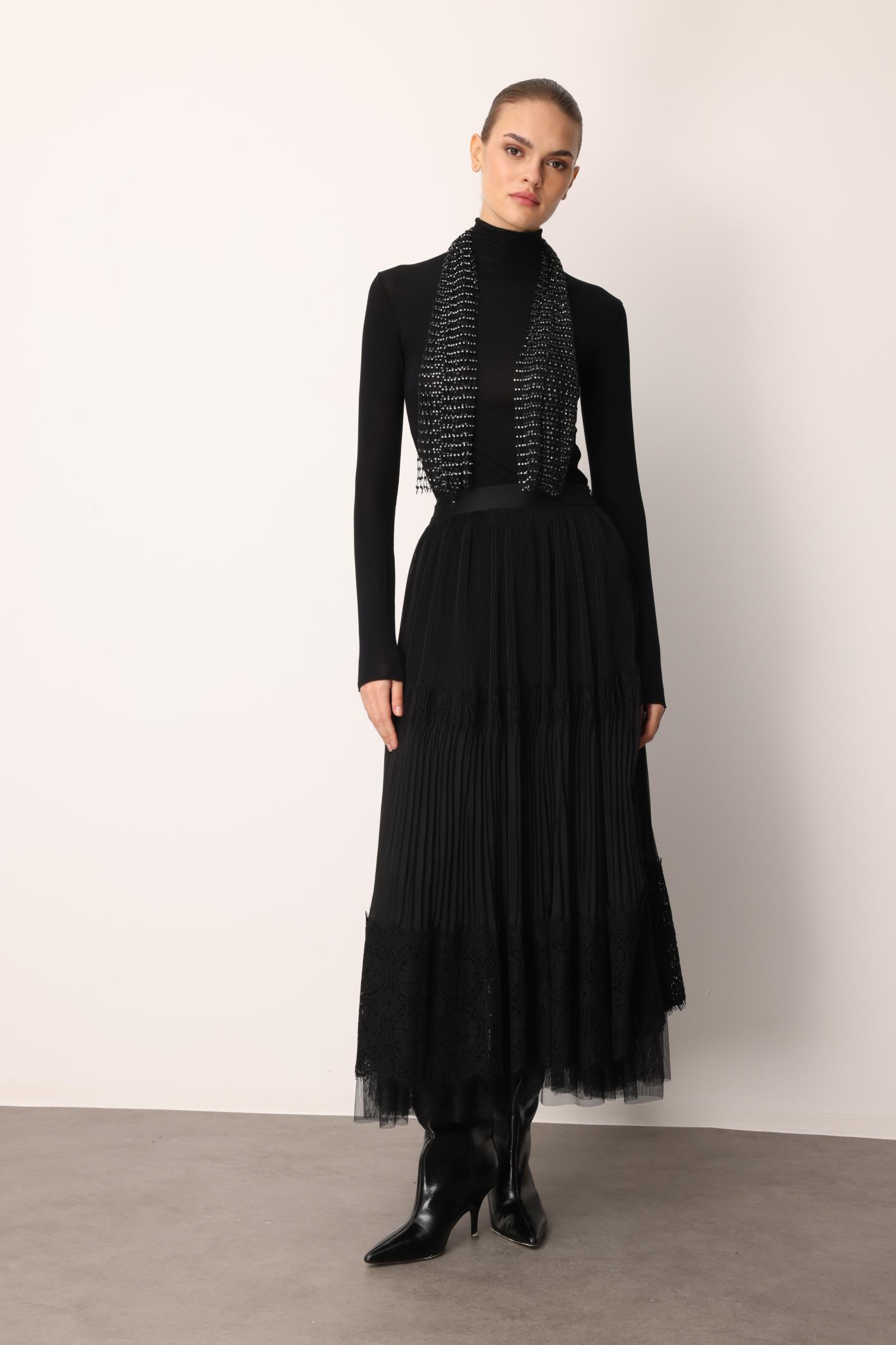 Zarafet ve dramanın buluştuğu nokta. Bu siyah maksi etek, katmanlı tül yapısı ve etek ucundaki zengin dantel işlemeleriyle hareketli ve sofistike bir silüet yaratıyor. Klasik siyah rengiyle her kombine anında lüks bir doku katın.