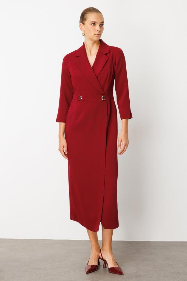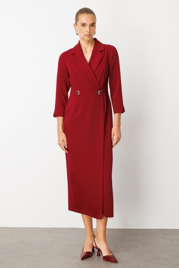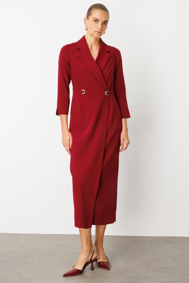 Tasarım Detayları: Saten biyeli yaka ve etek ucu, beli vurgulayan tok kumaş kemer, dik yaka yırtmacı.