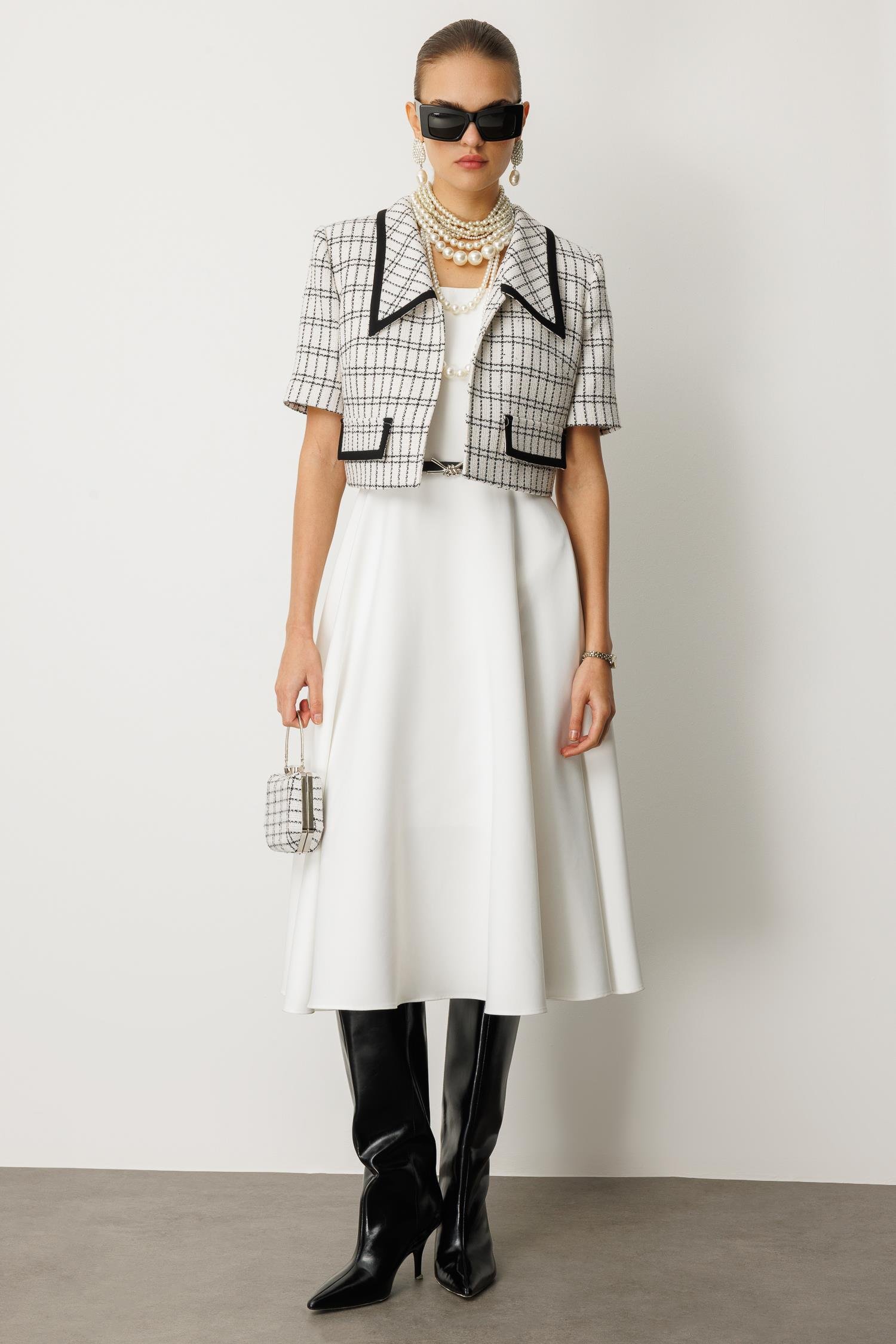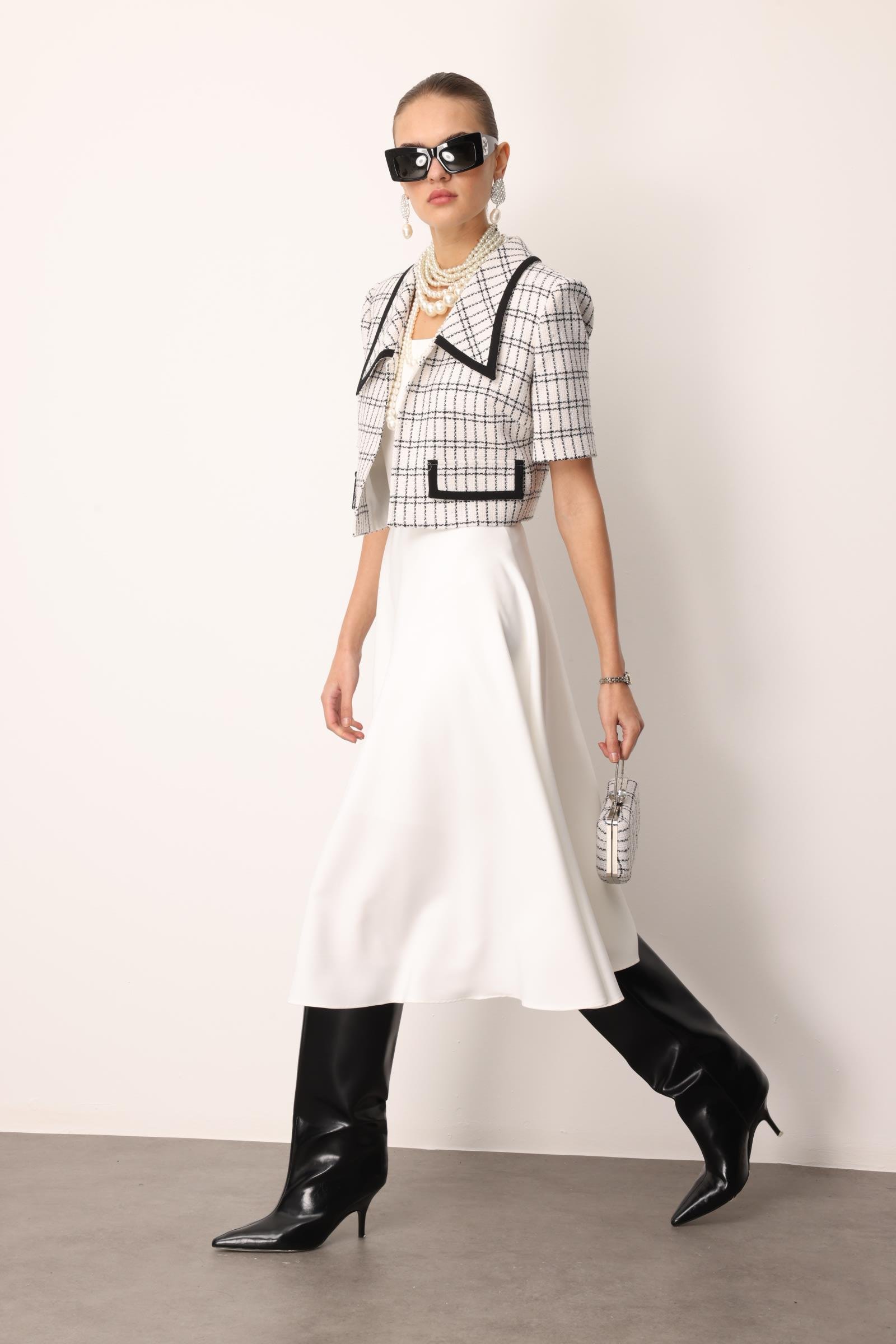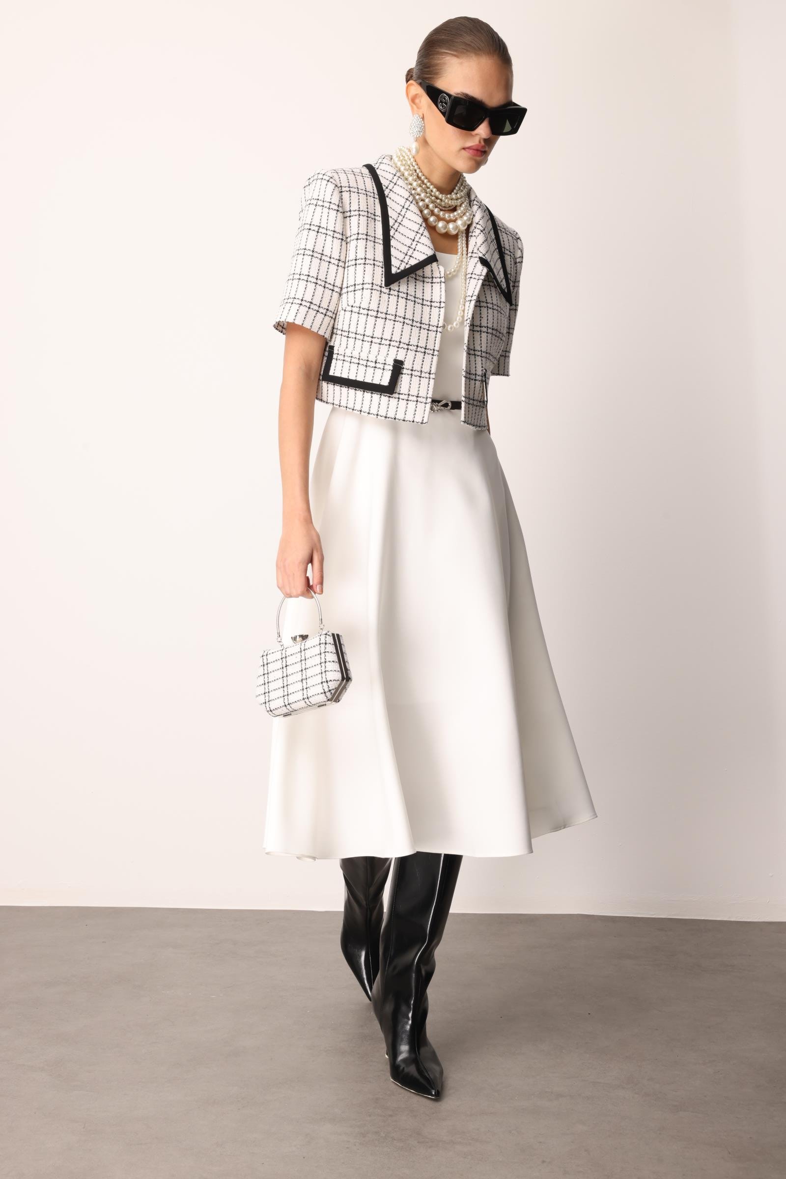 Mini Ceket: Siyah-beyaz Pötikare desenli, kısa ve crop kesim ceket. Yaka, ön kısım ve cep kapaklarında kullanılan kontrast beyaz biye detayları, ceketin keskin ve modern duruşunu vurgular. Kısa kol boyu, hareket özgürlüğü ve şık bir silüet sağlar.