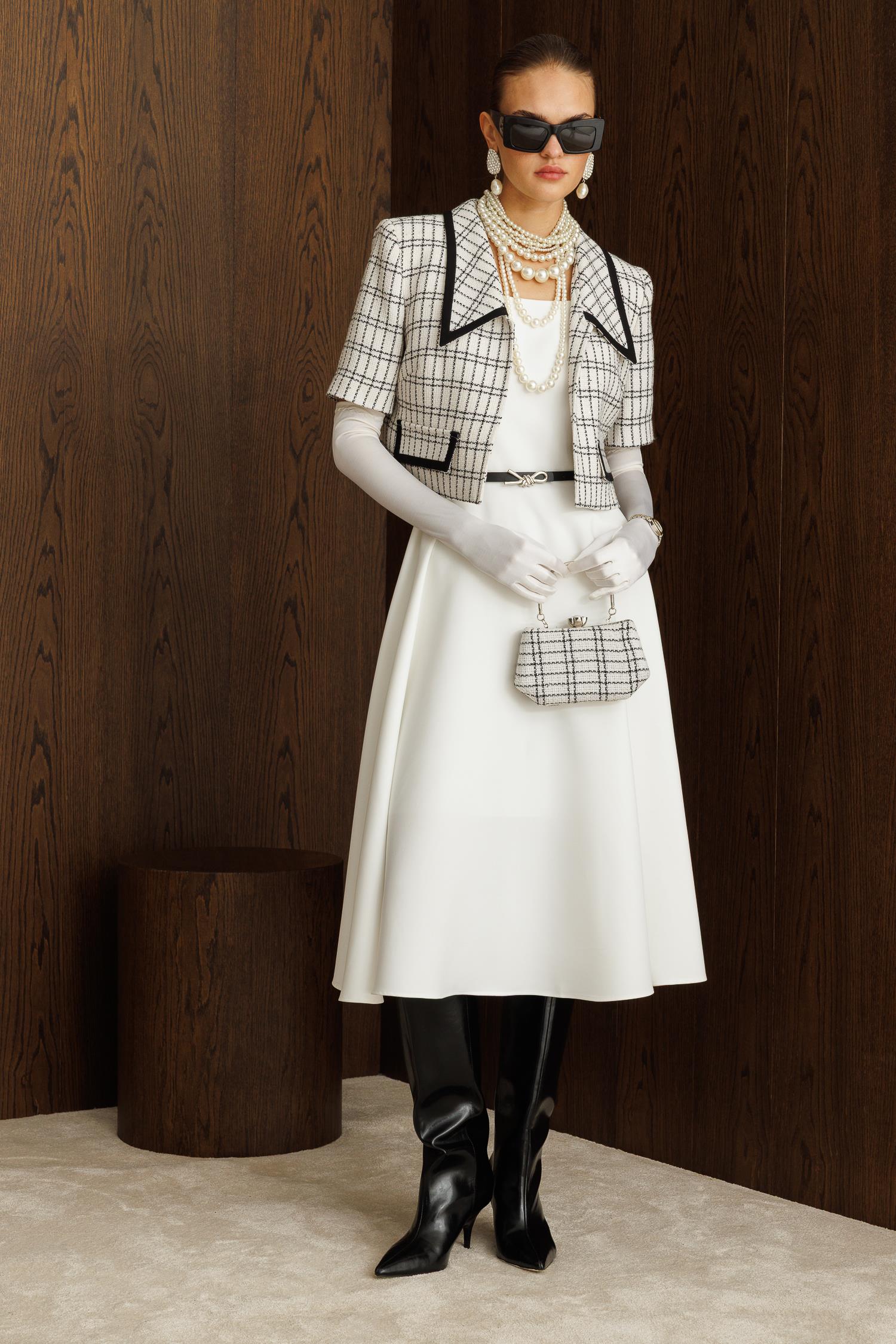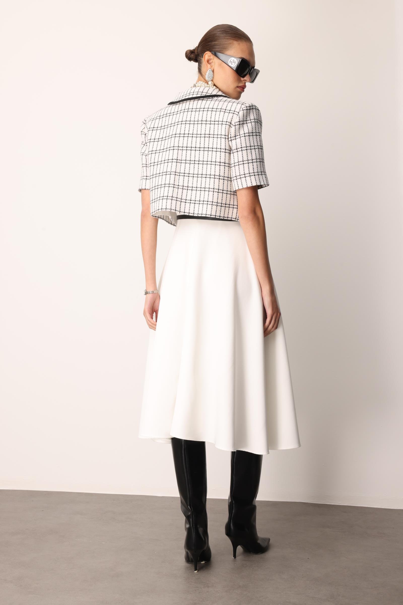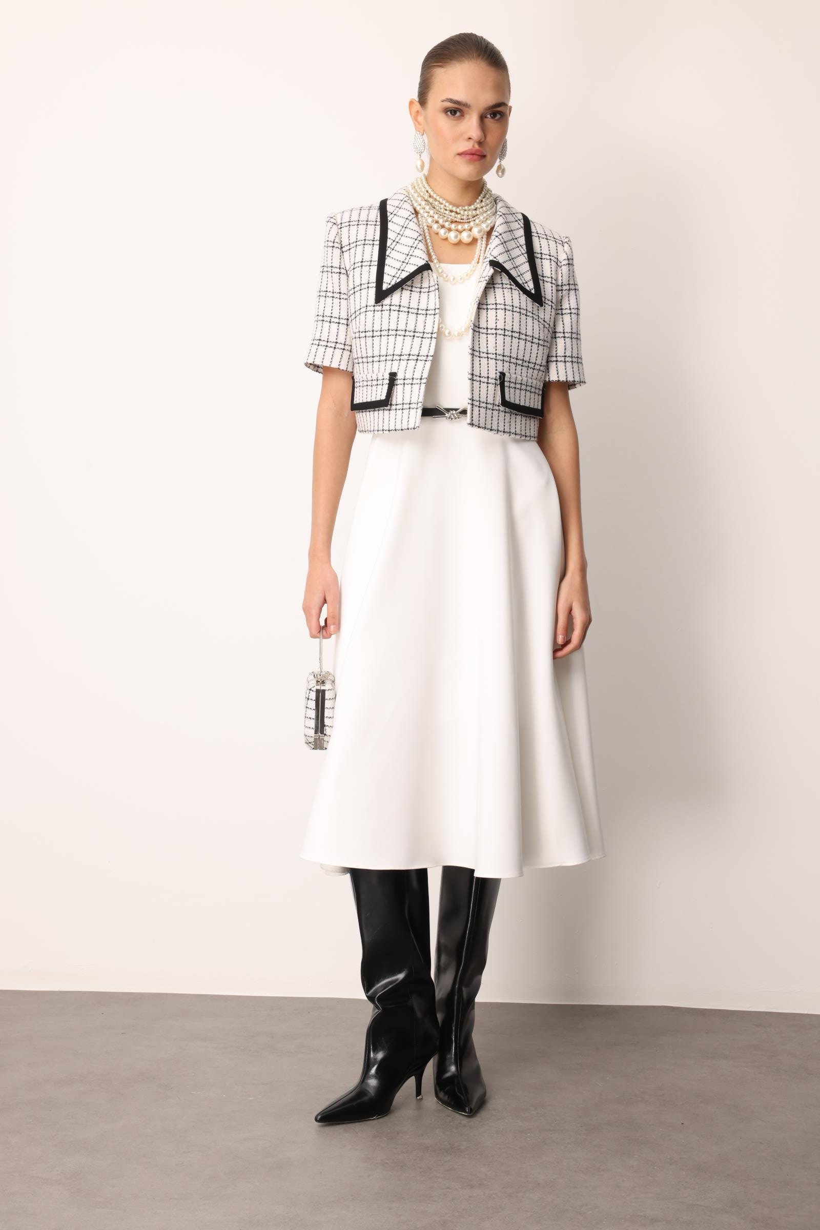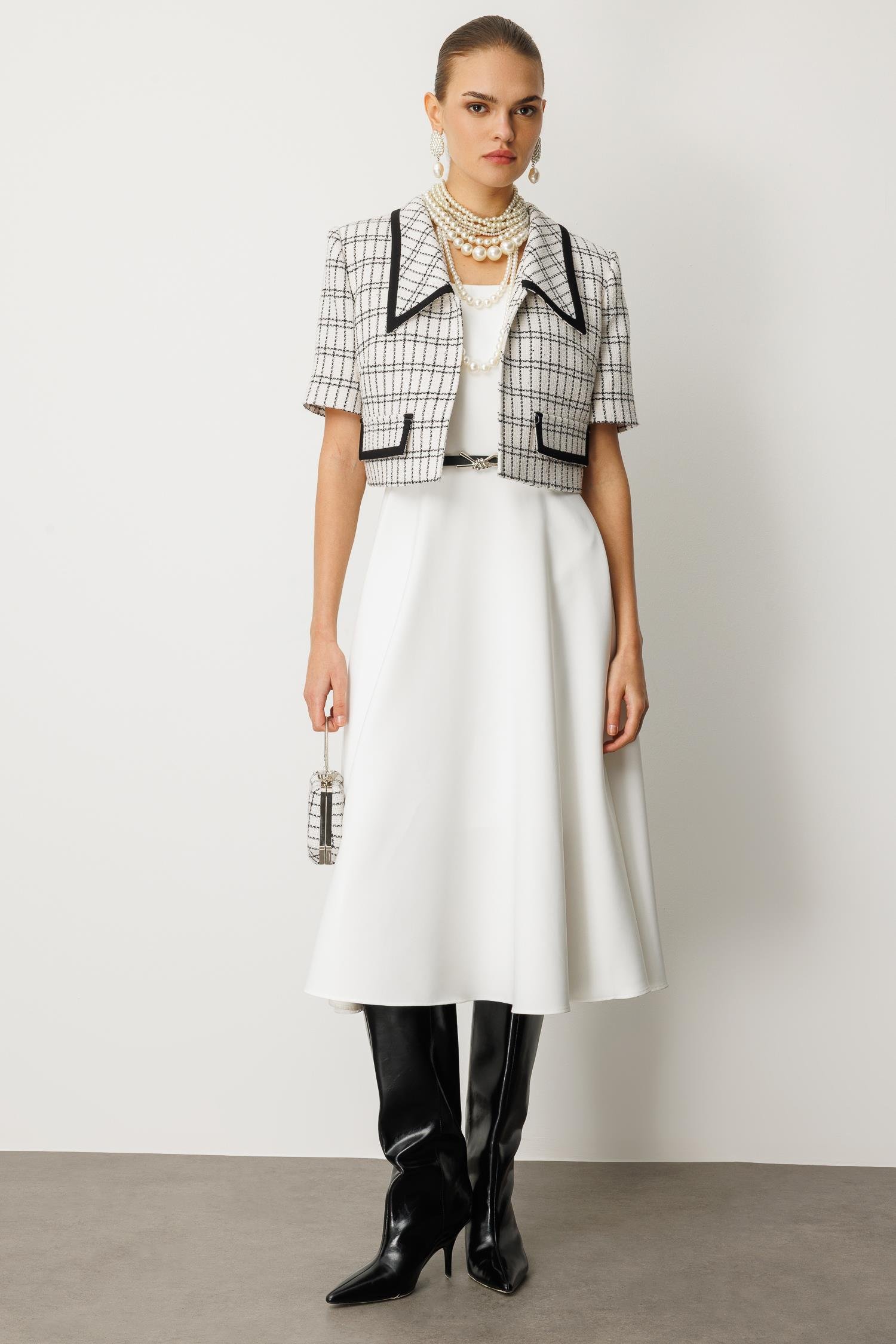 Mini Ceket: Siyah-beyaz Pötikare desenli, kısa ve crop kesim ceket. Yaka, ön kısım ve cep kapaklarında kullanılan kontrast beyaz biye detayları, ceketin keskin ve modern duruşunu vurgular. Kısa kol boyu, hareket özgürlüğü ve şık bir silüet sağlar.