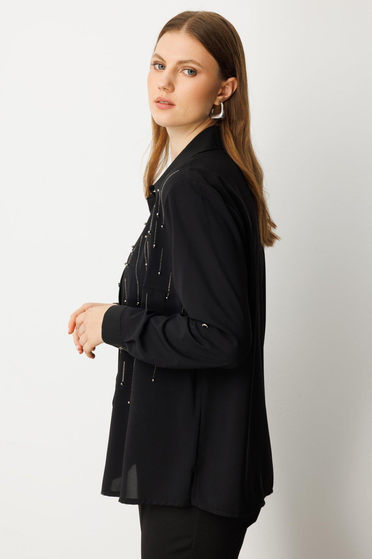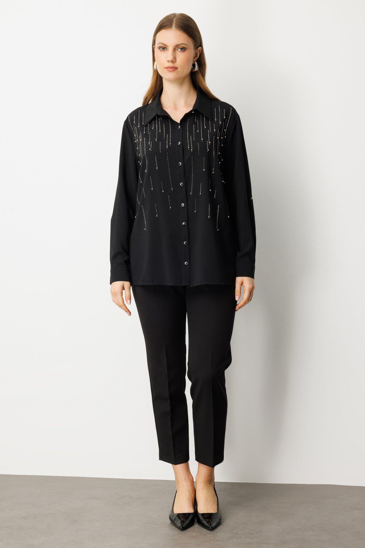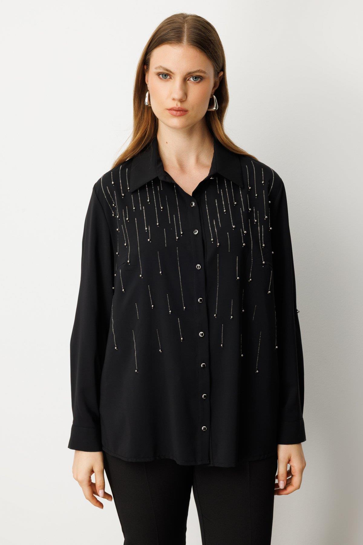 Önü Taşlı Boncuklu Büyük Beden Bluz Siyah (26KEKL3983-002)