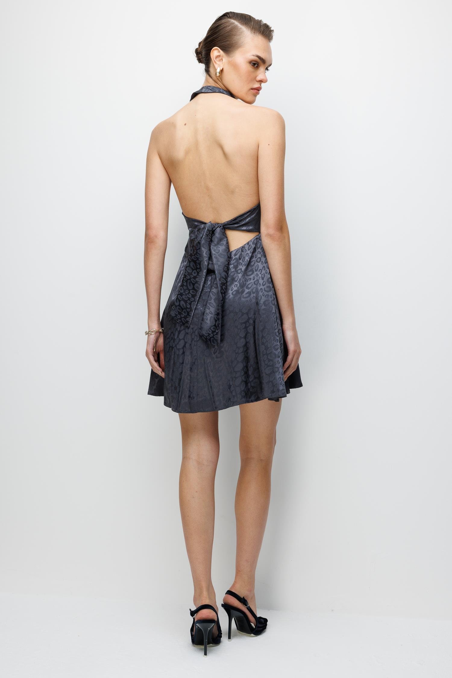 Elbisenin en çarpıcı detayı Boyuna Bağlamalı tasarımıdır. Bu sofistike detay, omuzları ve sırt hattını zarifçe açıkta bırakarak anında göz alıcı bir silüet oluşturur. Mini boy kesimi, enerjik bir duruş sunarken, Antrasit'in zamansız tonu, onu her mevsime ve her davete uyum sağlayan, vazgeçilmez bir lüks parçaya dönüştürür.