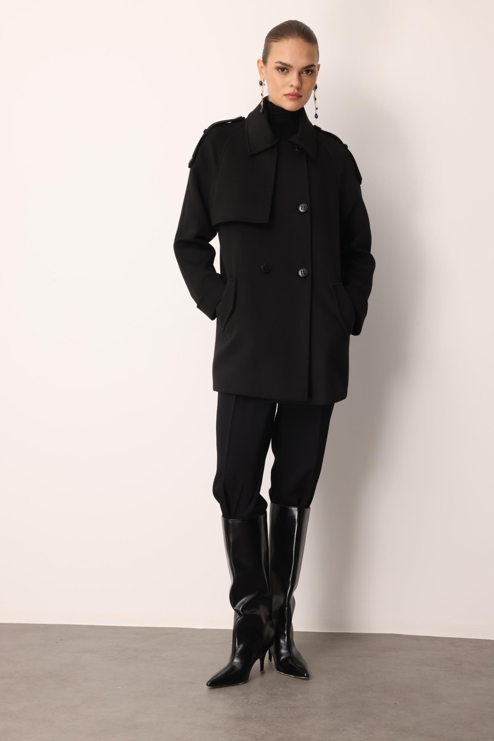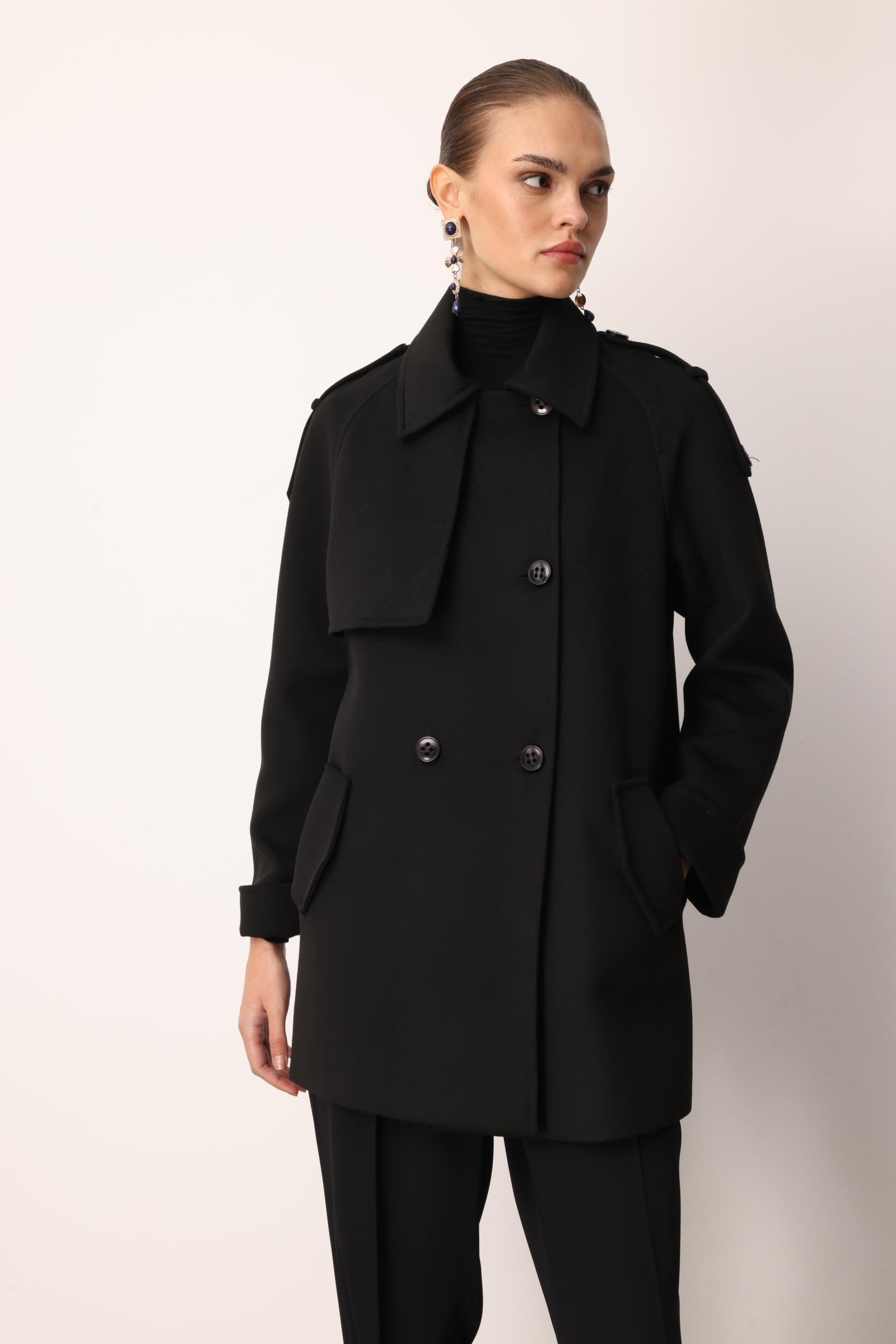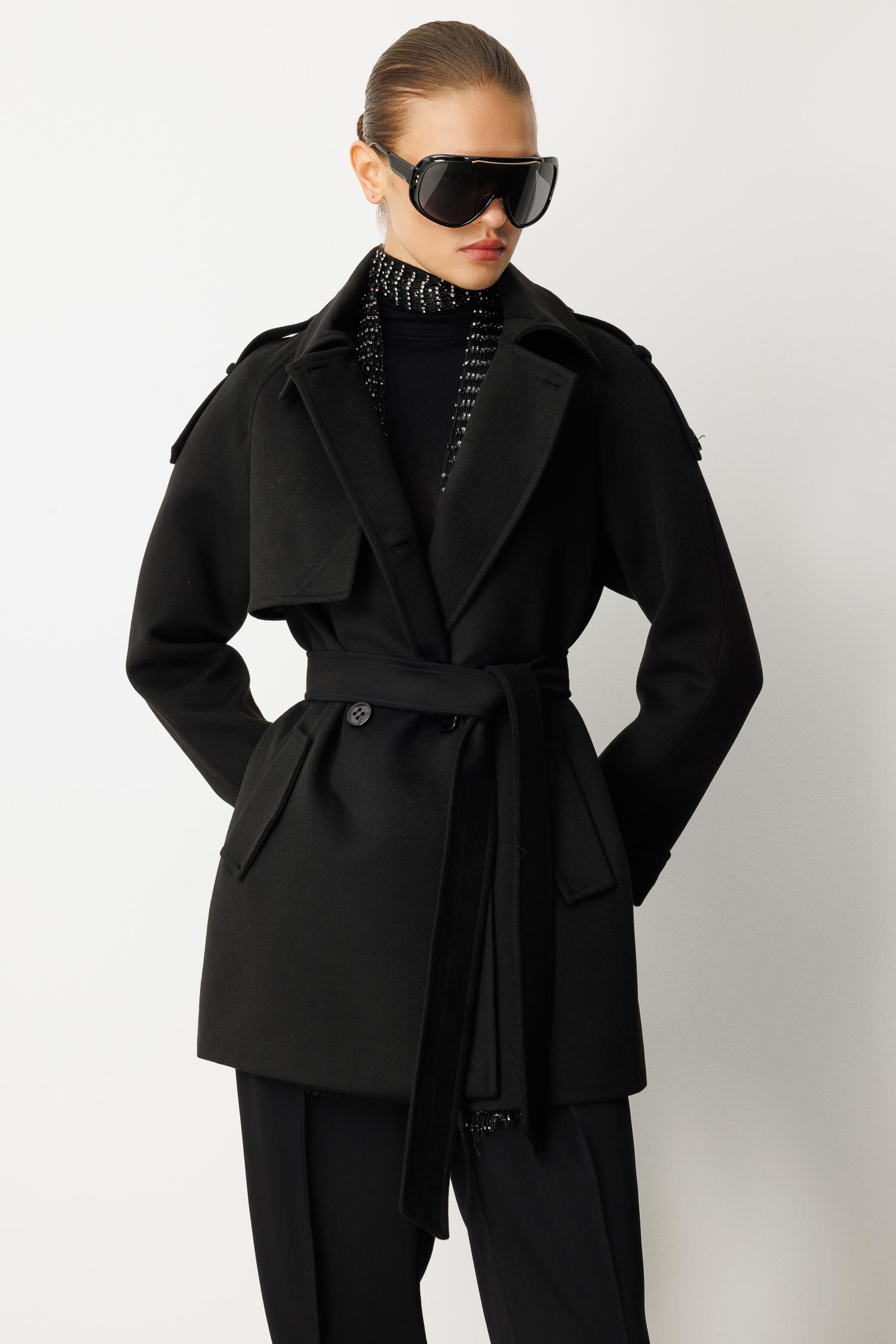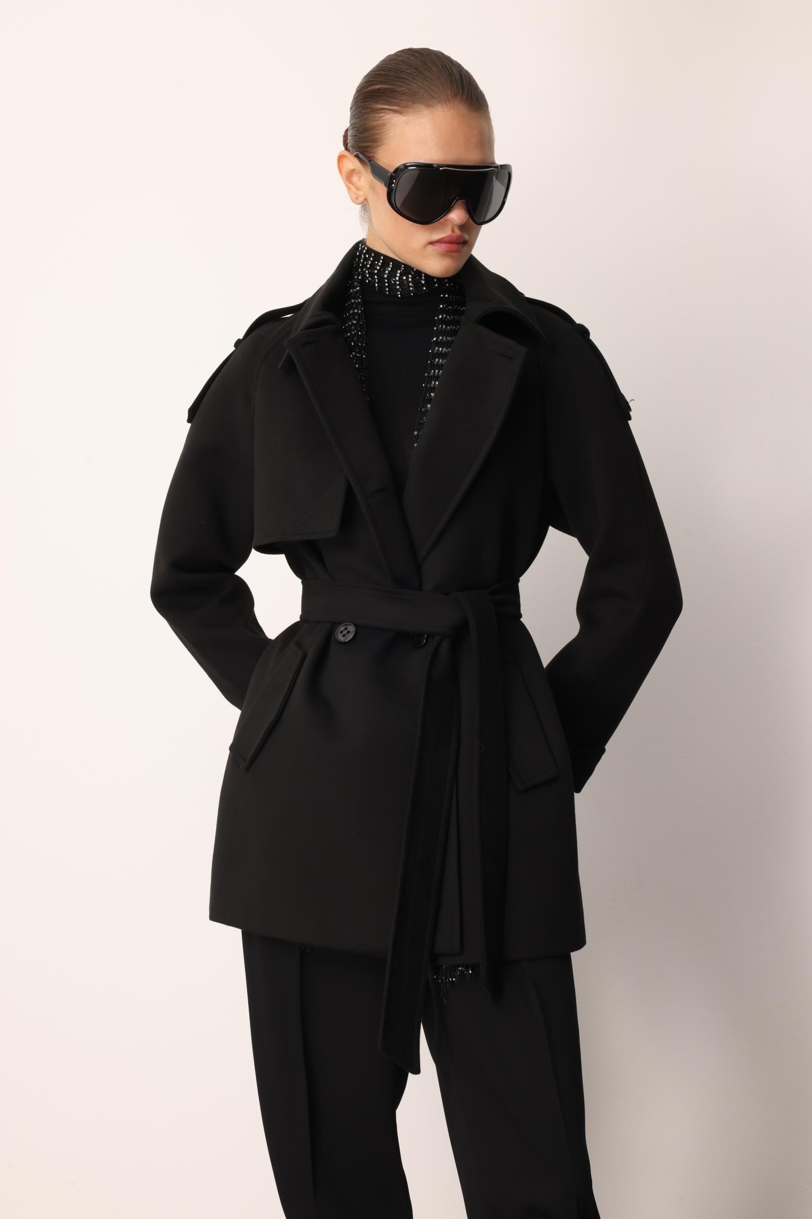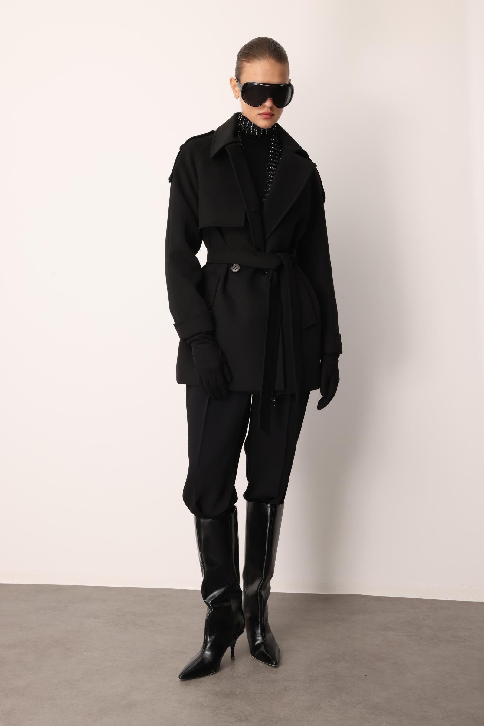 Gardırobunuzun en şık kışlık yatırımı. Klasik trençkot detaylarını modern, kısa bir kesimle birleştiren bu siyah kaşe kaban, kış aylarında stilinizden ödün vermeden sıcak kalmanızı sağlar. Kuşak detayı, vücut hatlarınızı zarifçe vurgulayarak güçlü bir silüet yaratır.