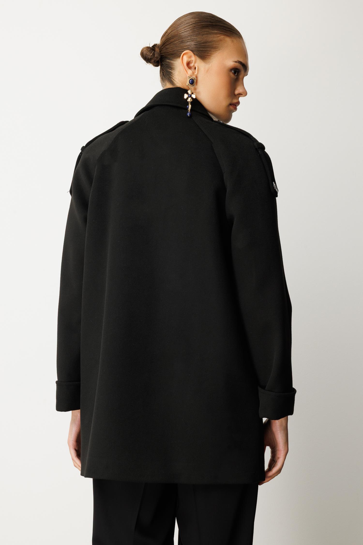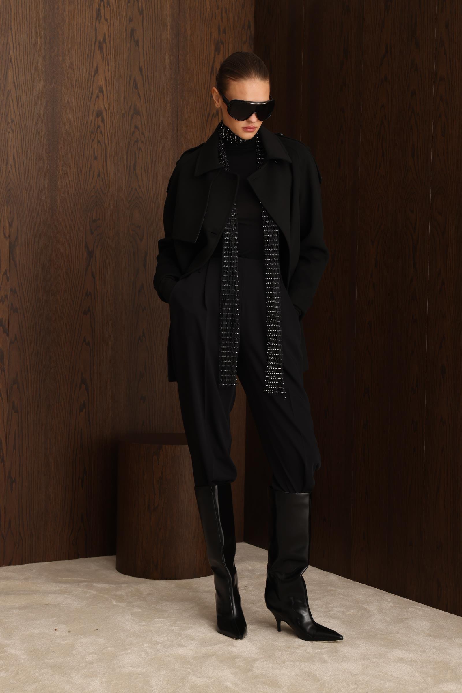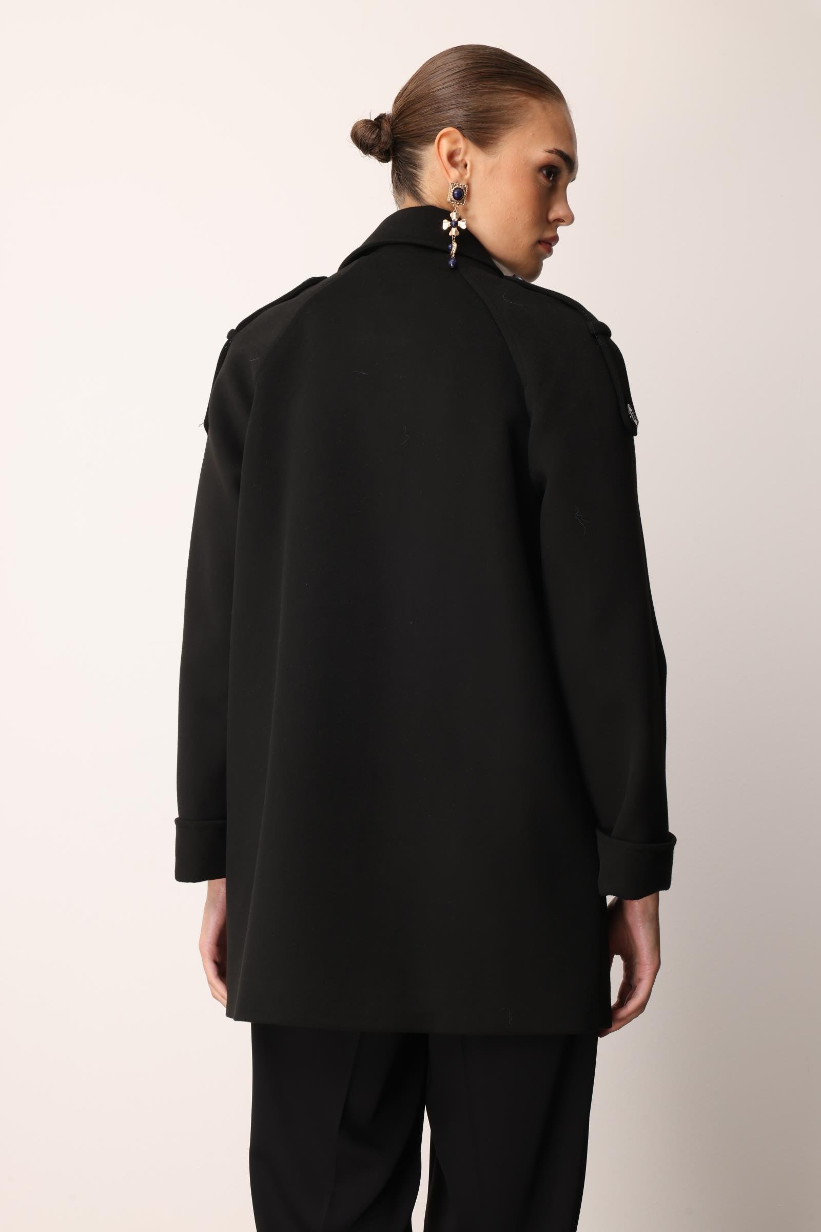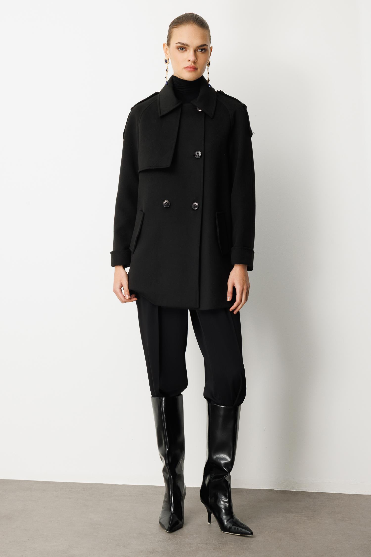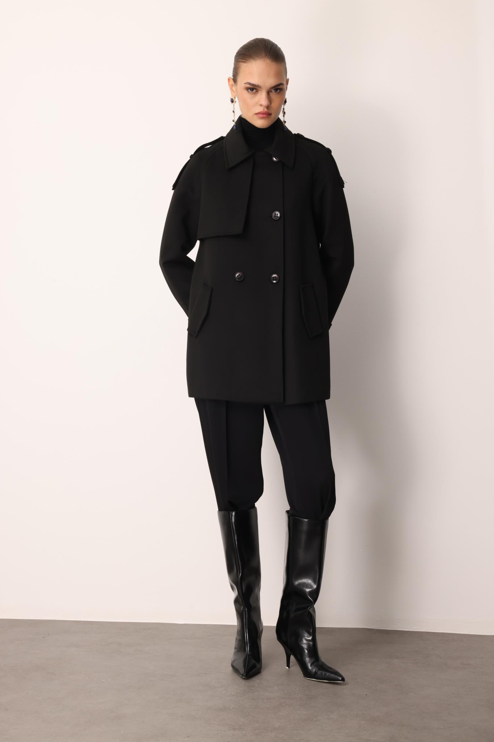 Gardırobunuzun en şık kışlık yatırımı. Klasik trençkot detaylarını modern, kısa bir kesimle birleştiren bu siyah kaşe kaban, kış aylarında stilinizden ödün vermeden sıcak kalmanızı sağlar. Kuşak detayı, vücut hatlarınızı zarifçe vurgulayarak güçlü bir silüet yaratır.