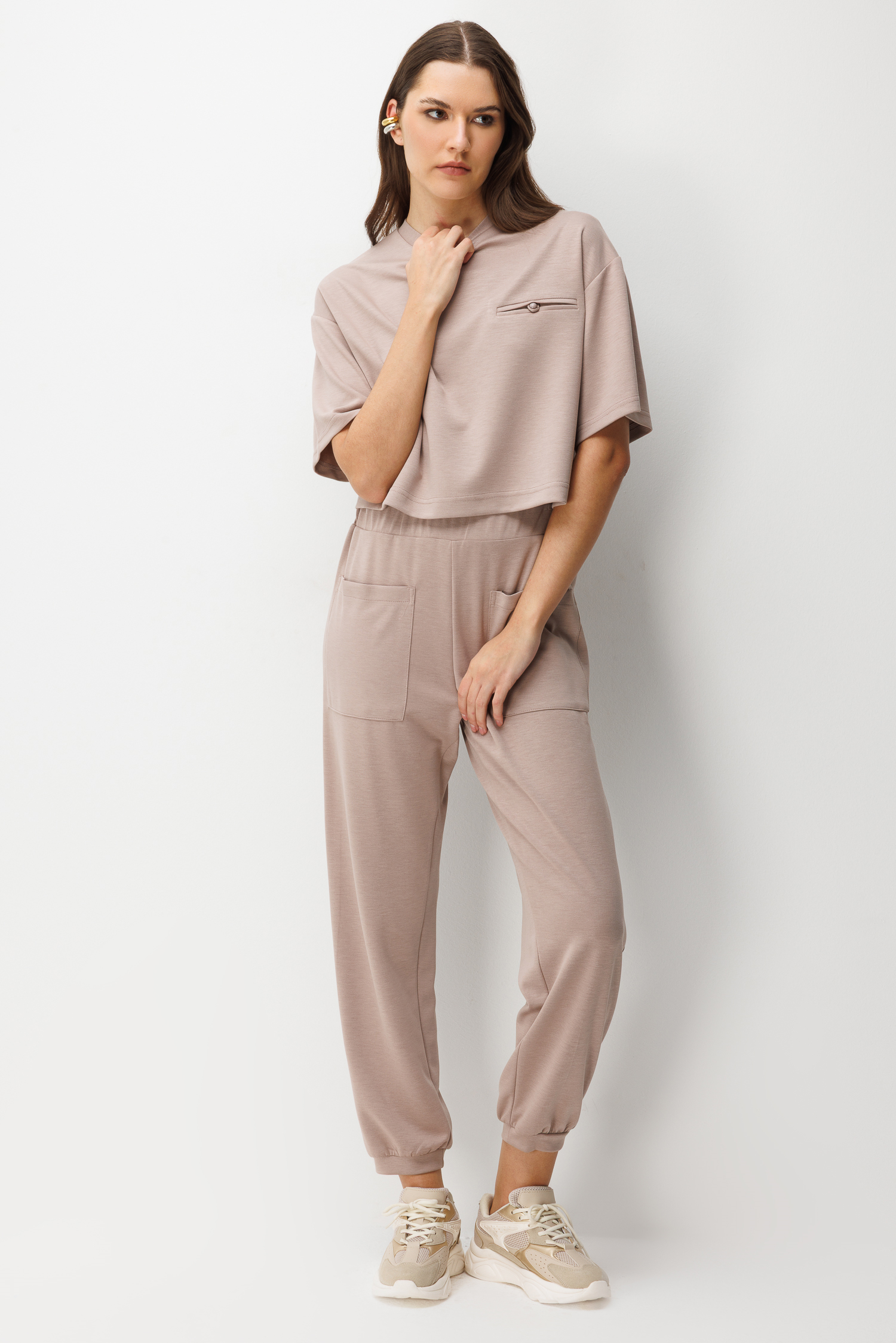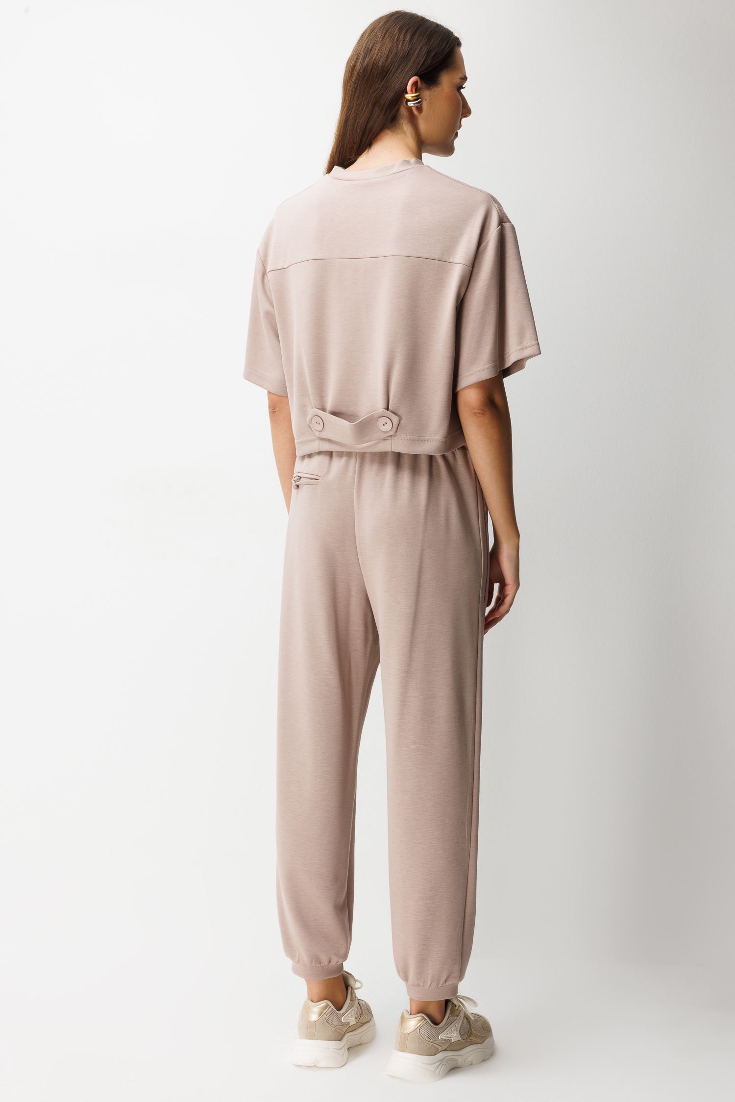Takımın üst kısmı, rahat kesimi ve şık düğme detaylarıyla dikkat çekiyor. Arka kısmındaki düğmeli parça, tasarıma özgün bir hava katarken, pantolonun rahat kesimi gün boyu konforlu bir kullanım sunar.