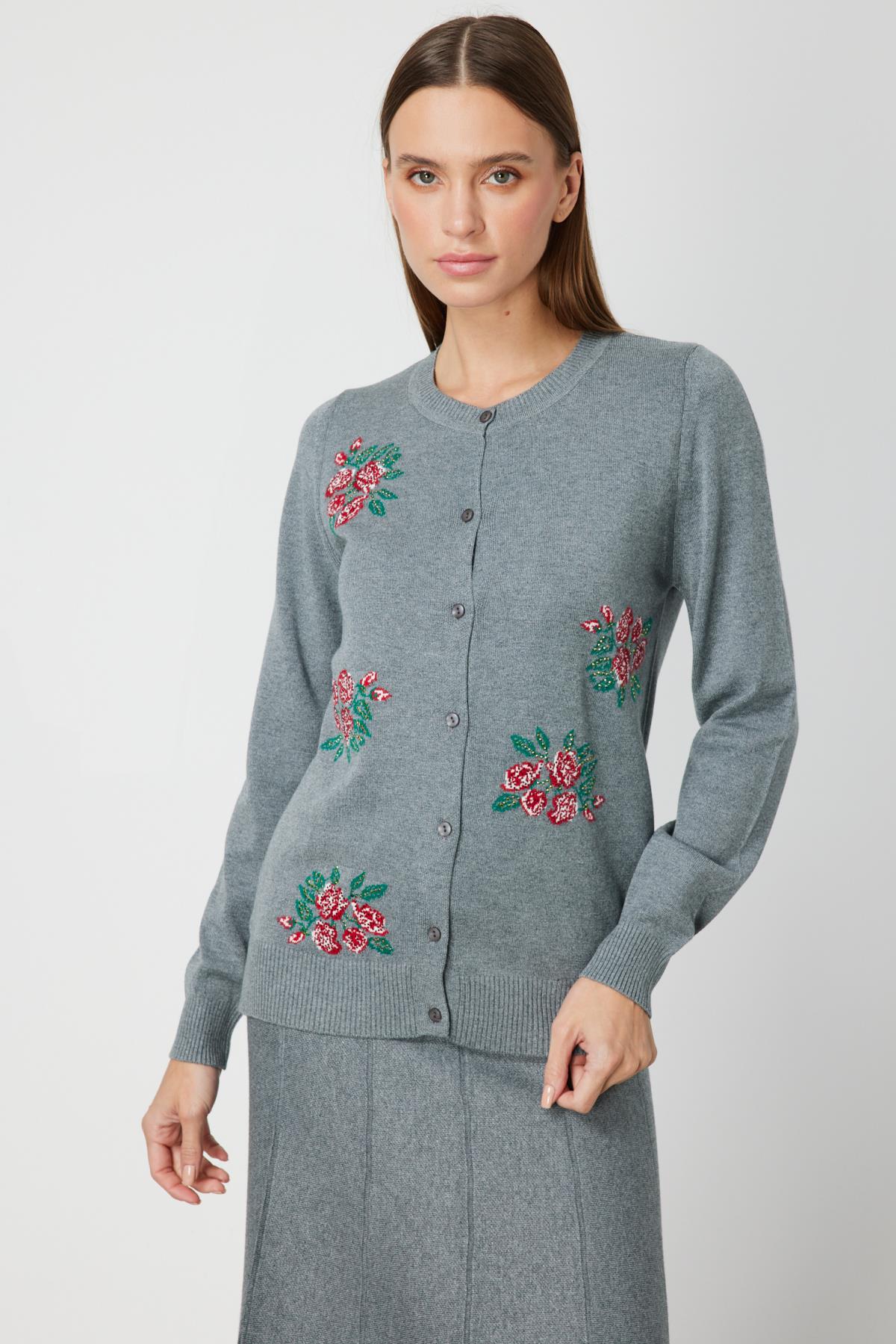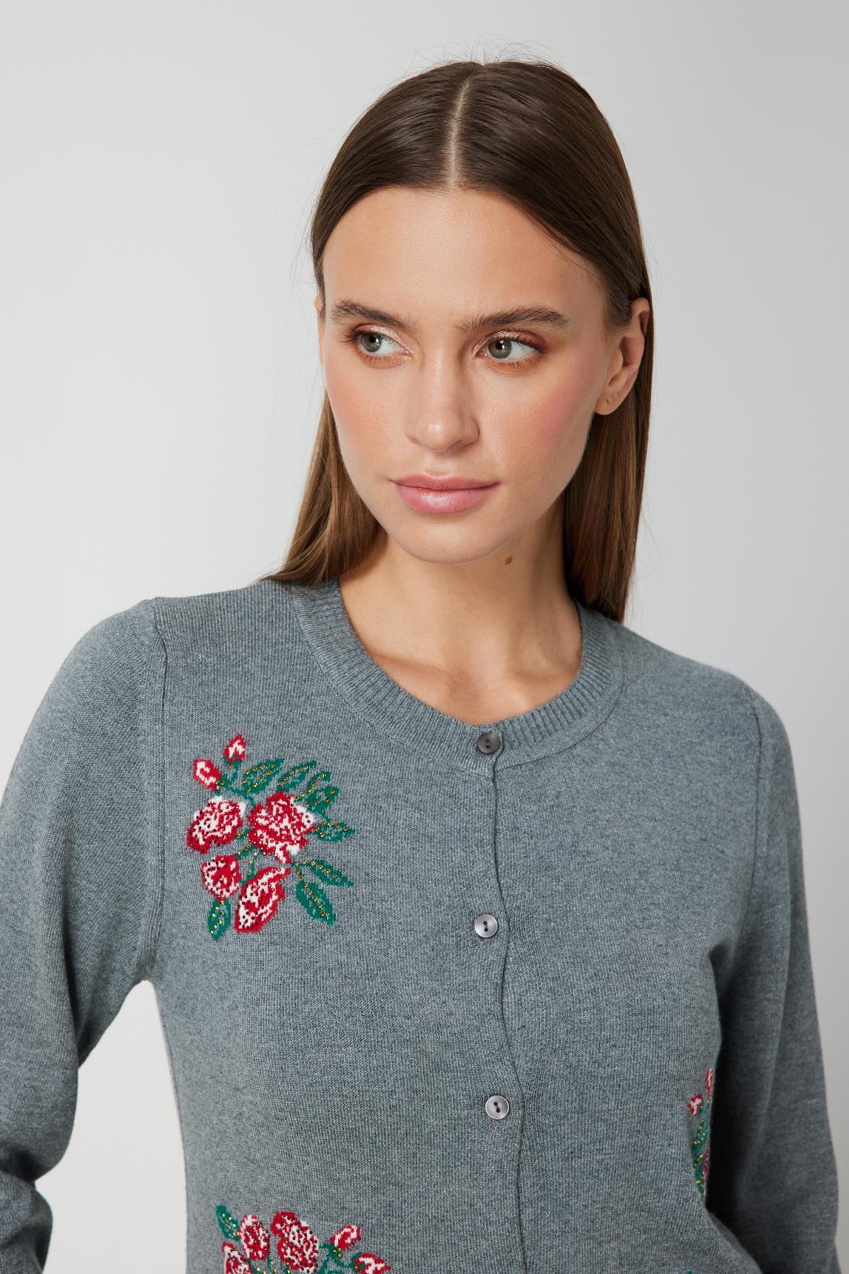 Çiçek Nakışlı Düğmeli Hırka GRİ (26KON5920-010)