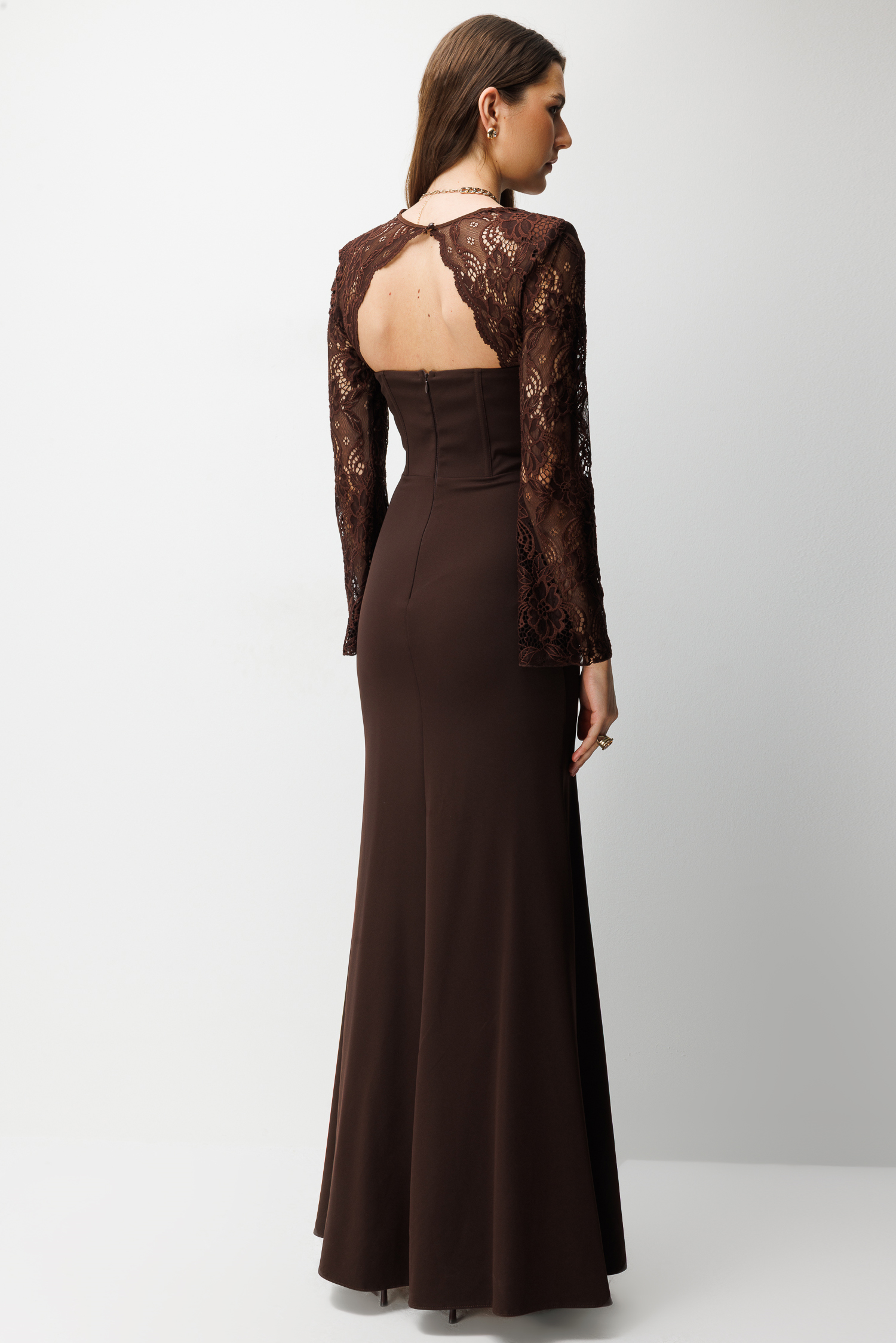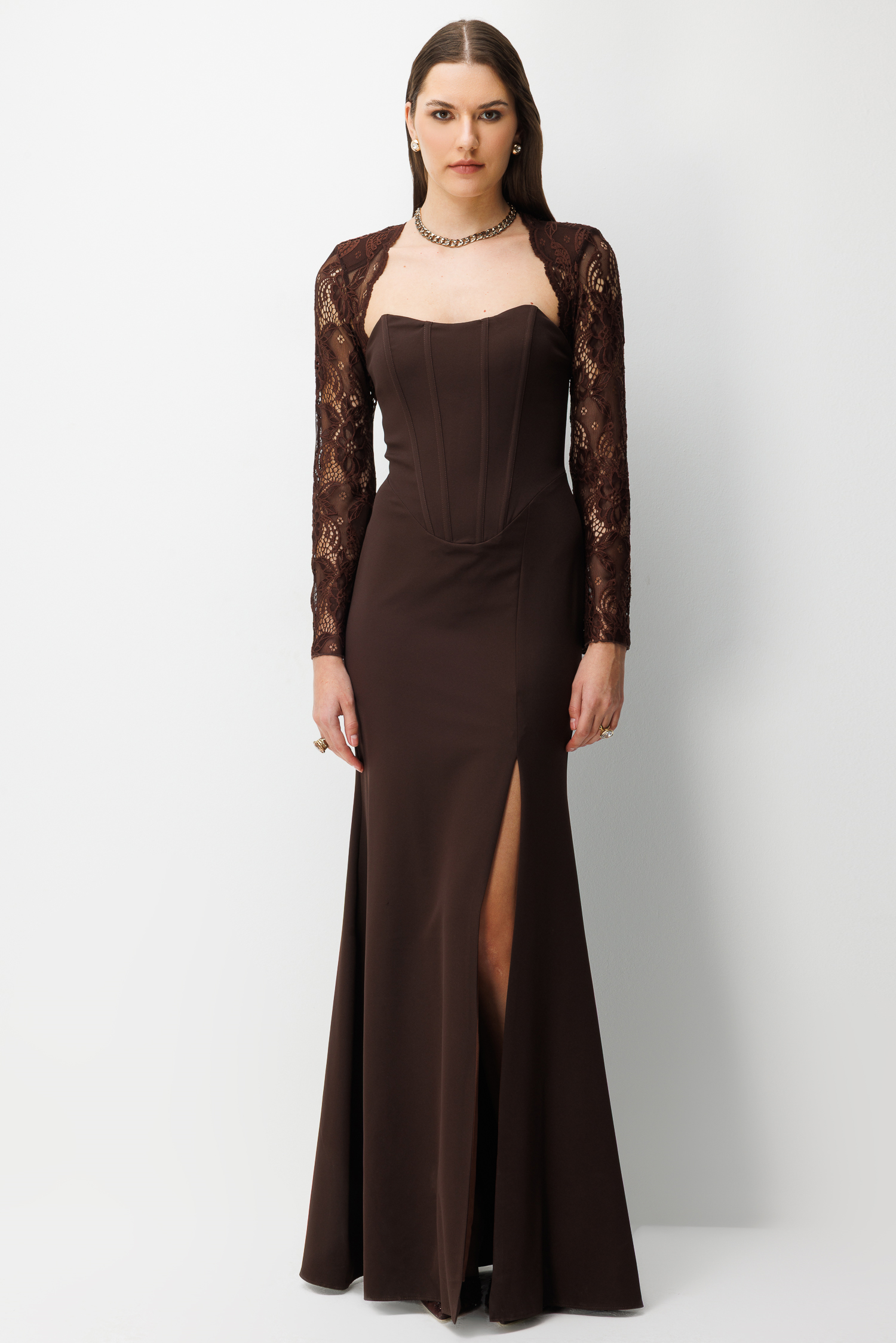 Modern romantizmi korse formun gücüyle birleştiren bu maksi elbise, özel davetlerde ve gece stilinizde iddialı bir duruş sergiliyor. Derin acı kahve tonu, dantelin zarif dokusuyla buluşarak zamansız bir şıklık sunuyor.