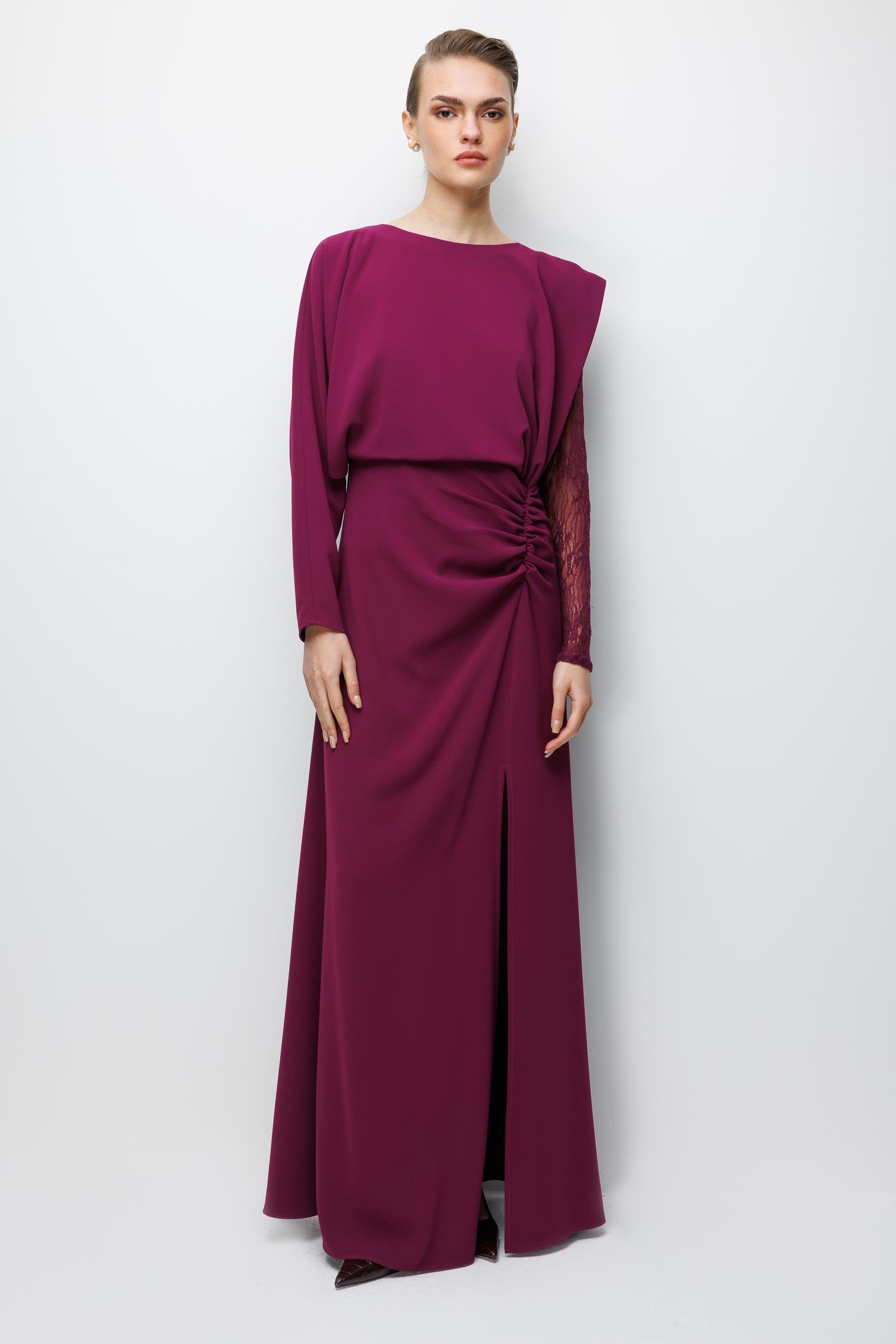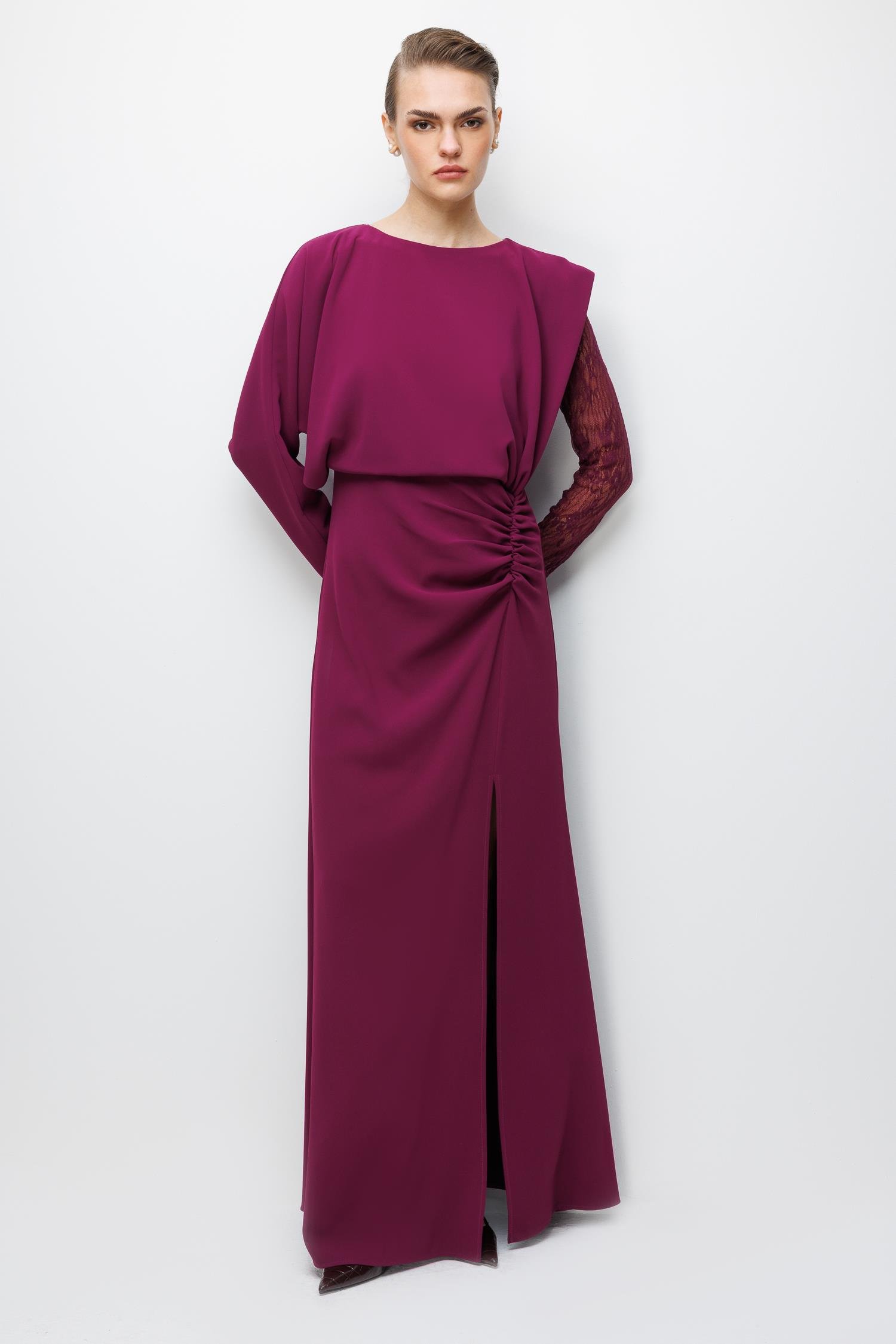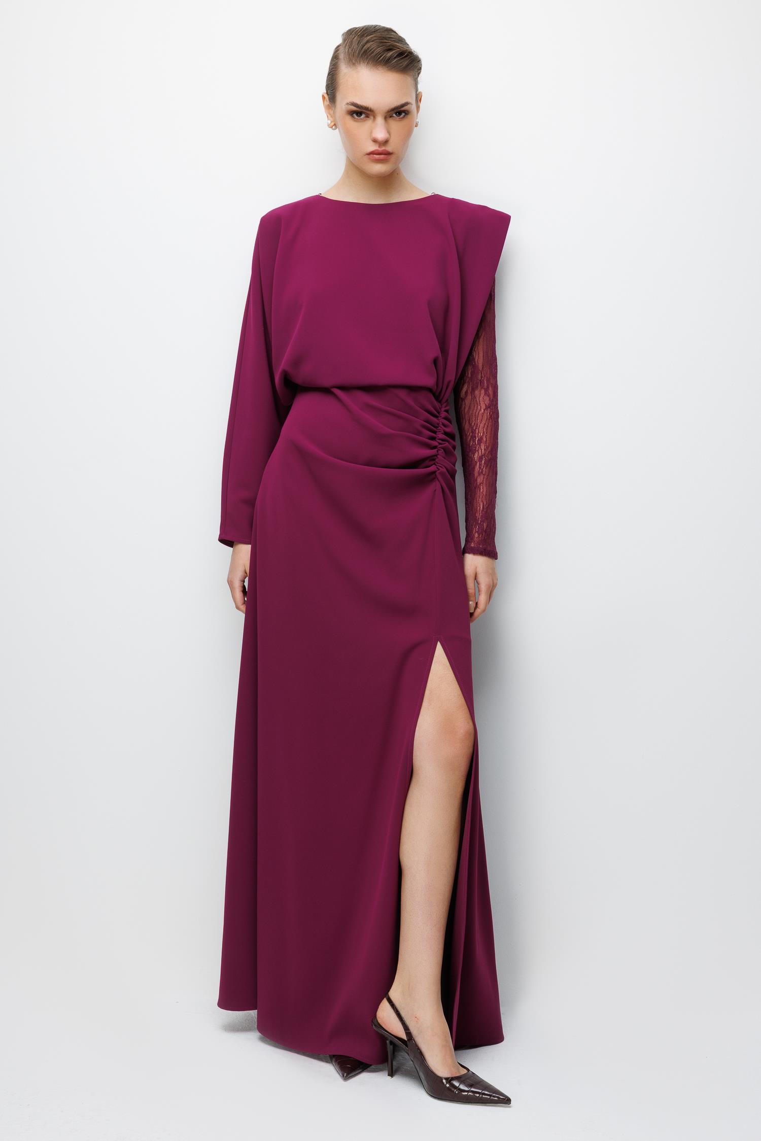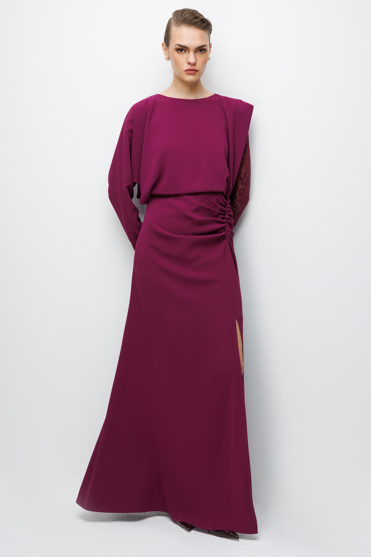 Elbisenin imza detayı olan Antel Kol kesimi, hacimli ve dramatik bir dokunuşla feminenliği ve gücü bir araya getiriyor. Bu özel tasarım, omuz ve kol hatlarınıza zarafet katarken, elbisenin sade gövdesiyle denge kurar.