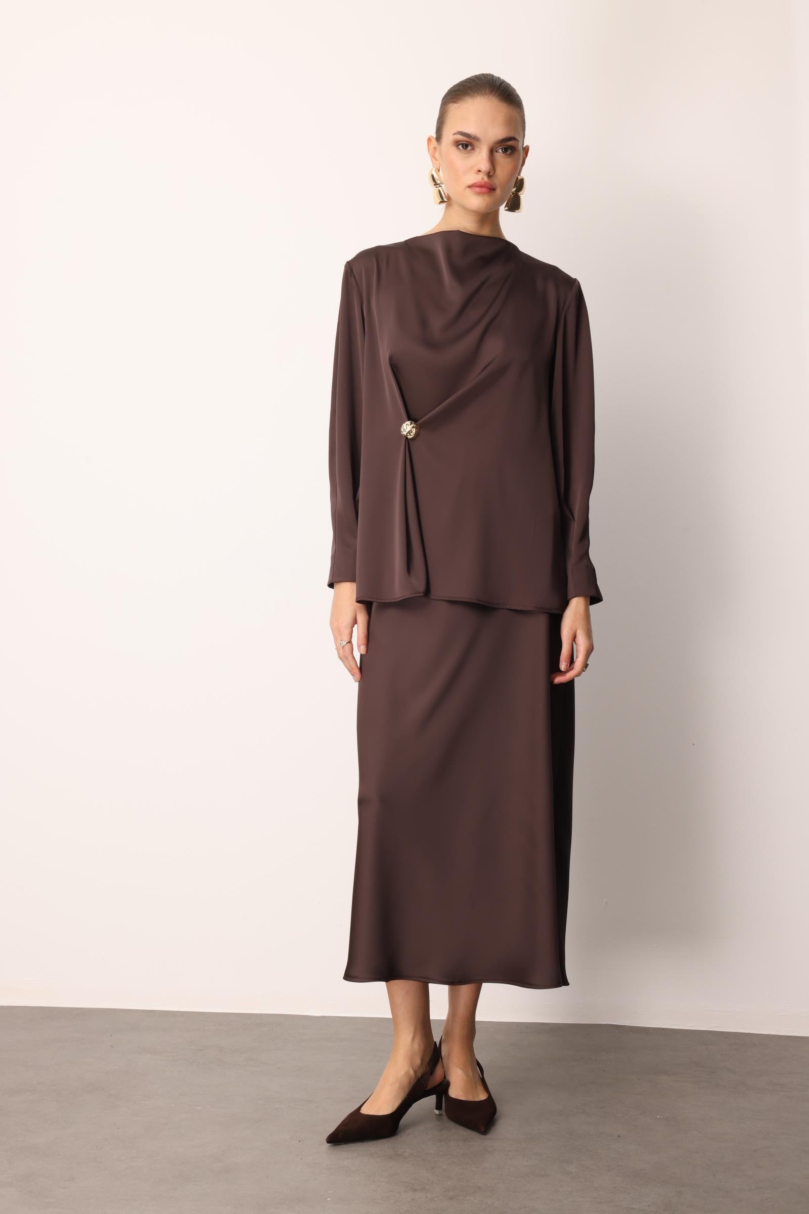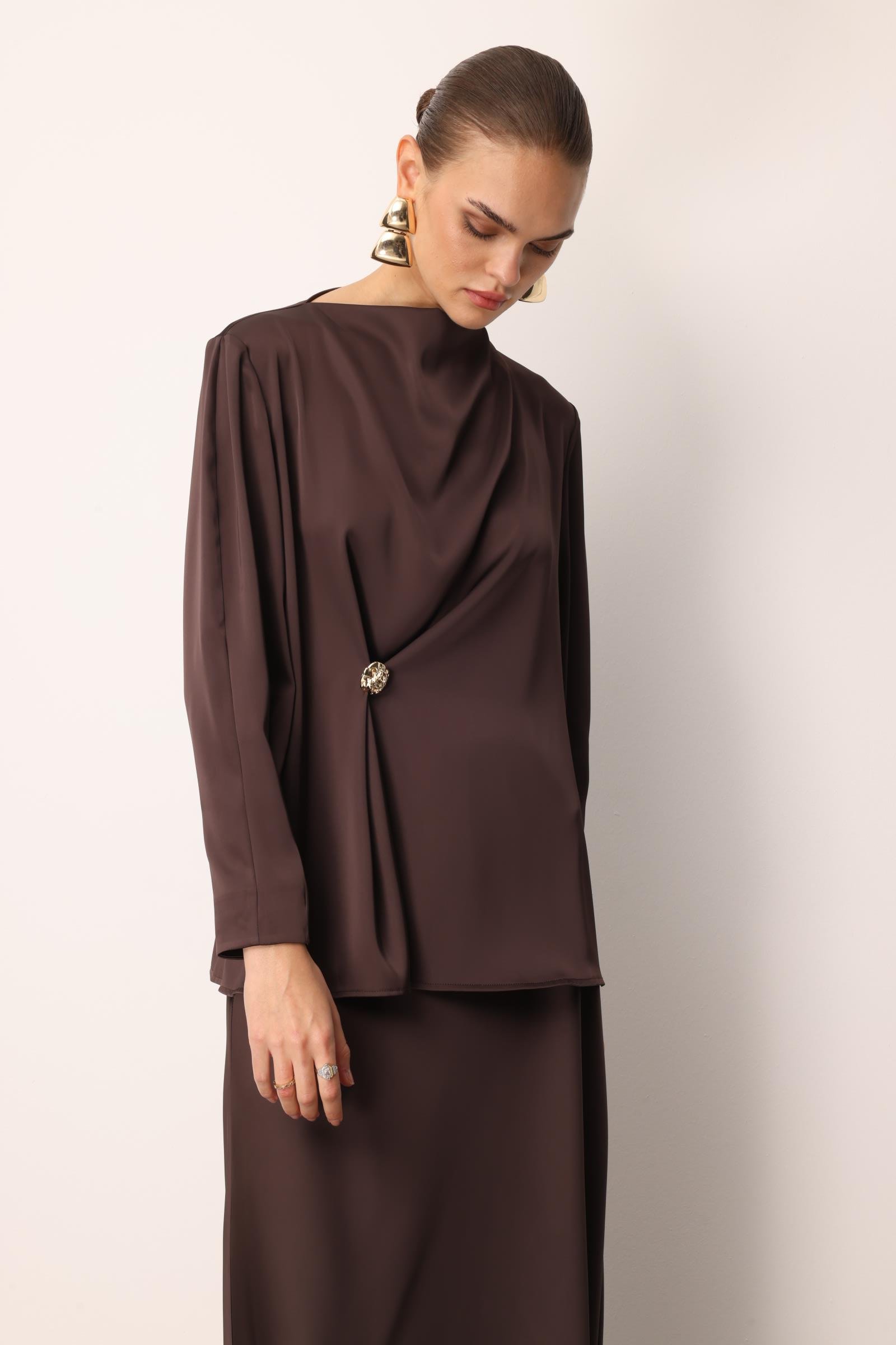 Akışkan Drapaj: Boyun kısmından başlayıp gövdeye inen zarif drapaj, bluzun hareketli ve lüks bir silüet kazanmasını sağlar.