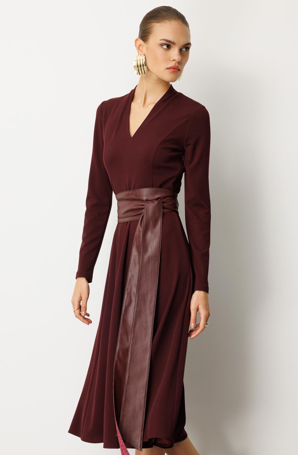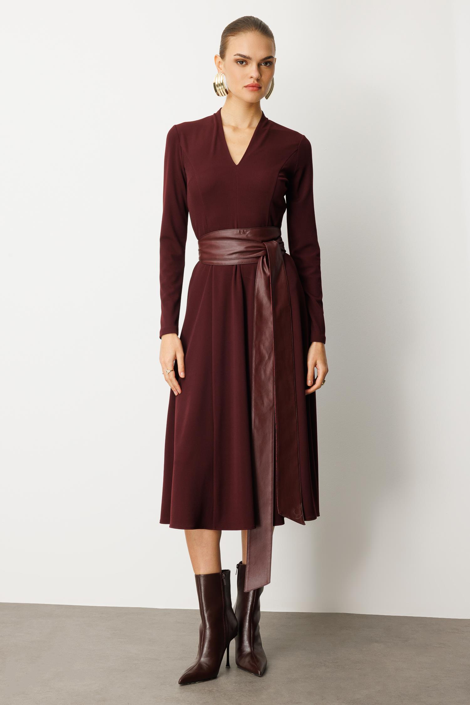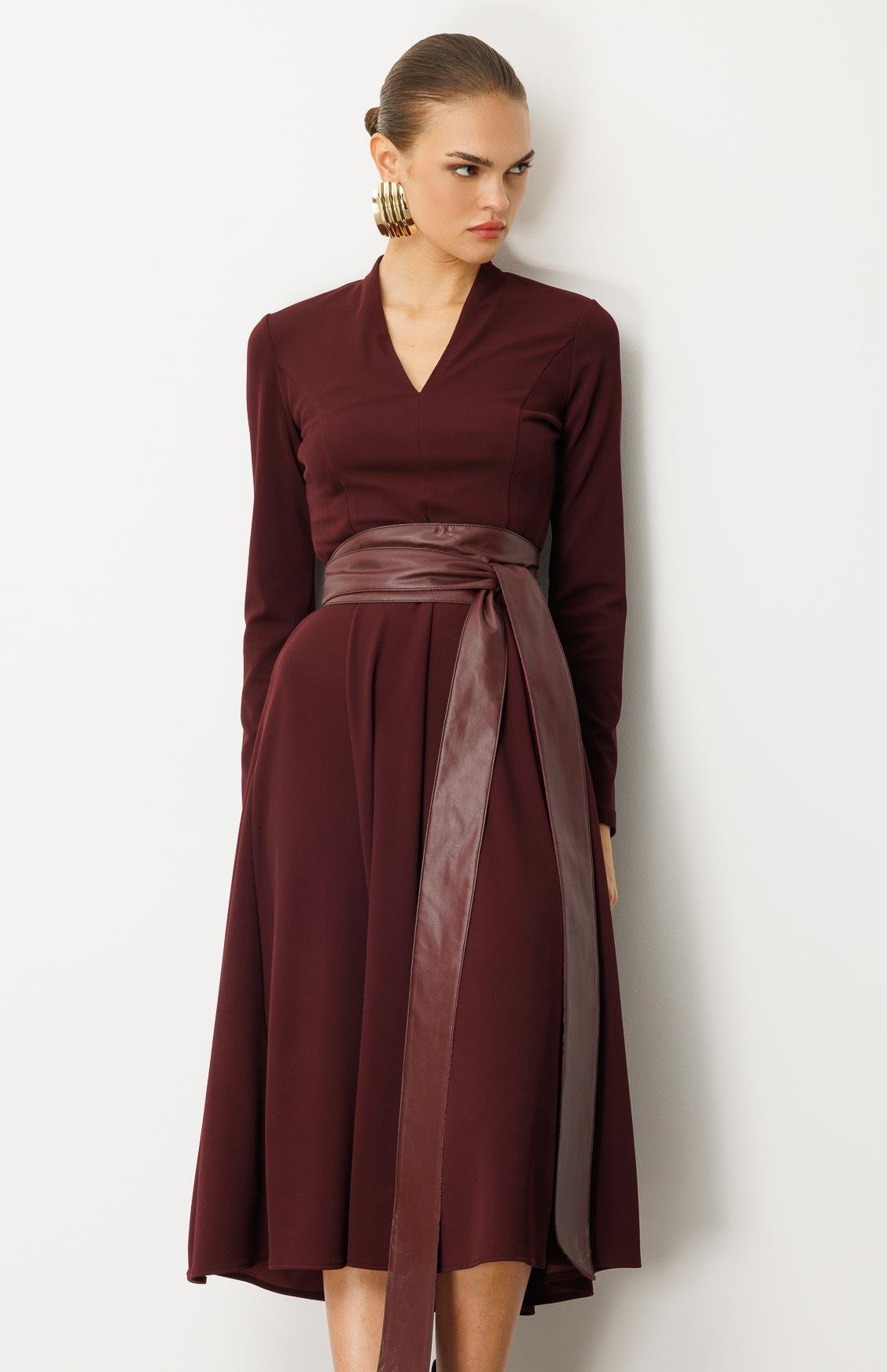 Kış sezonunun en asil ve derin rengi olan mürdüm (koyu bordo) tonuyla dikkat çeken bu örme elbise, hem ofis şıklığına hem de akşam davetlerine uygundur. Uzun kollu ve V yaka kesimi, beli saran geniş deri görünümlü kuşakla (kemer) tamamlanarak kusursuz bir silüet yaratır.