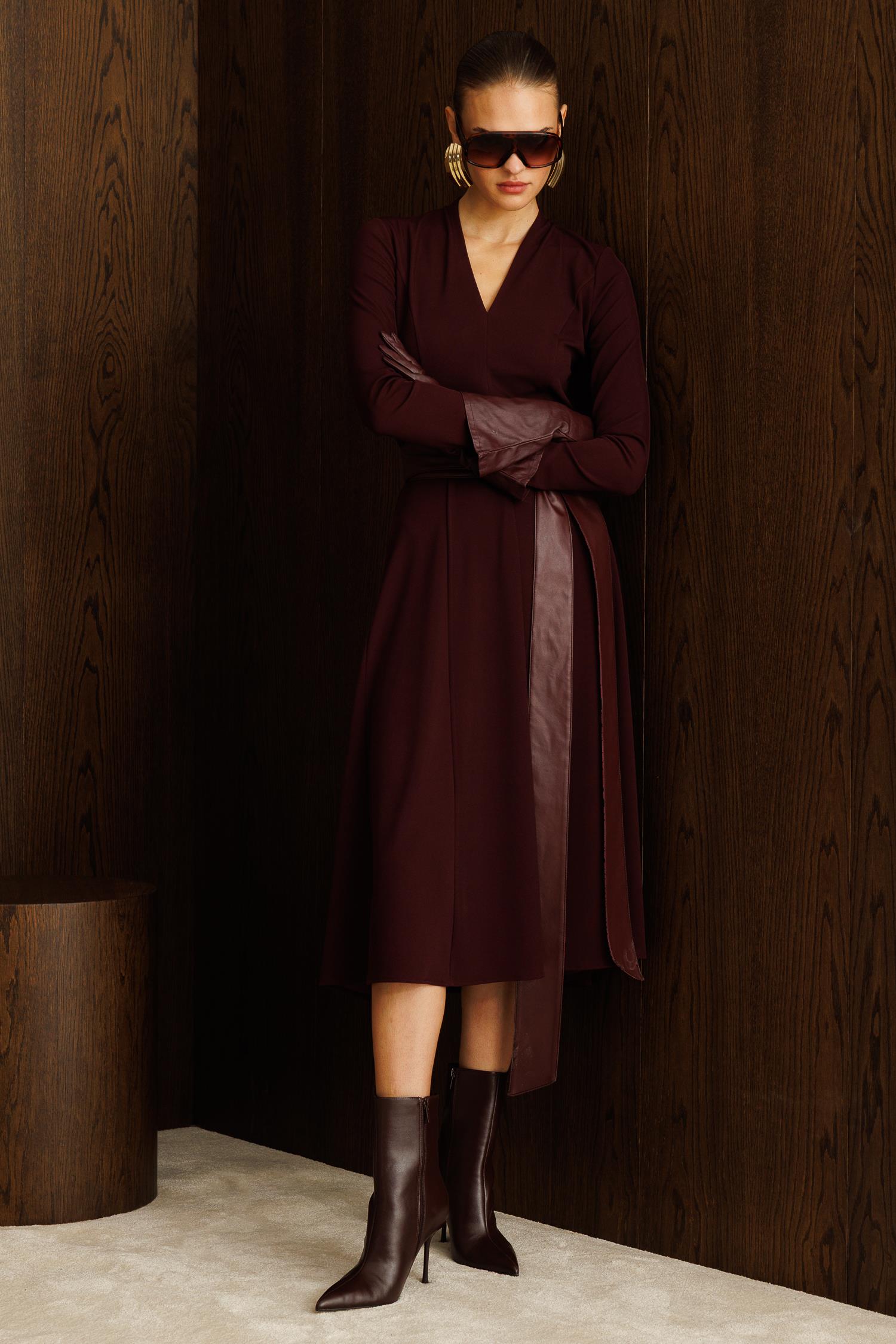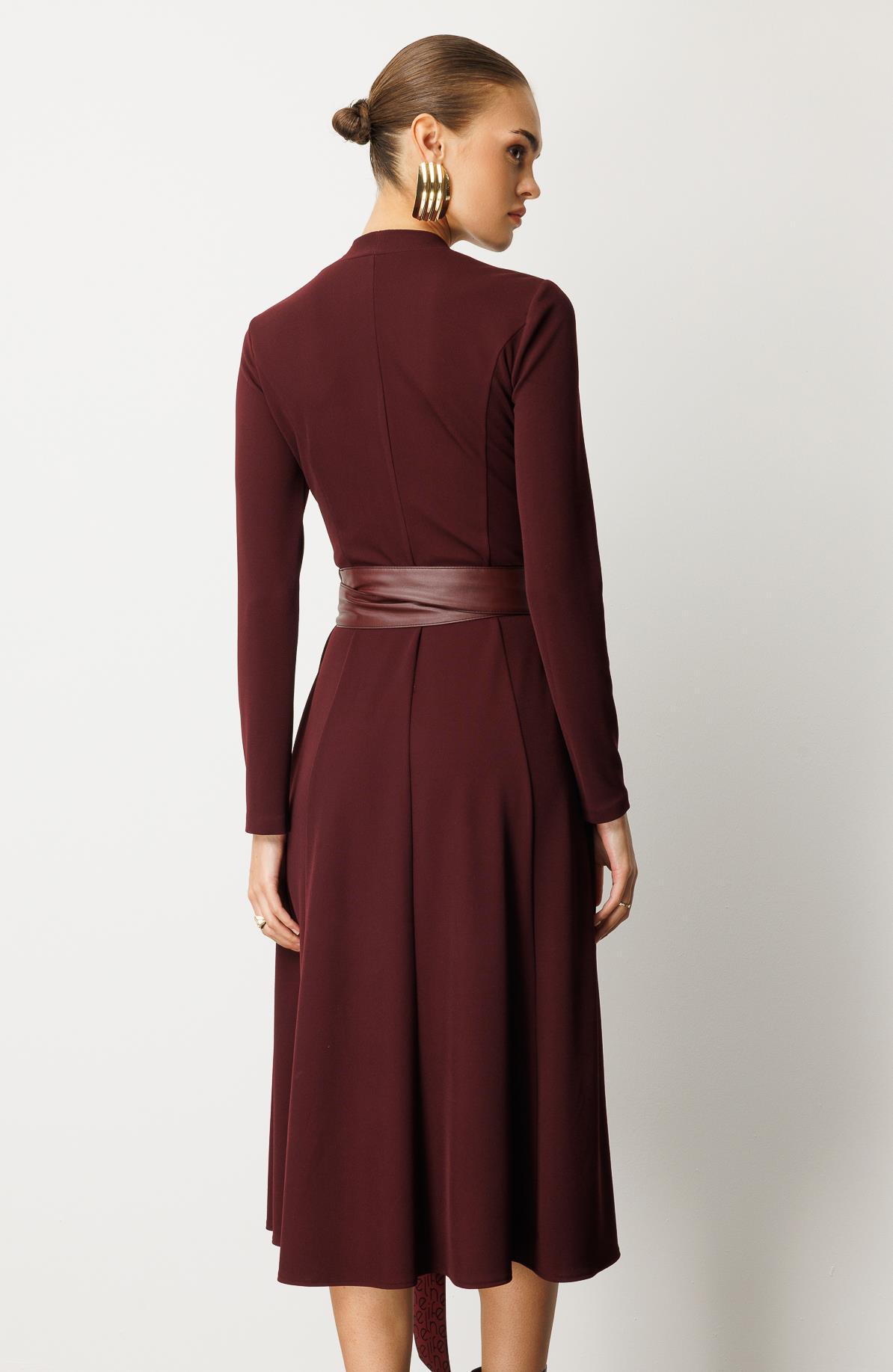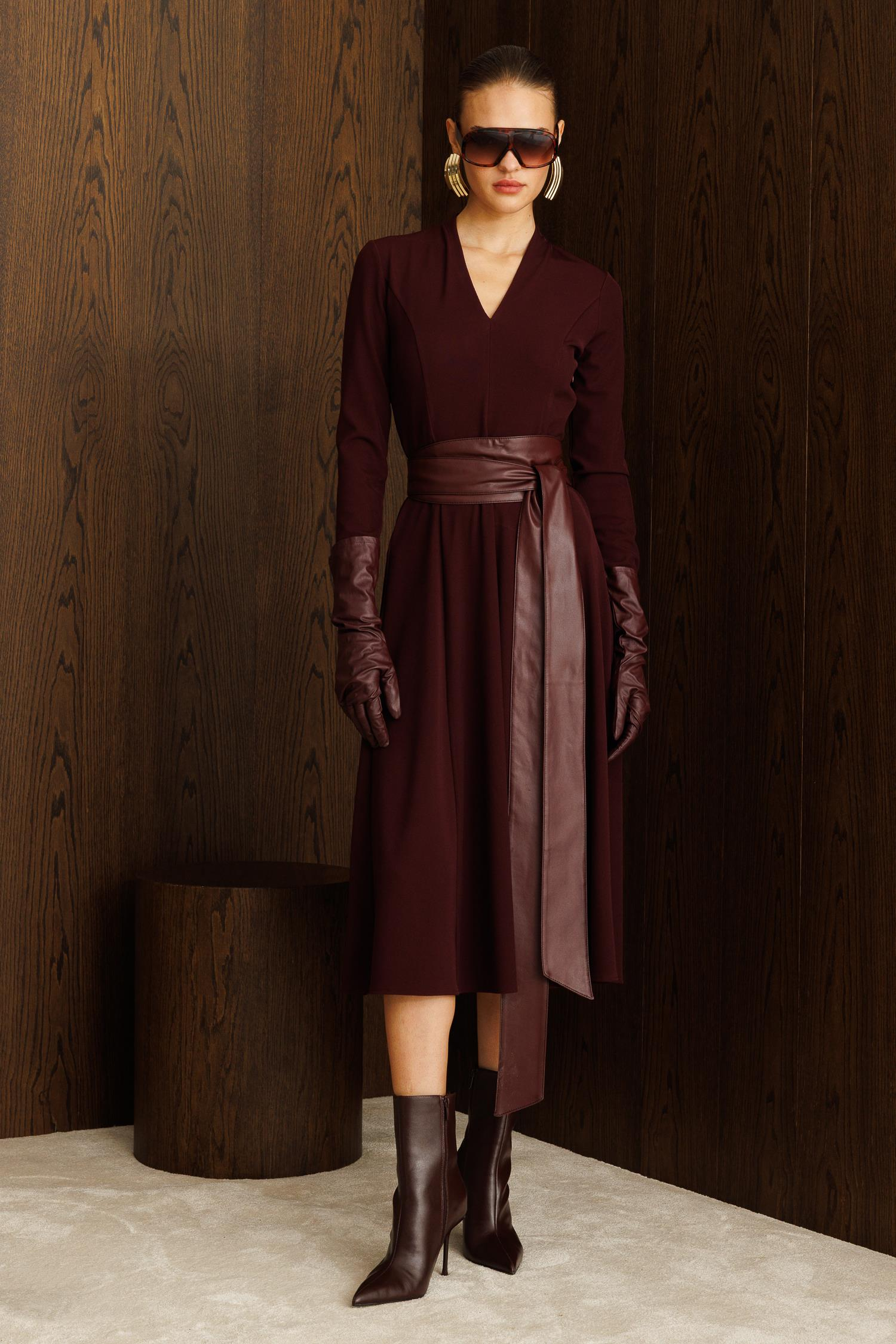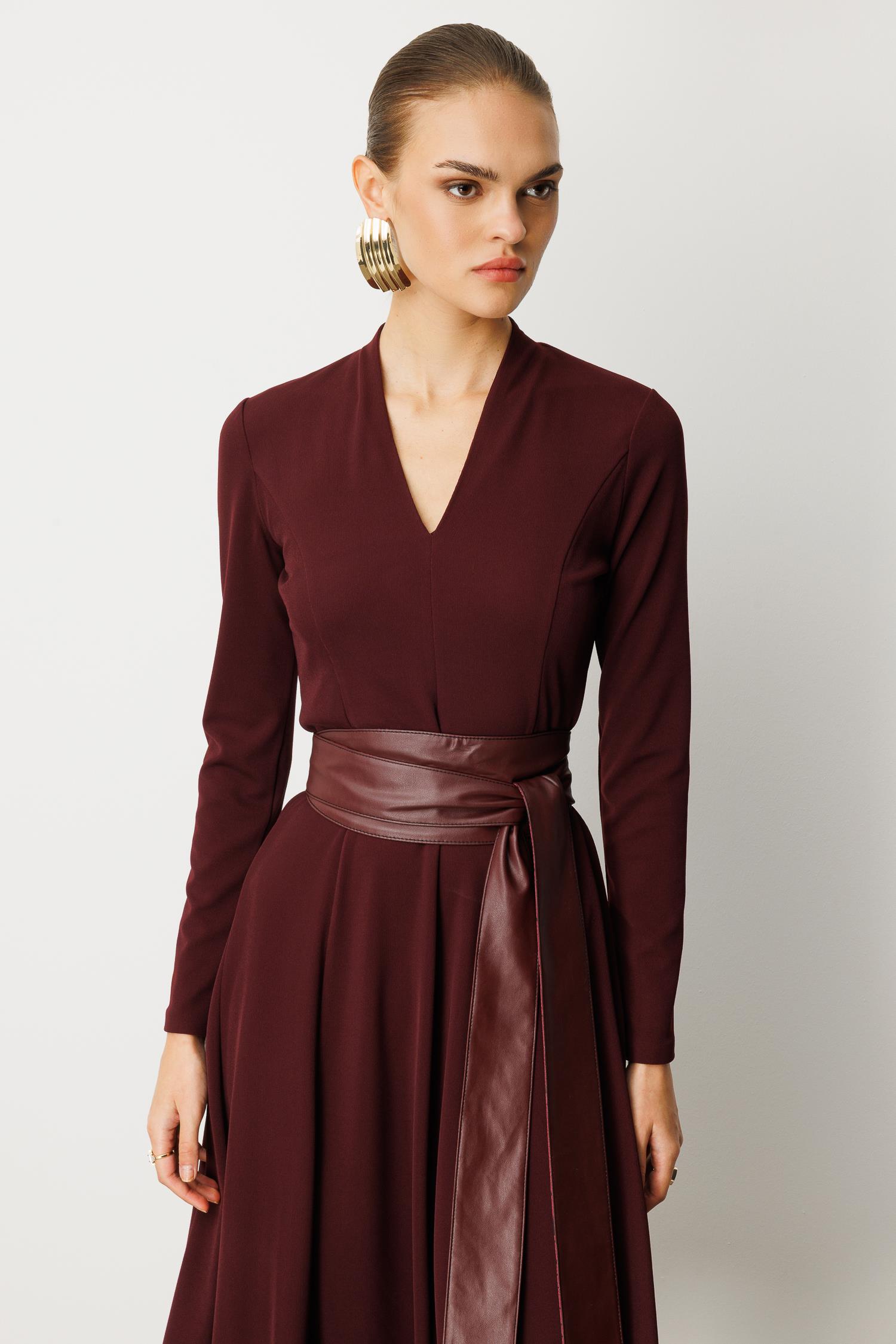 Kış sezonunun en asil ve derin rengi olan mürdüm (koyu bordo) tonuyla dikkat çeken bu örme elbise, hem ofis şıklığına hem de akşam davetlerine uygundur. Uzun kollu ve V yaka kesimi, beli saran geniş deri görünümlü kuşakla (kemer) tamamlanarak kusursuz bir silüet yaratır.