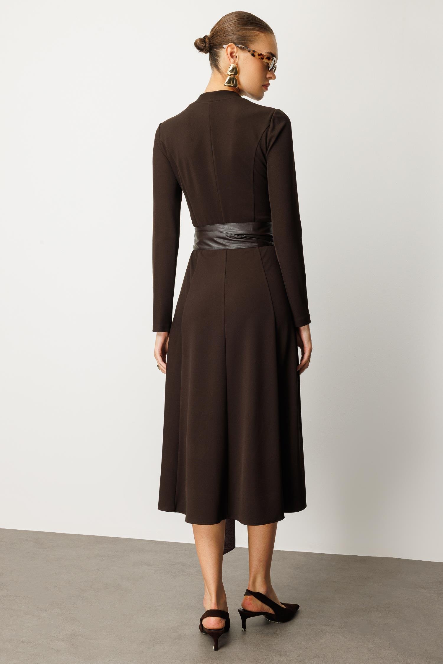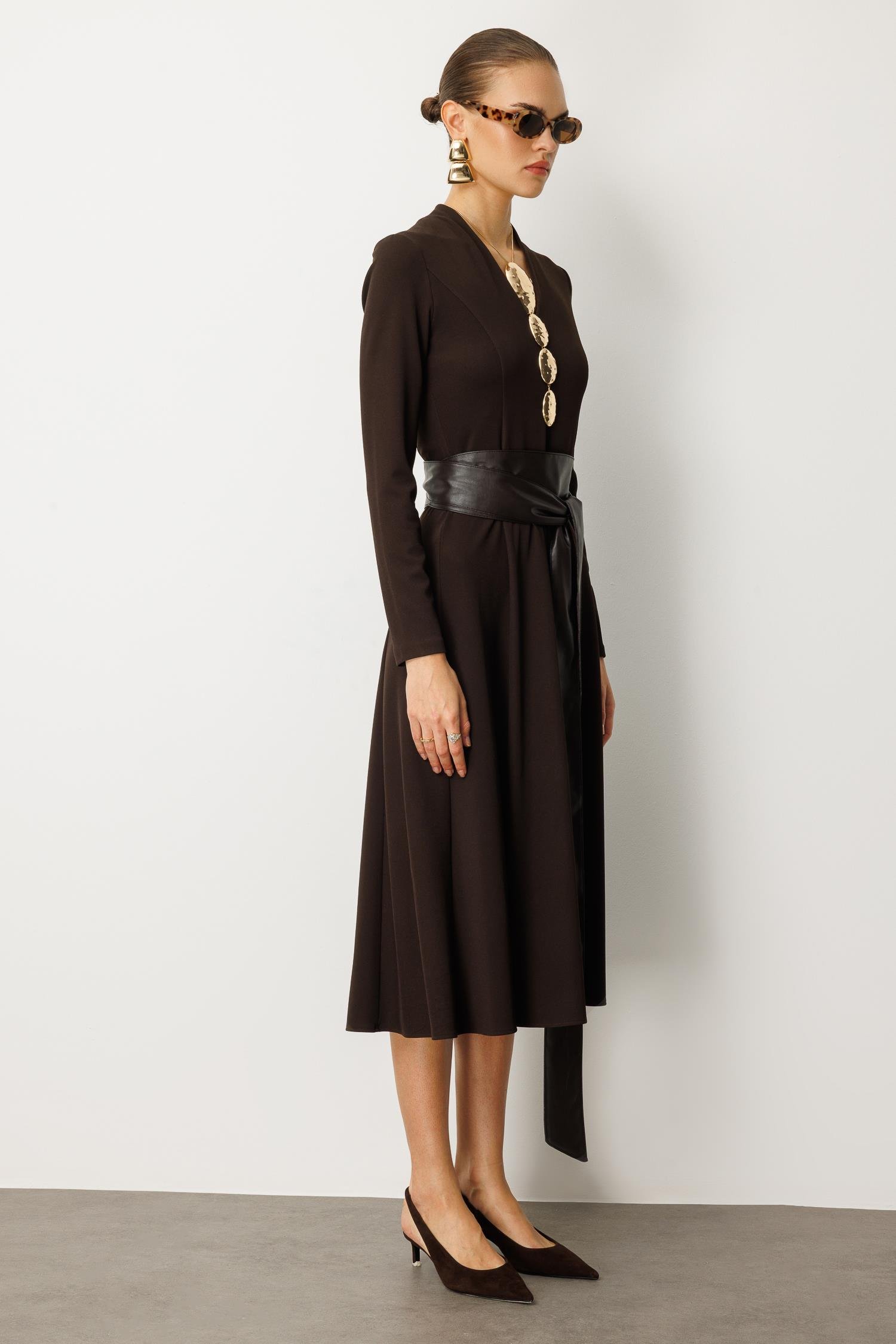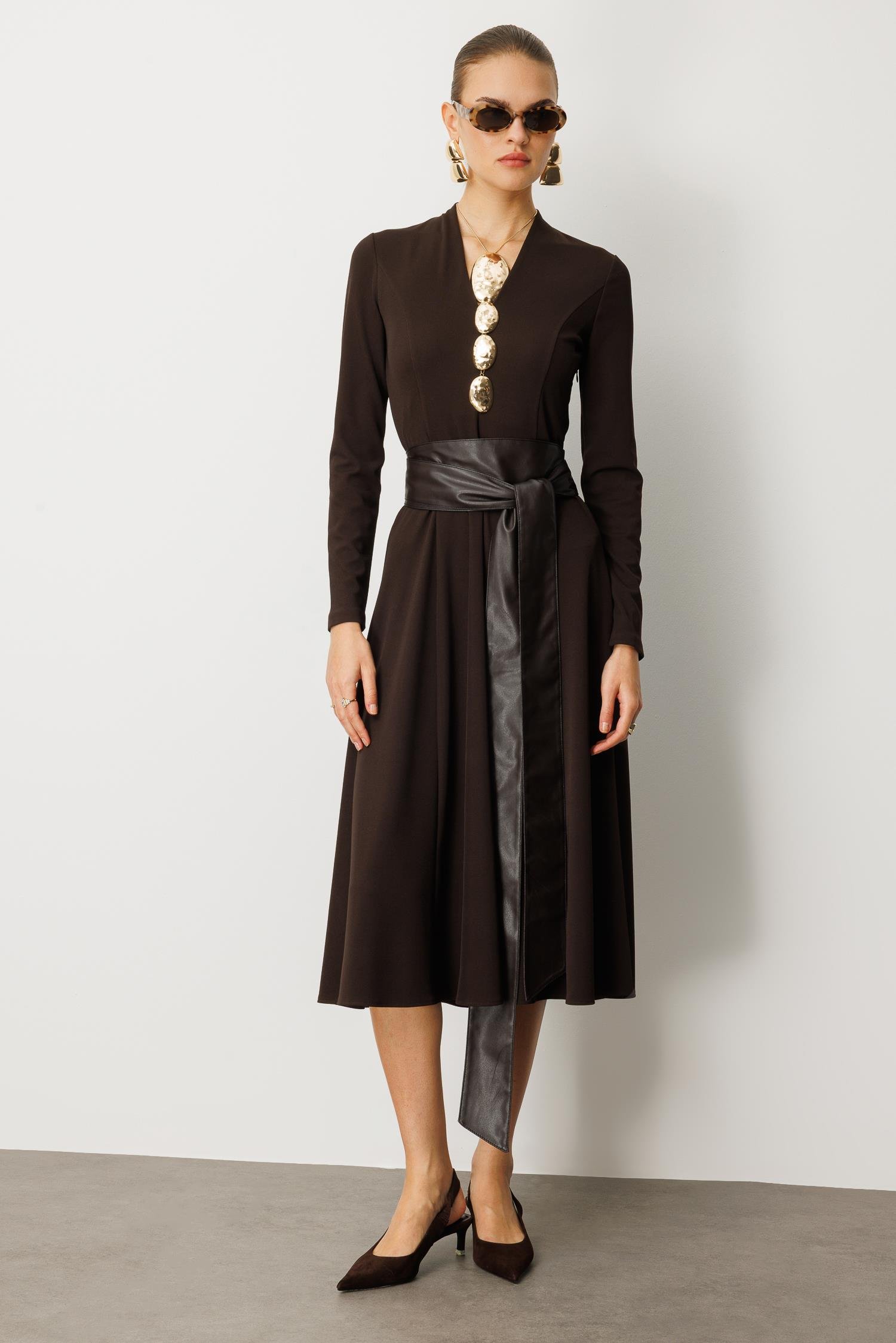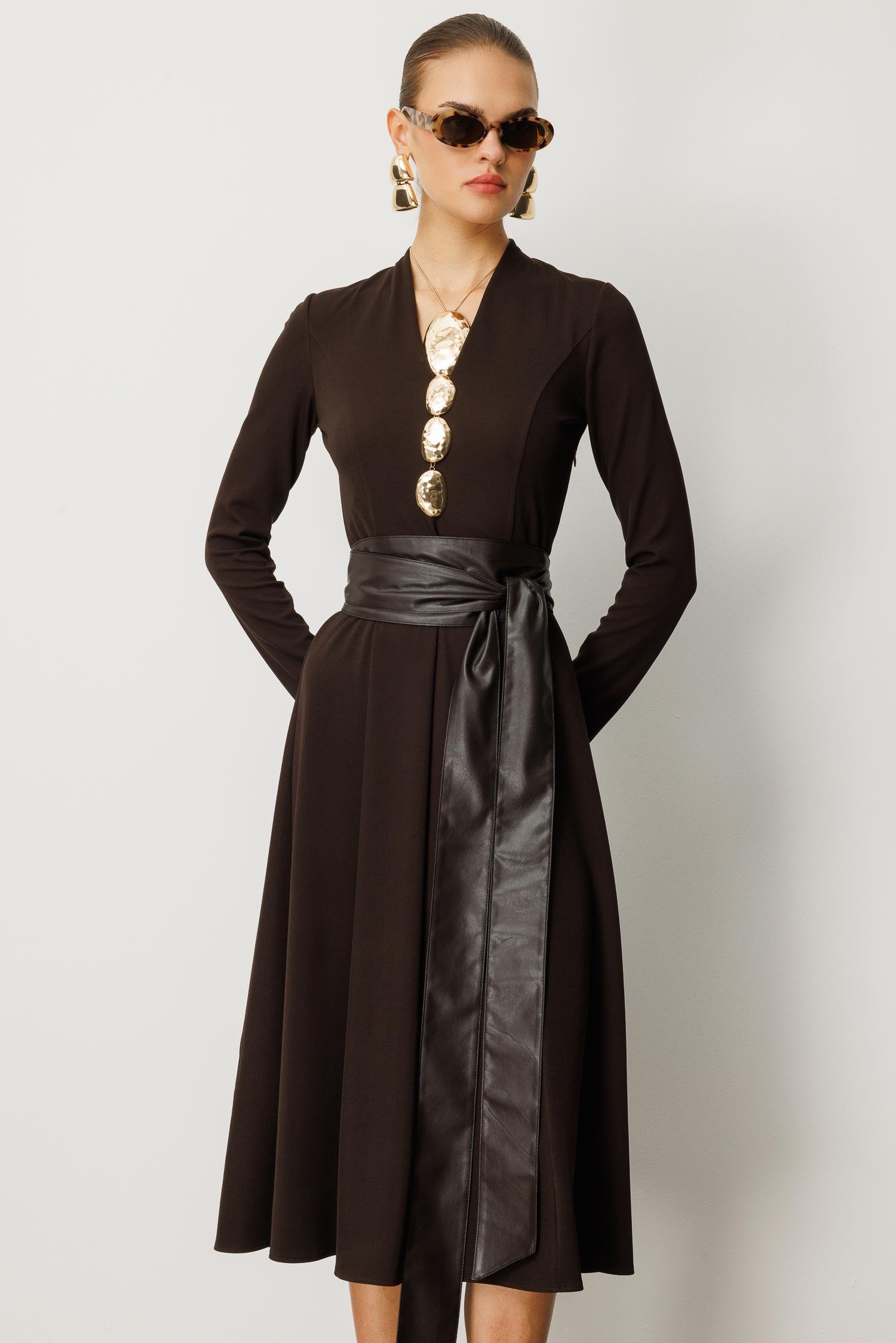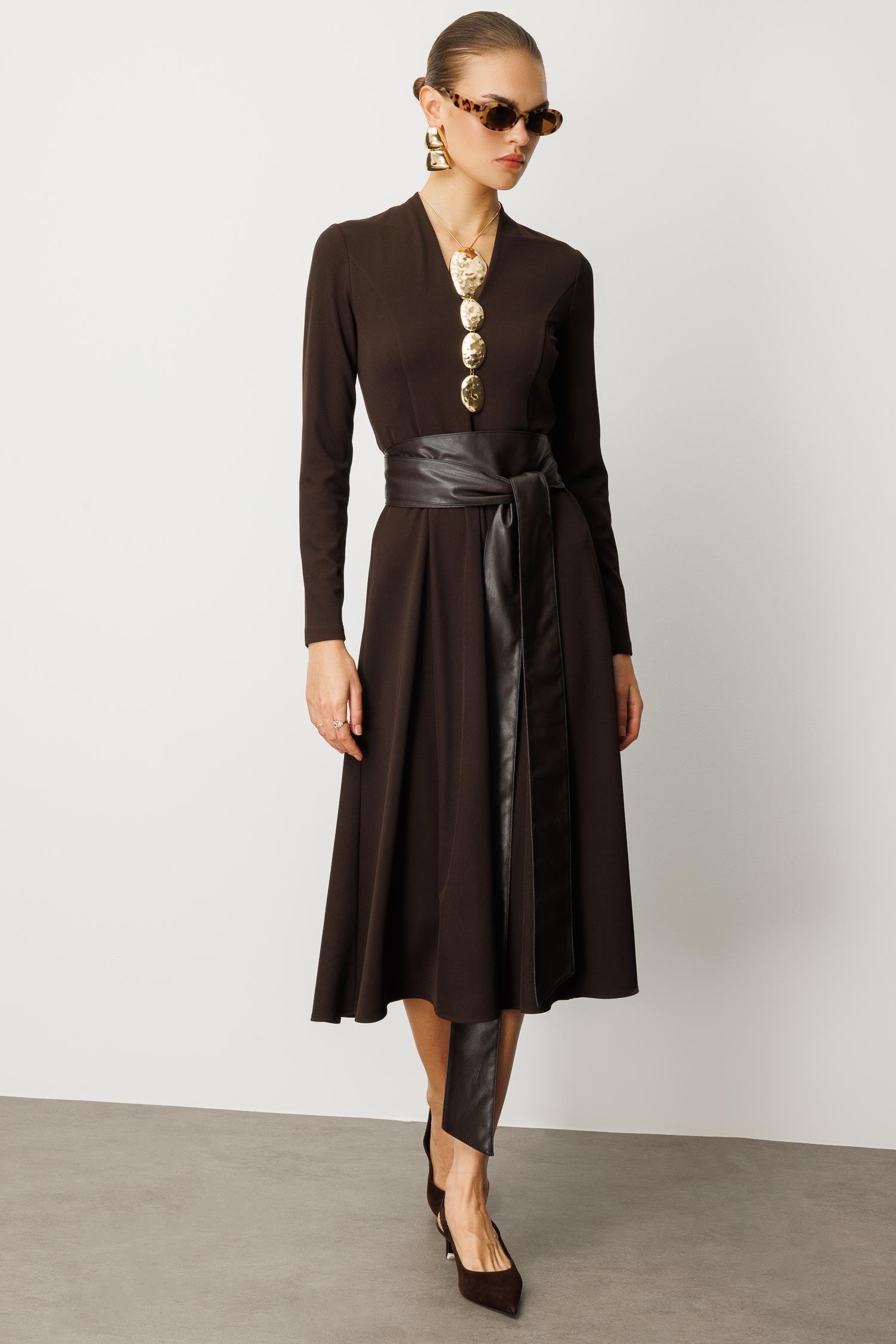 Zamansız zarafeti modern bir dokunuşla birleştirin. Tok duruşlu acı kahve (koyu kahve) rengindeki bu uzun kollu örme elbise, yumuşak bir yapı ve kusursuz bir silüet sunar. V yaka kesimi boynu zarifçe uzatırken, beli saran geniş deri kuşak (kemer) detayı, elbiseye güçlü bir kontrast ve iddialı bir hava katar.