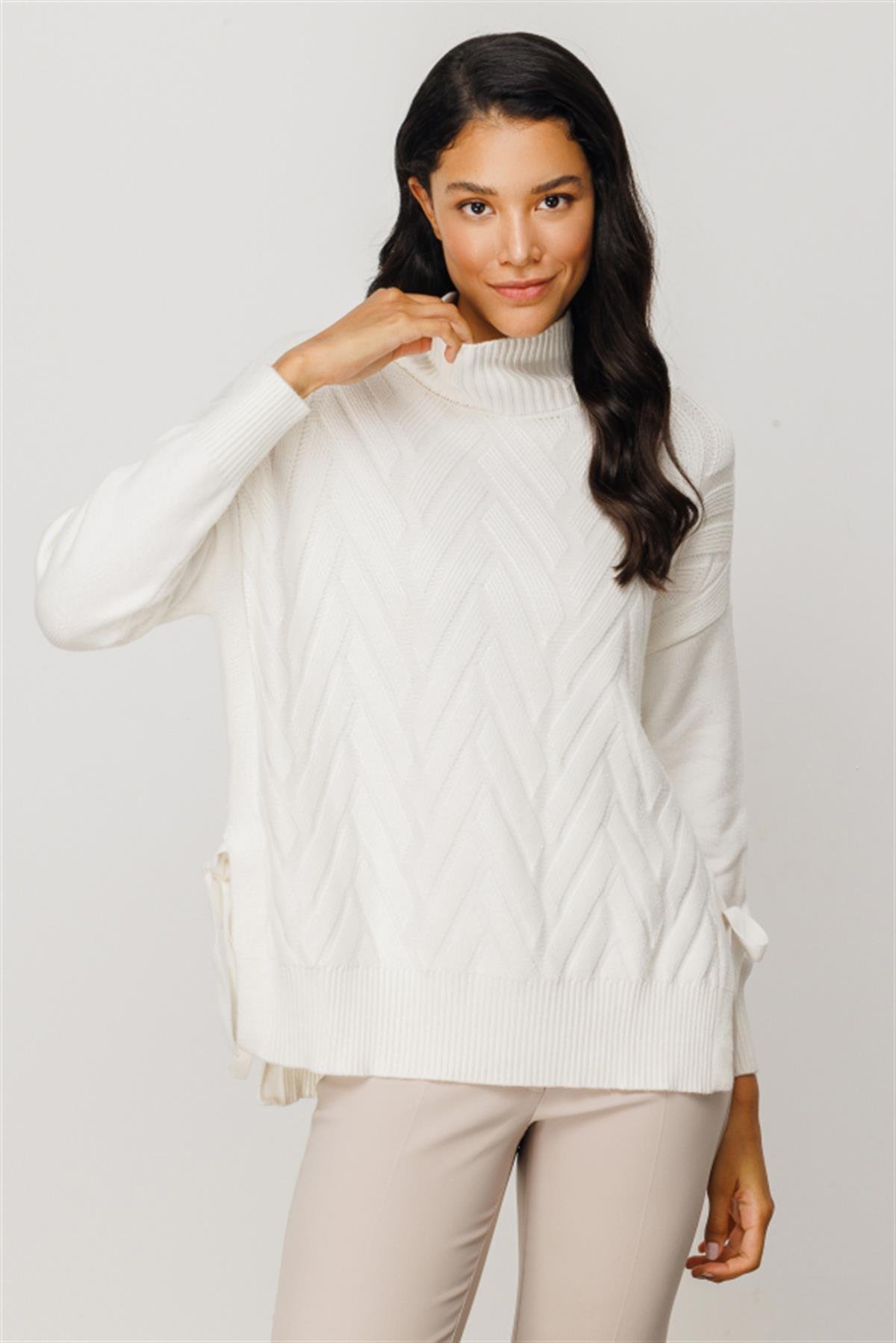 Dik Yaka Yanı Bağcıklı Ekru Kazak (24K-ON7305)