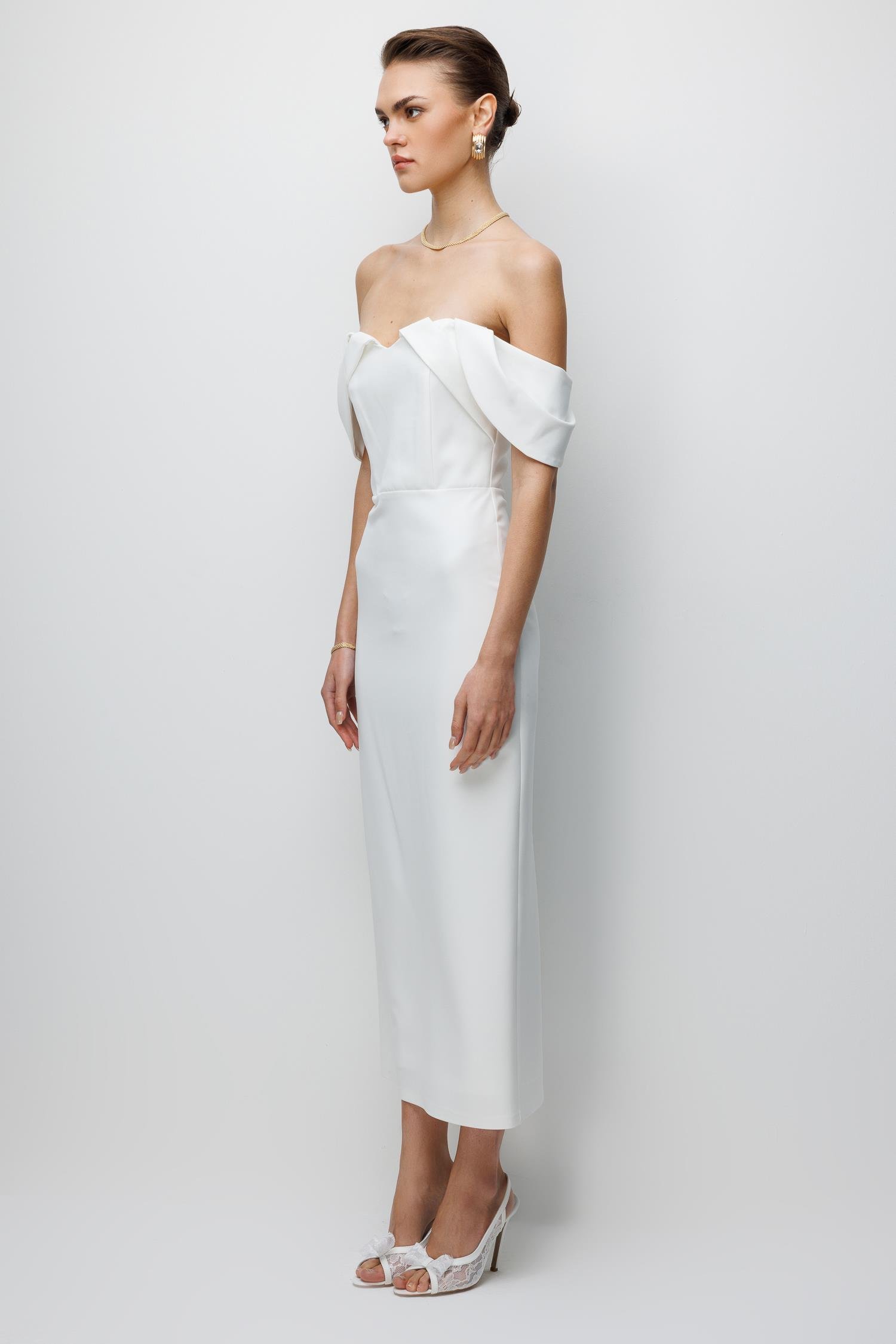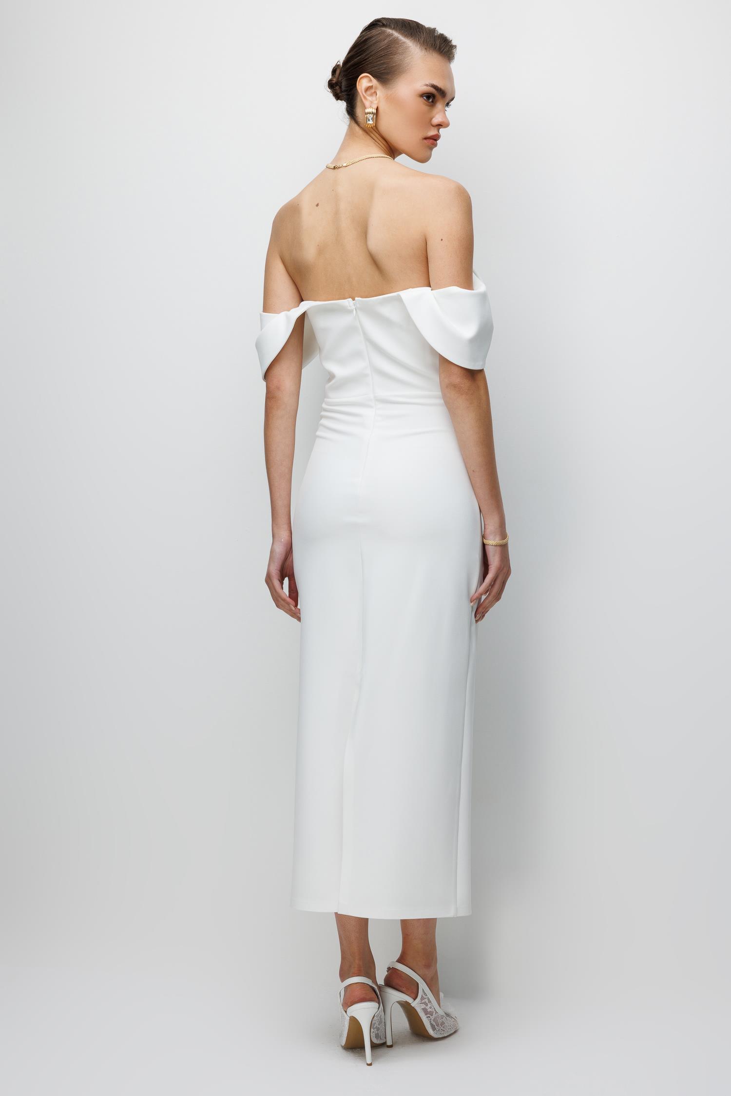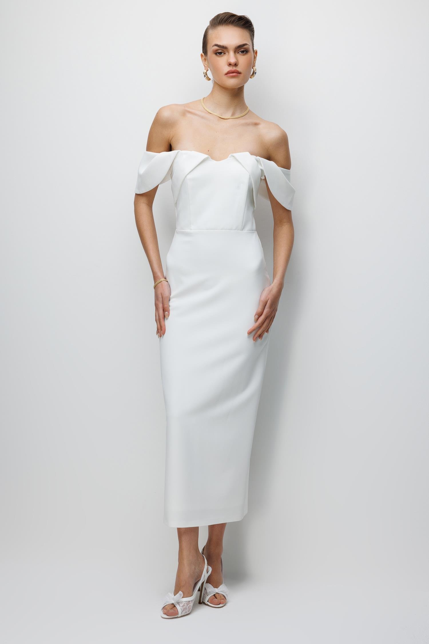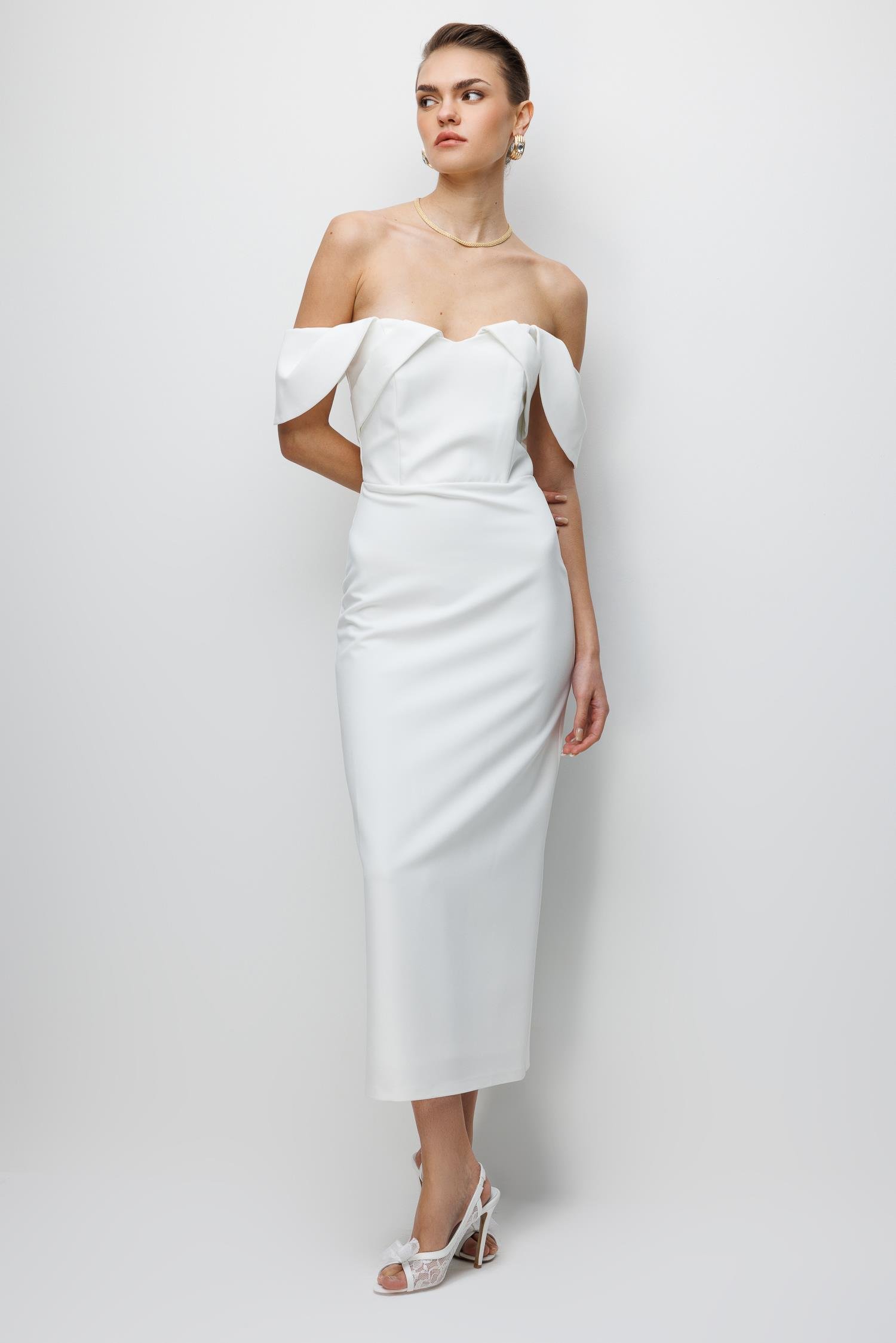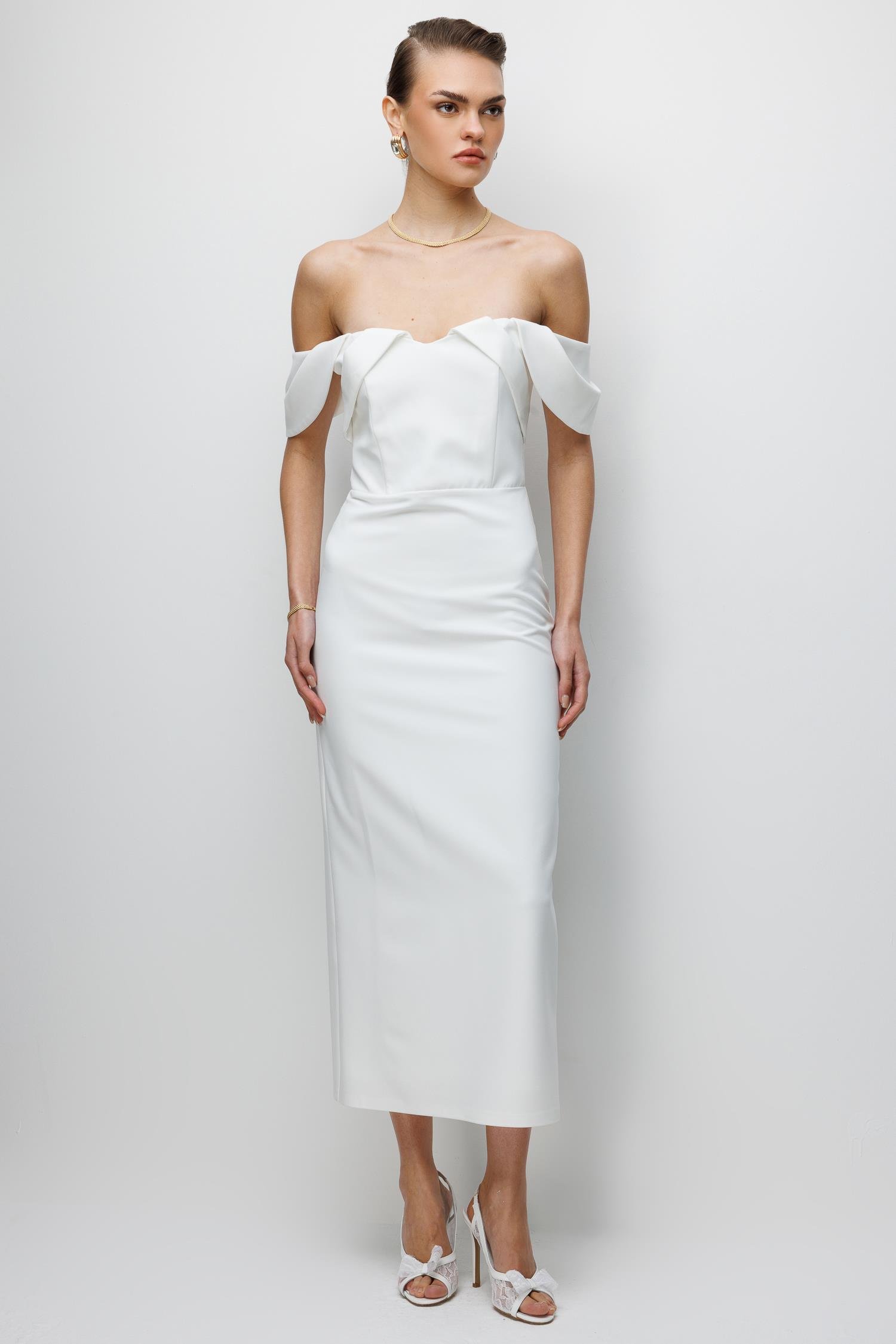 Ana Özellikler: Düşük Omuz Detaylı, Midi/Abiye Kesim, Zarif Silüet, Asil Ekru Ton.