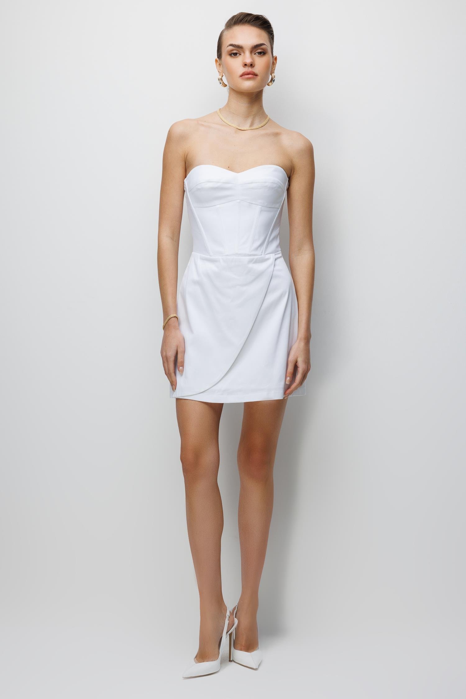 Ana Özellikler: Straplez Yaka, Mini Boy, Kruvaze/Drape Detaylı, Saf Beyaz Ton.
