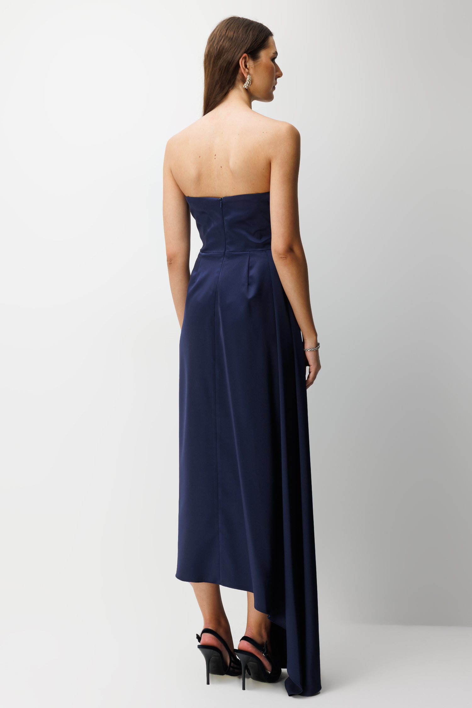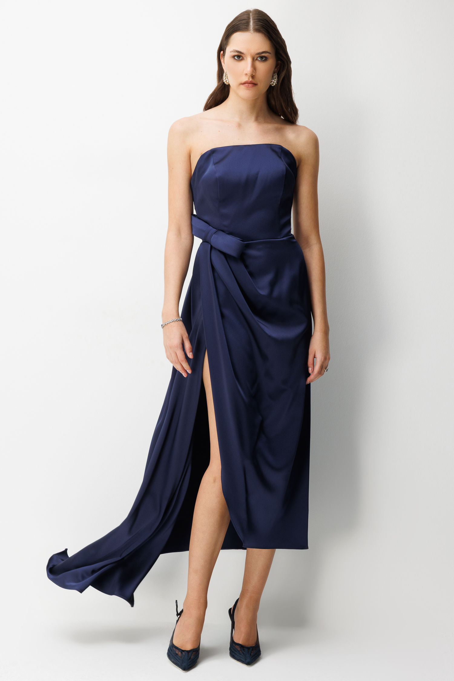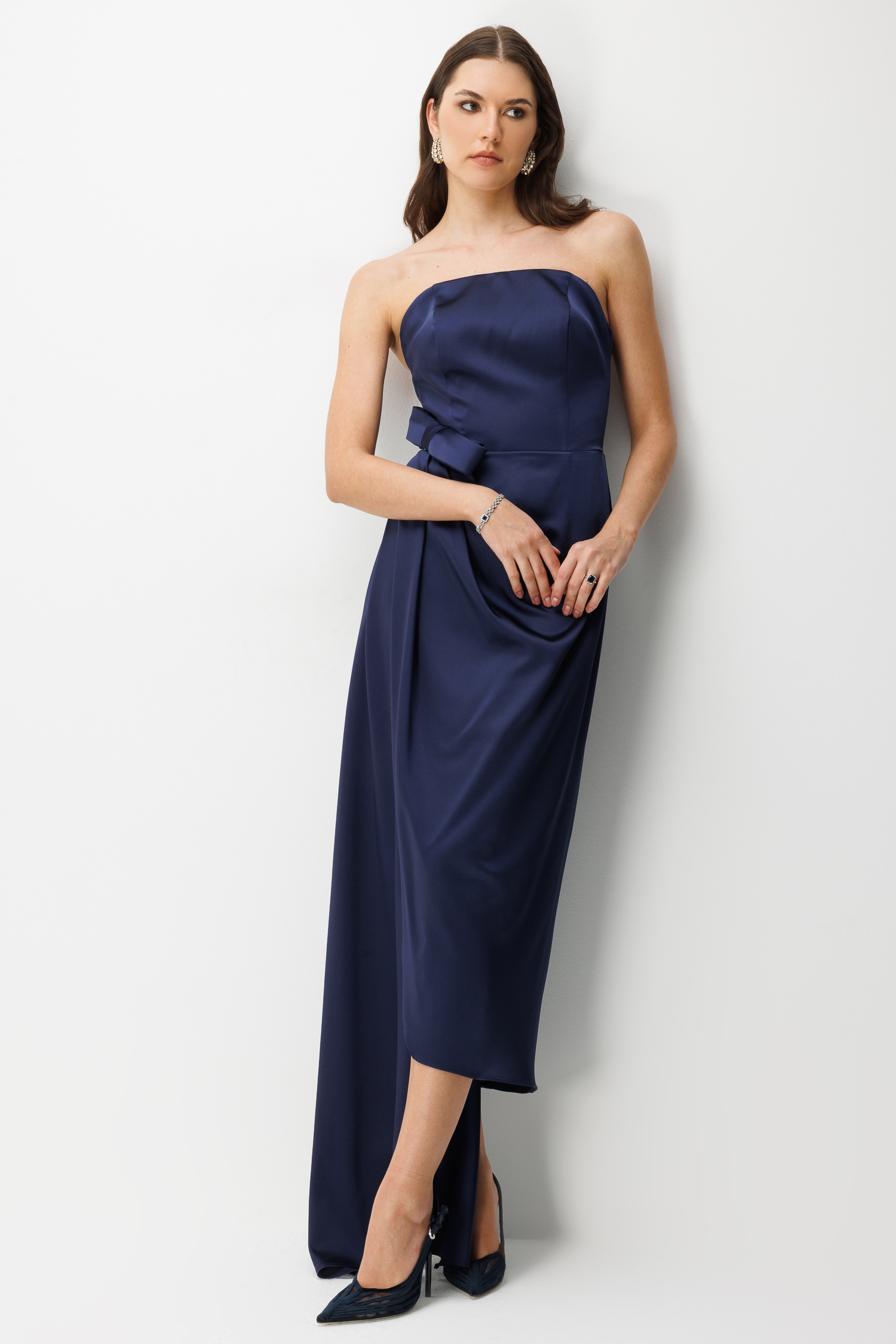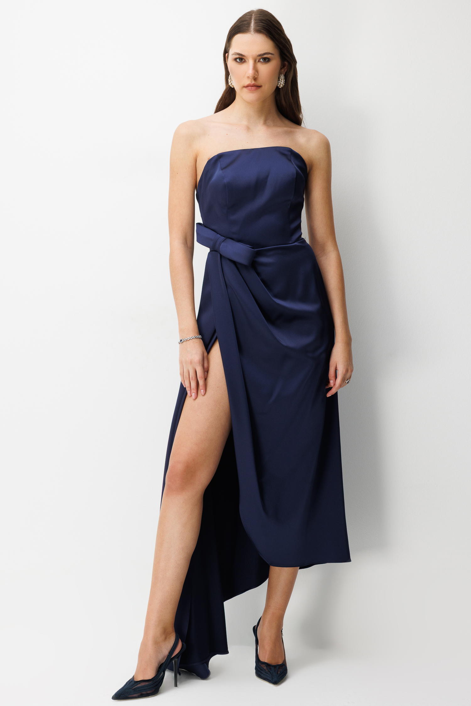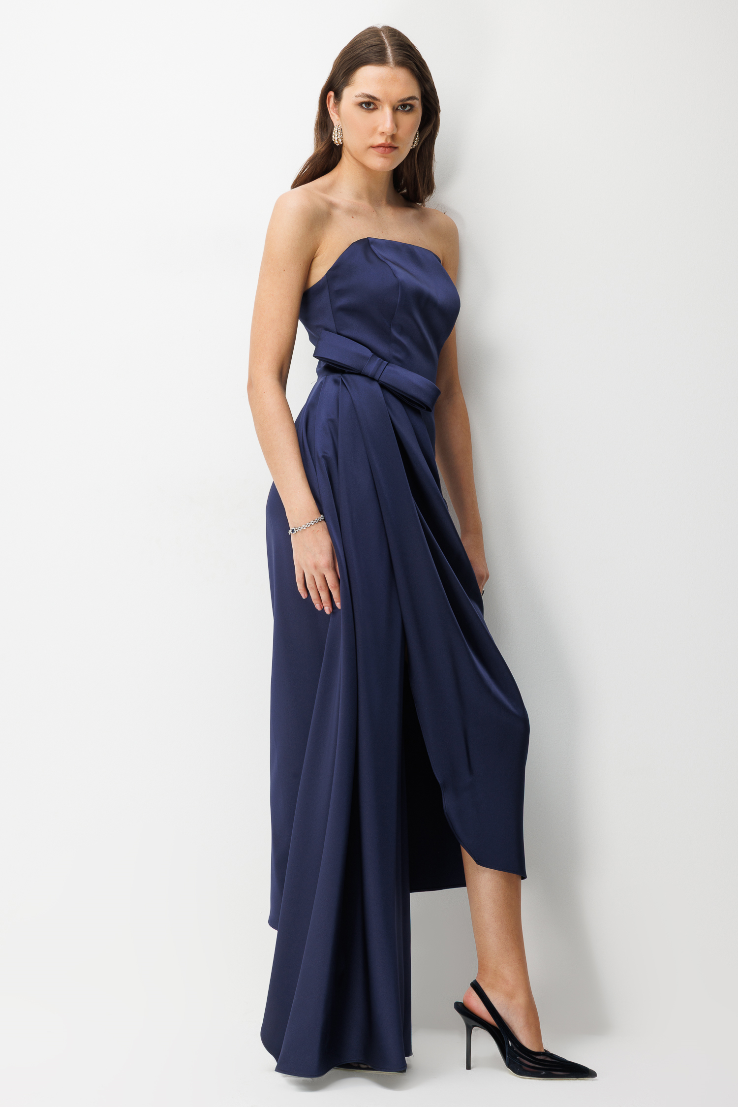 Straplez Fiyonk Detaylı Saten Maxi Elbise LACİVERT (26YNFL111-028)