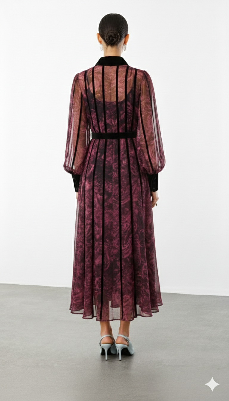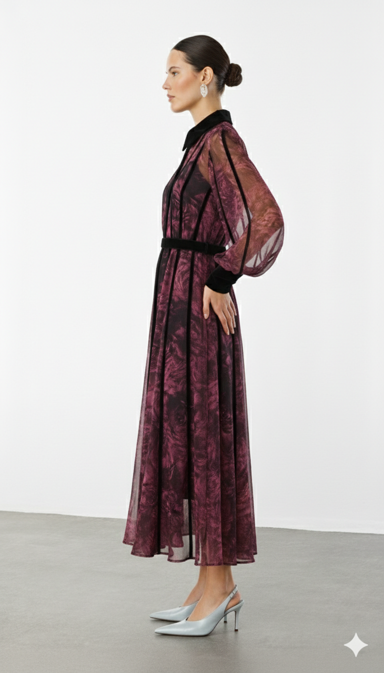 Ürün Açıklaması: Mürdümün en tutkulu tonuyla tanışın. Şifonun uçuş uçuş romantizmini siyah kadifenin ağırlığıyla dengeleyen bu elbise, stil sahibi kadınlar için tasarlandı. Yakasındaki ve gövdesindeki dikey kadife geçişler, elbiseye mimari bir şıklık katıyor. Hem klasik hem de modern bir duruş sergileyen bu tasarımı, ince topuklu ayakkabılarla tamamlayarak gecenin yıldızı olabilirsiniz.