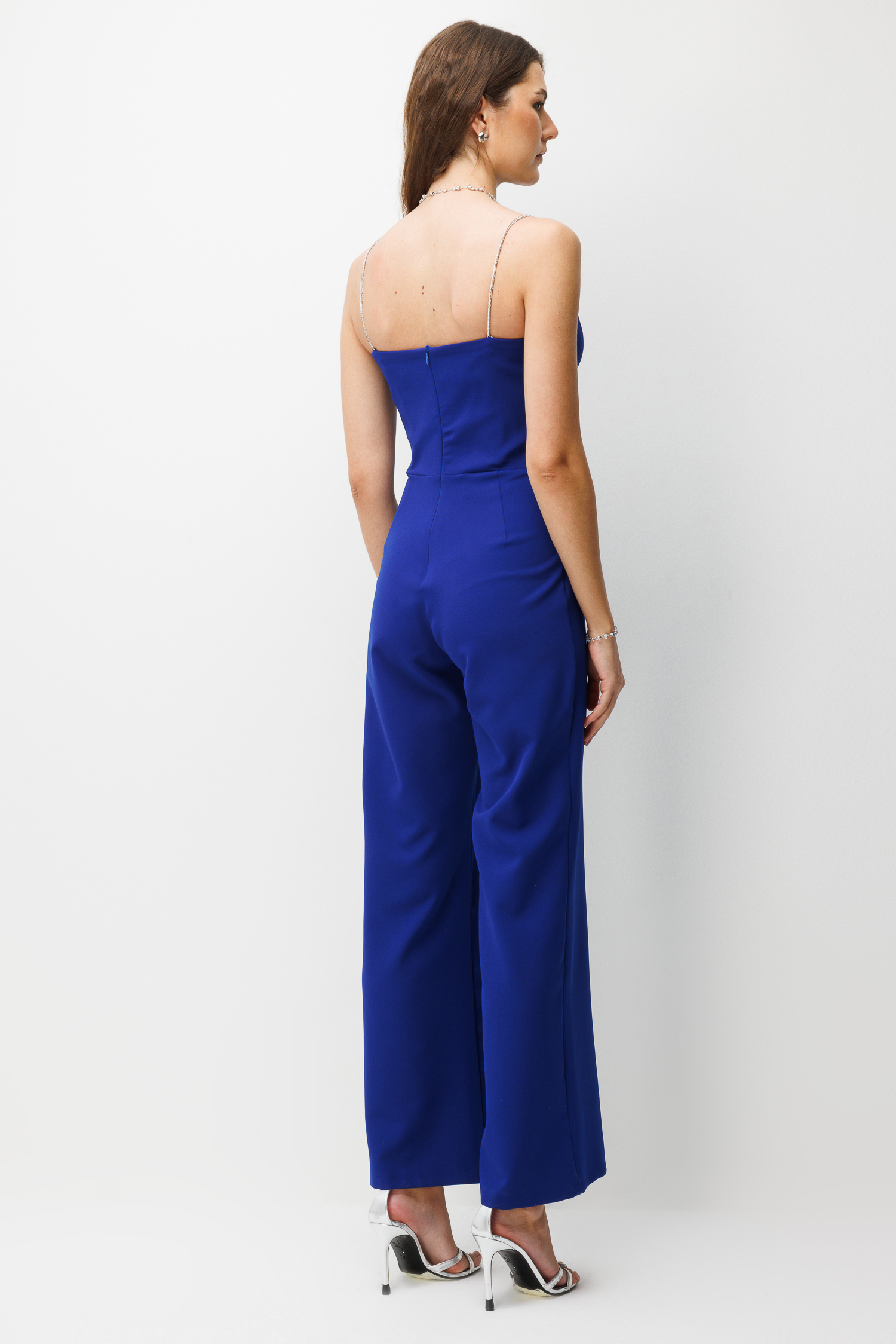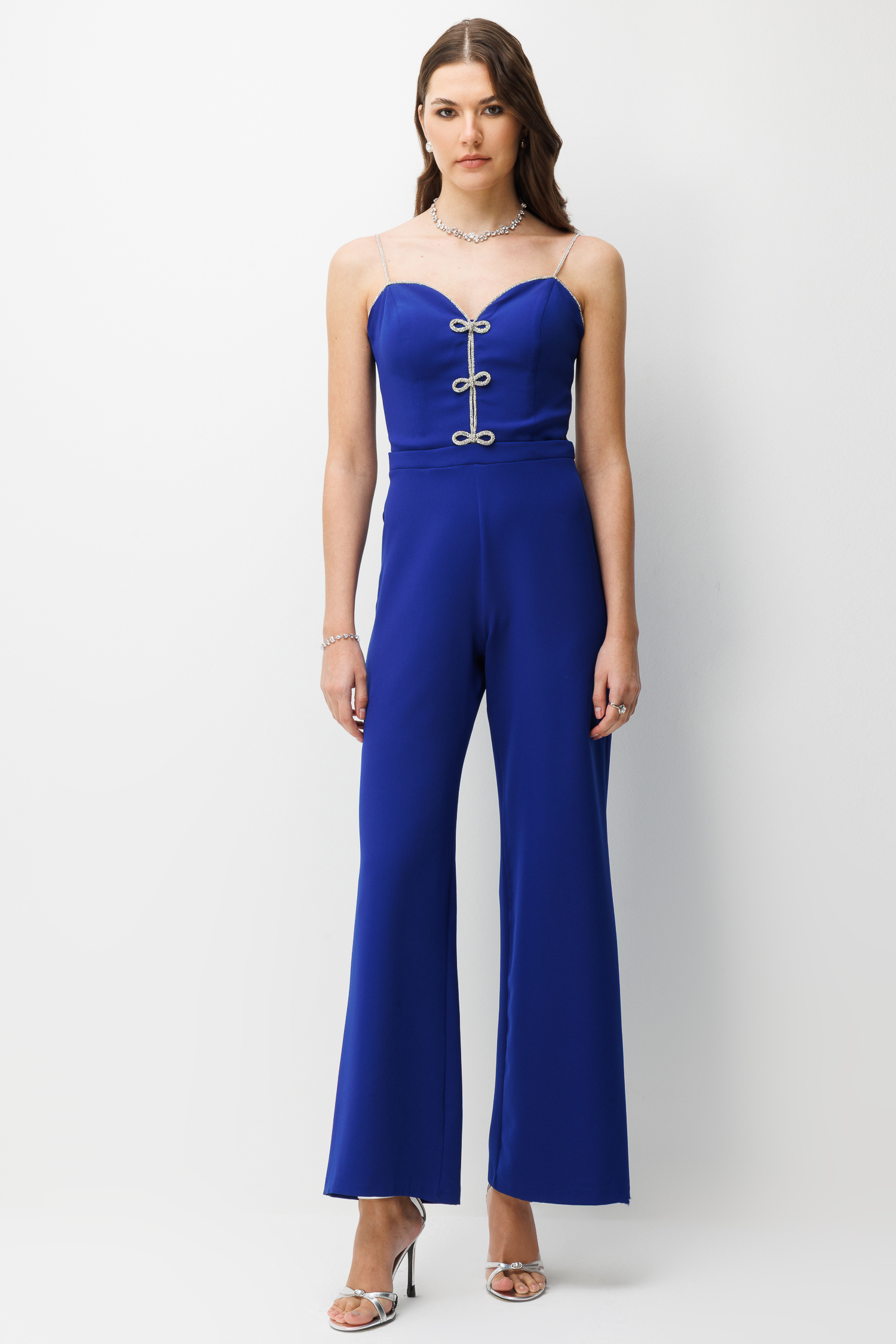 Bu tulum kendi başına bir "yıldız parça" olduğu için aksesuar kullanımında aşırıya kaçmana gerek yok. Metalik ya da ten rengi bir topuklu ayakkabı ve sade bir saç modeliyle tüm dikkatleri tasarımın üzerine çekebilirsin. Gala, düğün veya en iddialı davetler için kusursuz seçim.