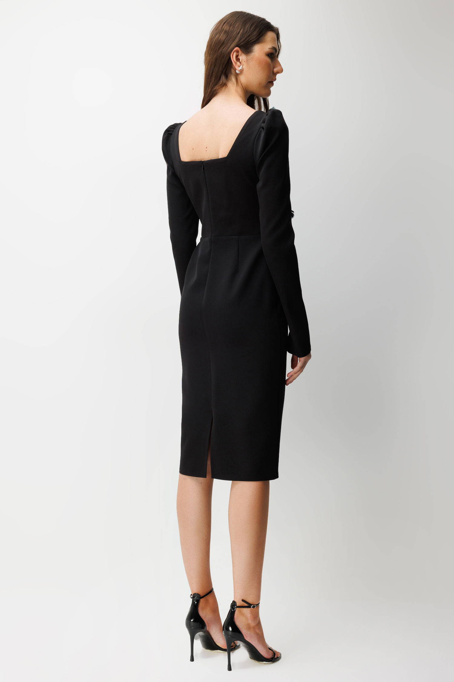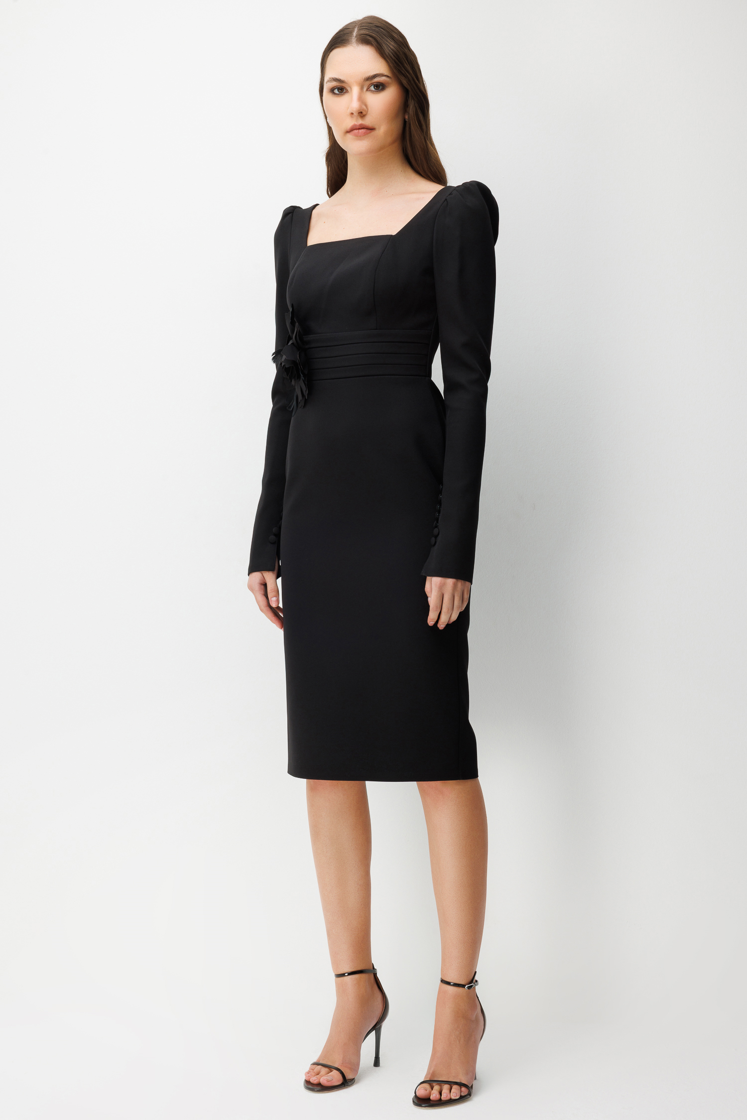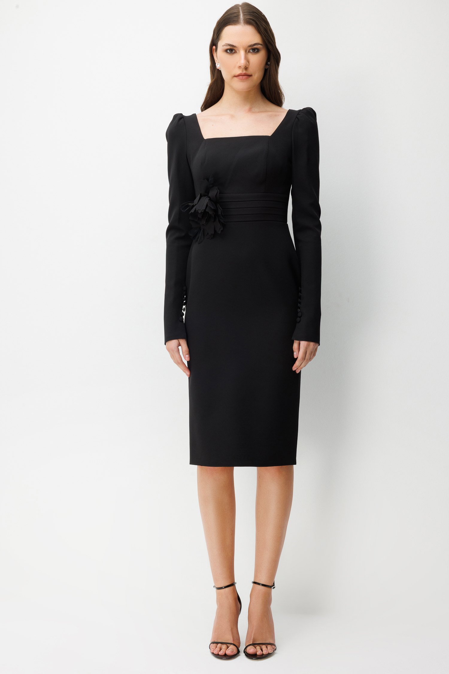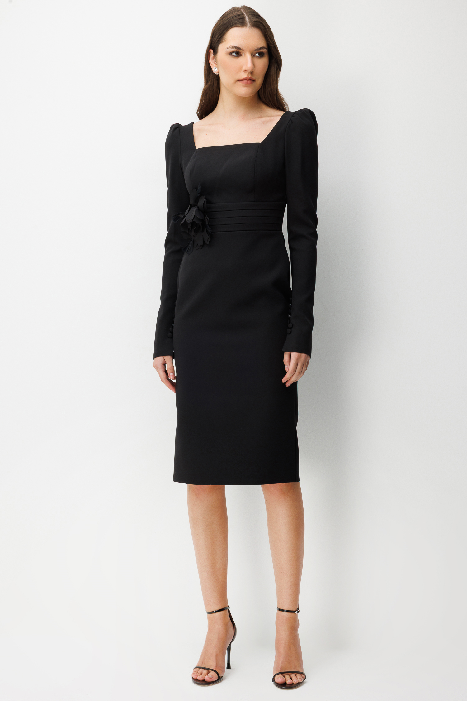Bu elbiseyi, görseldeki gibi zarif bir stiletto ve minimal küpelerle tamamlayarak monokrom bir şıklık elde edebilirsiniz. Güçlü omuz yapısı ve beldeki çiçek detayı sayesinde ek bir aksesuara ihtiyaç duymadan çabasız bir zarafet sunar.