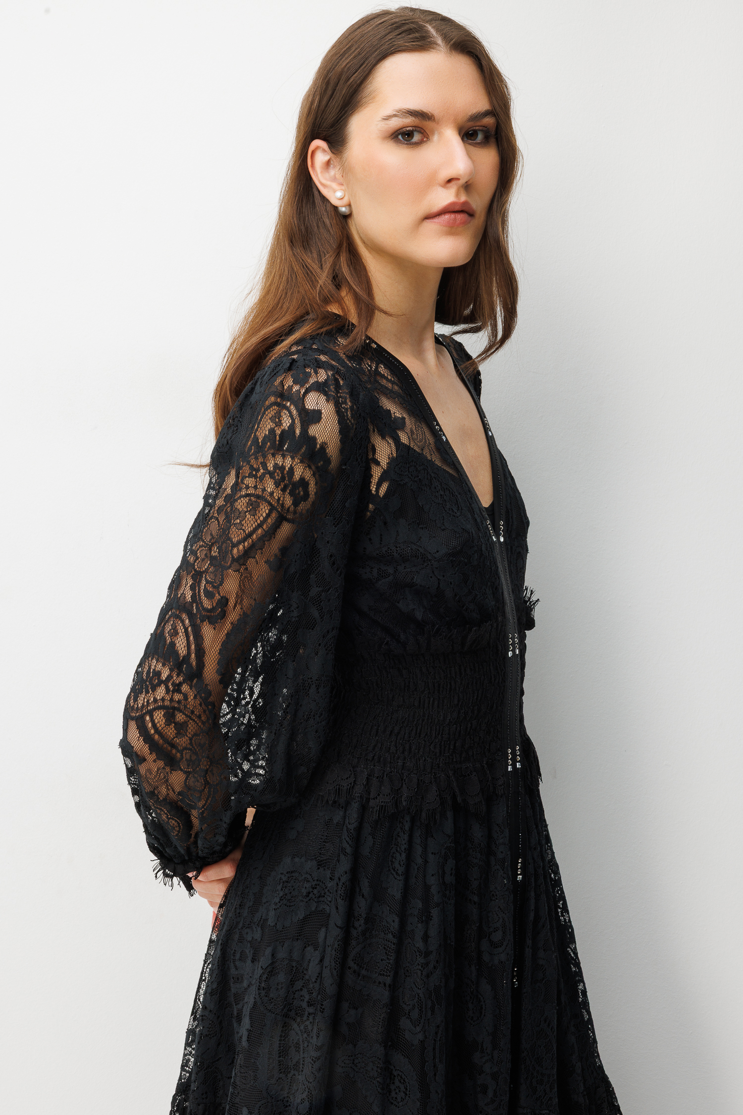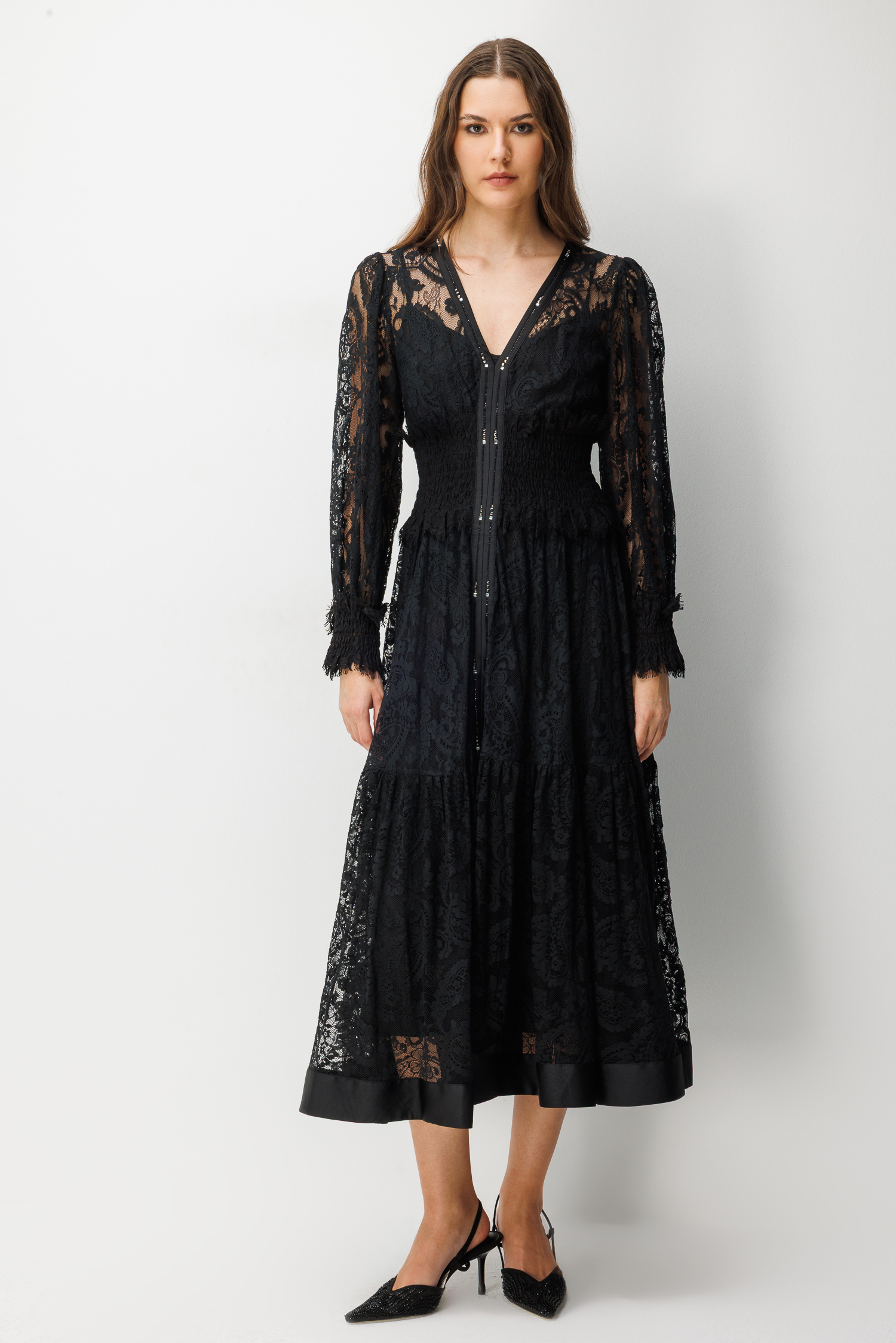 Siyahın asaletini dantelin romantik dokusuyla buluşturan Nefeli Gece Büyüsü, gardırobunuzun en ikonik parçası olmaya aday. V yaka kesimi ve transparan kol detaylarıyla zenginleştirilen bu tasarım, bel hattını vurgulayan özel dikiş yapısı sayesinde kusursuz bir silüet sunar.