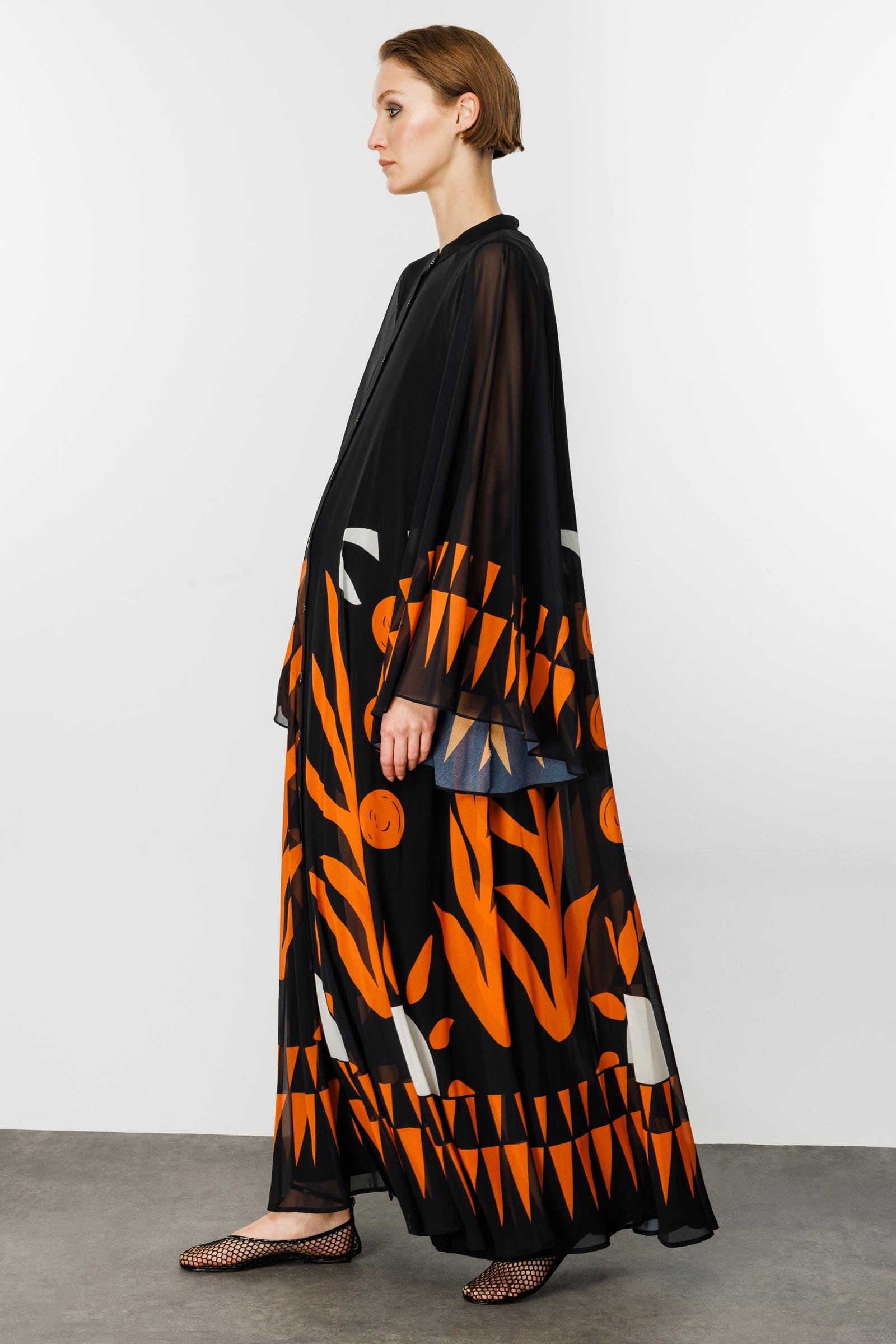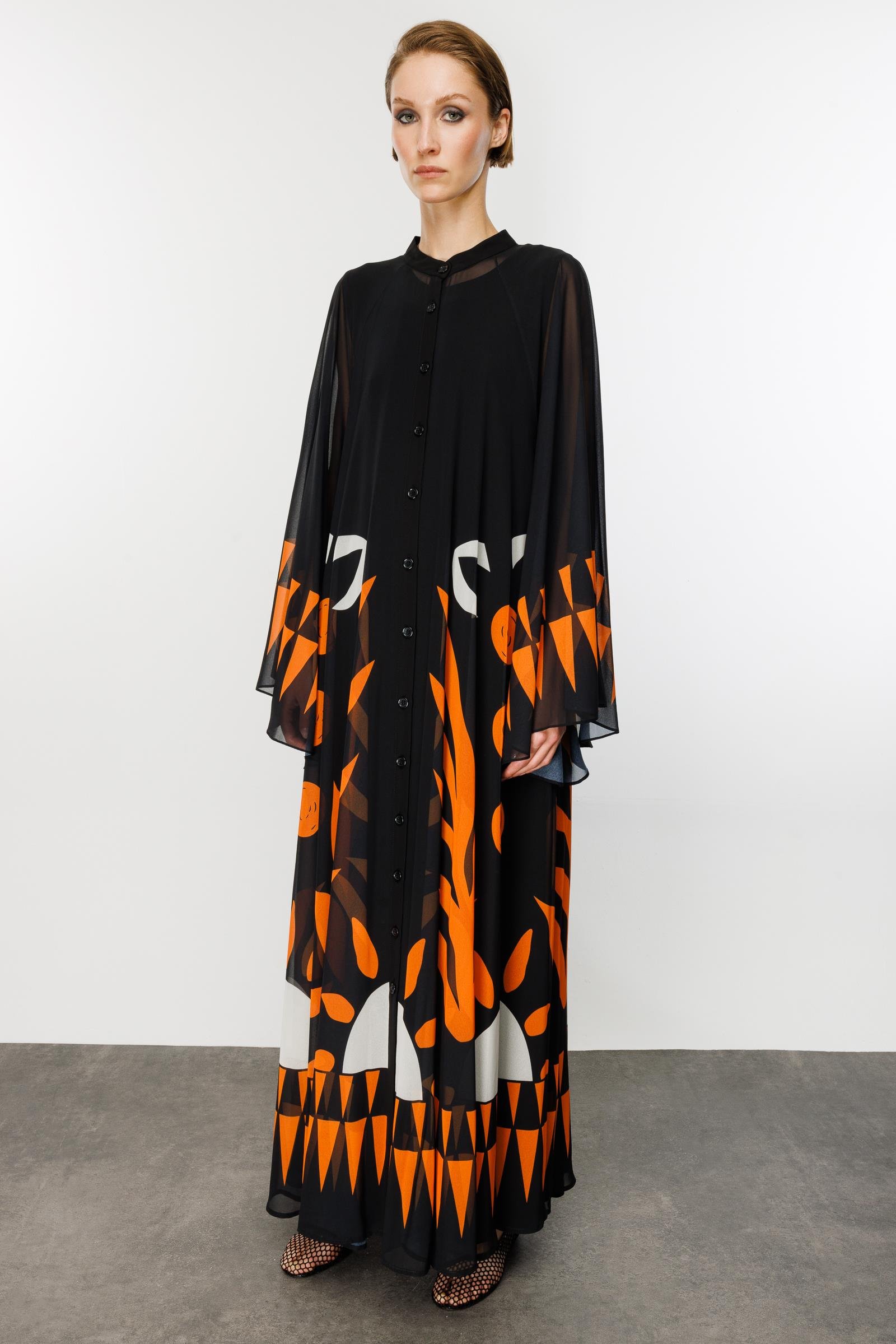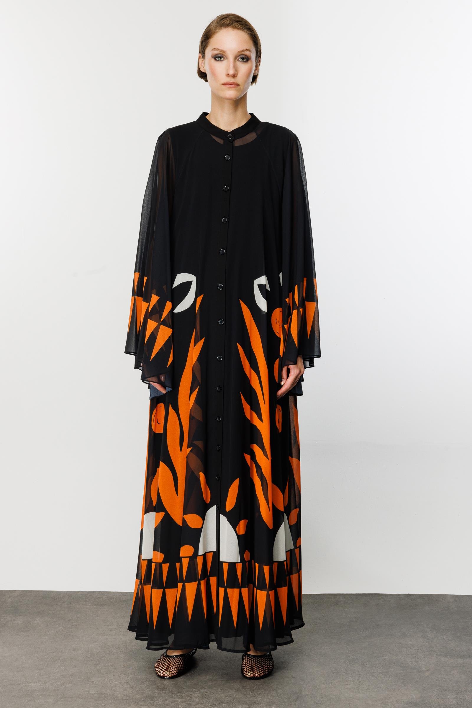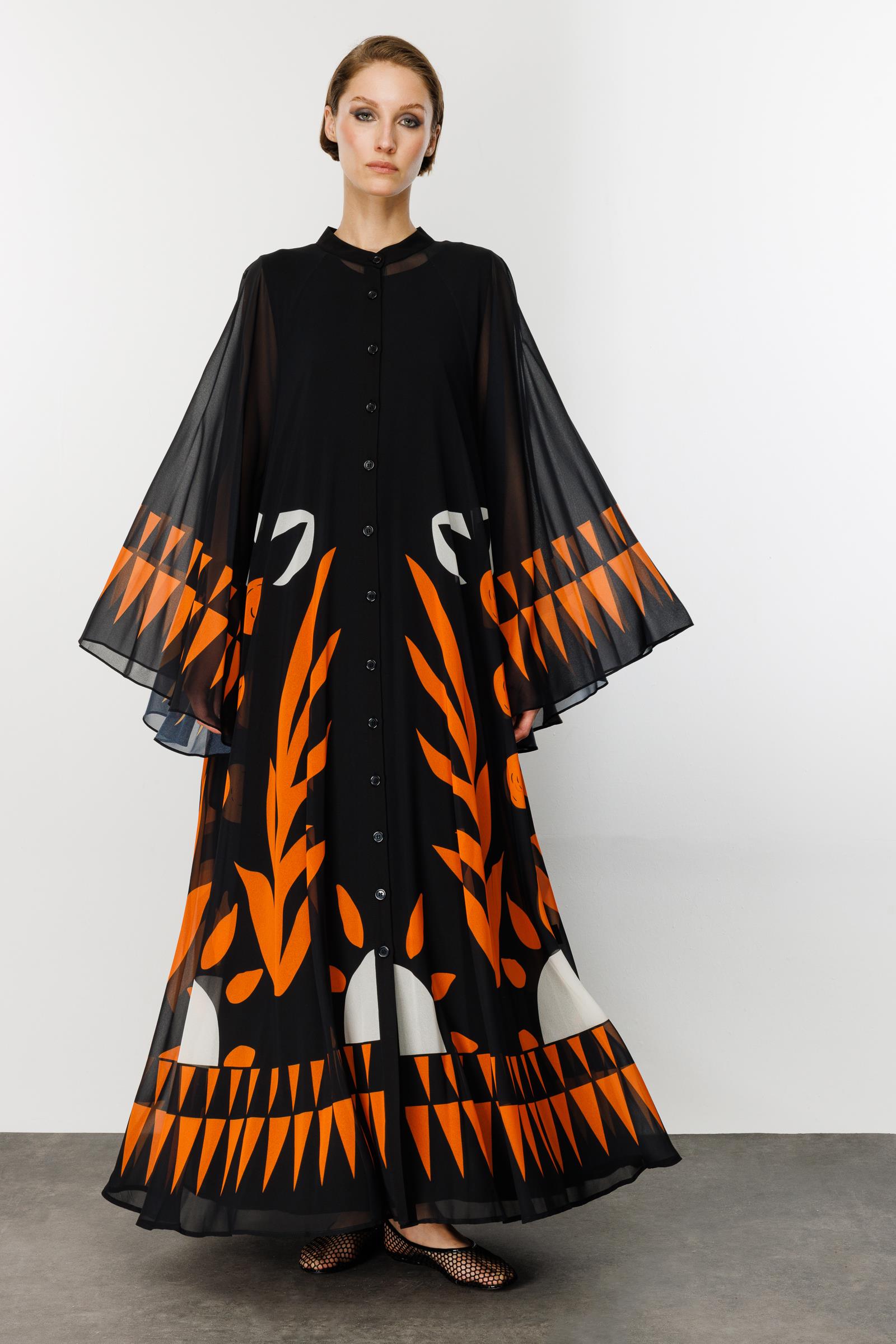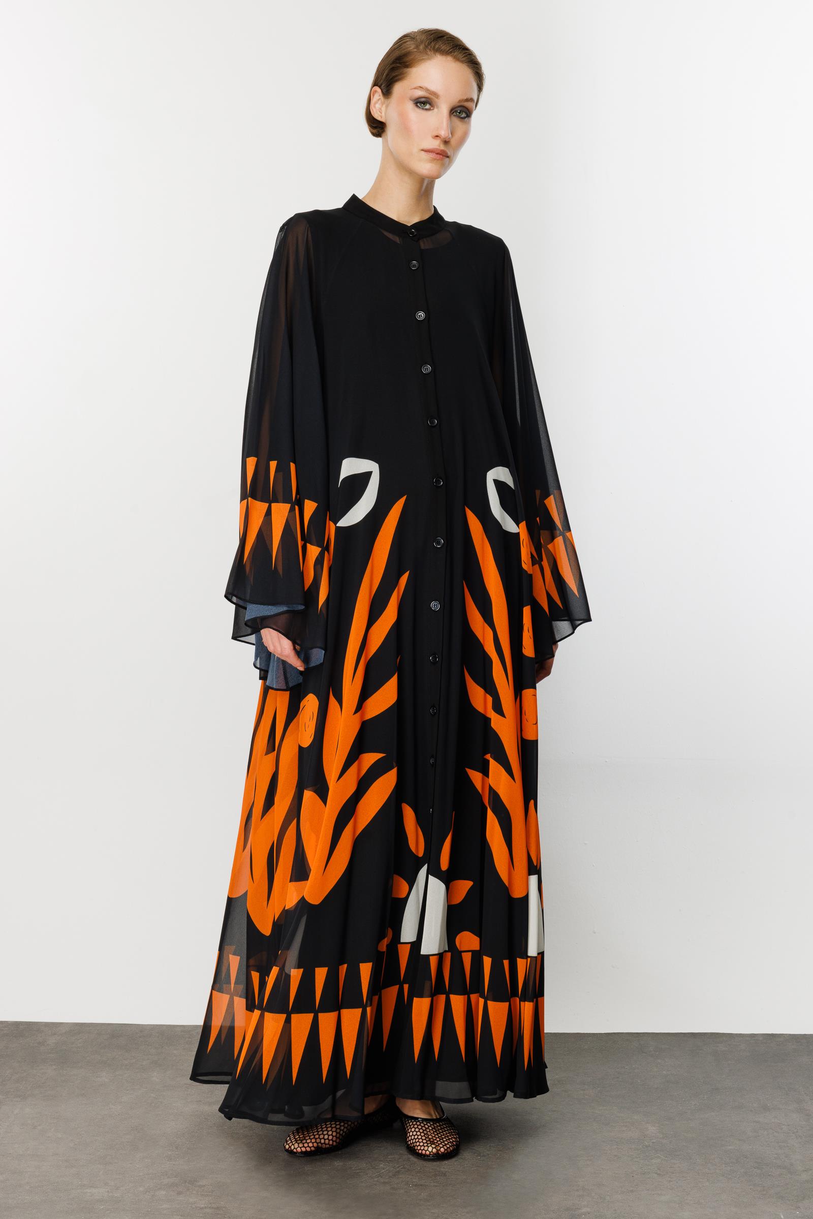 Stilinizi sanatsal bir dokunuşla ifade edin! Siyahın asaleti ile turuncunun enerjisini buluşturan bu maxi elbise, gardırobunuzun en çarpıcı parçası olmaya aday. Modern soyut desenleri ve dökümlü silüeti ile hem günlük şıklıkta hem de özel davetlerde zahmetsiz bir zarafet sunar. Hakim yakası ve boydan düğme detayıyla modern bir duruş sergilerken, hafif kumaşı sayesinde gün boyu konfor sağlar.