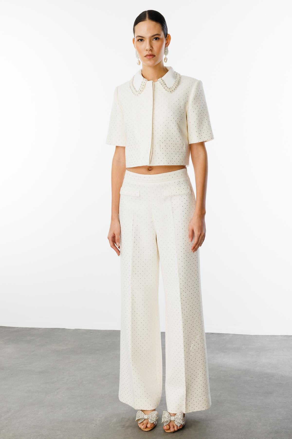 Meet this unique suit from Nefelisstore's newest collection that will reflect your sparkle in your special moments and daily style! The bebe collar stoned suit and stoned trouser set brings elegance and comfort together, offering you an unforgettable experience.