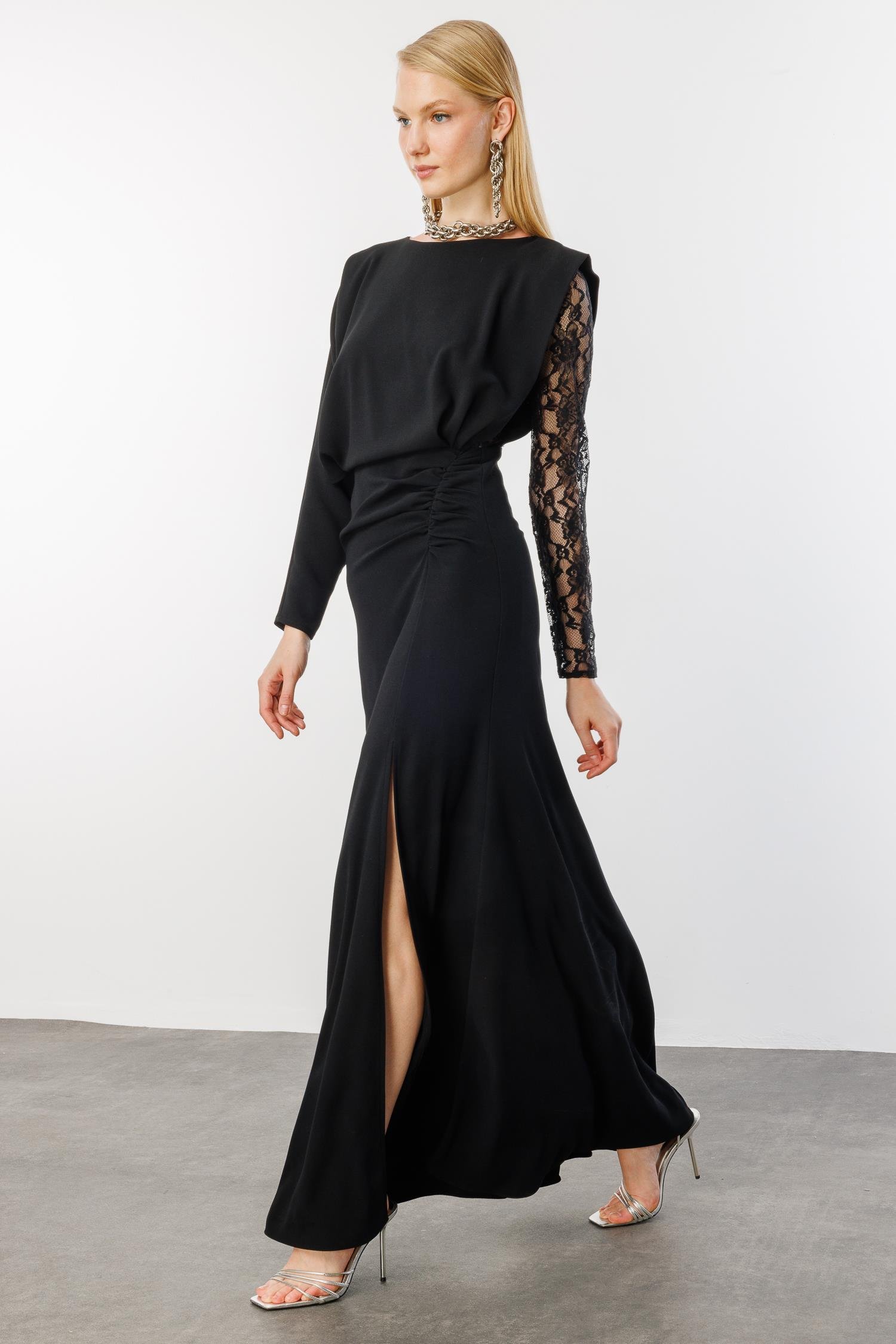 Product Features: Collar: Round neck Sleeve Length: Long sleeve with lace detail on one arm Length: Maxi length Detail: Lace detail on one arm, asymmetrical cut, slit detail Fabric: [Fabric type can be specified] Care Instructions: Dry Cleaning Model Measurements: Bust: 82 cm Waist: 60 cm Hip: 90 cm Height: 1.78 cm Size: 36