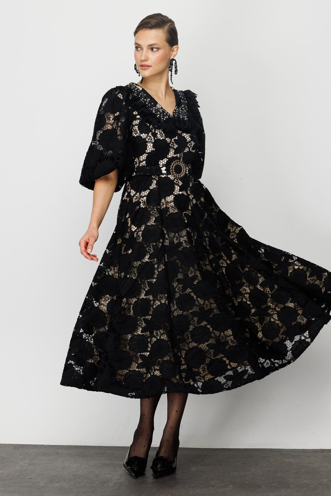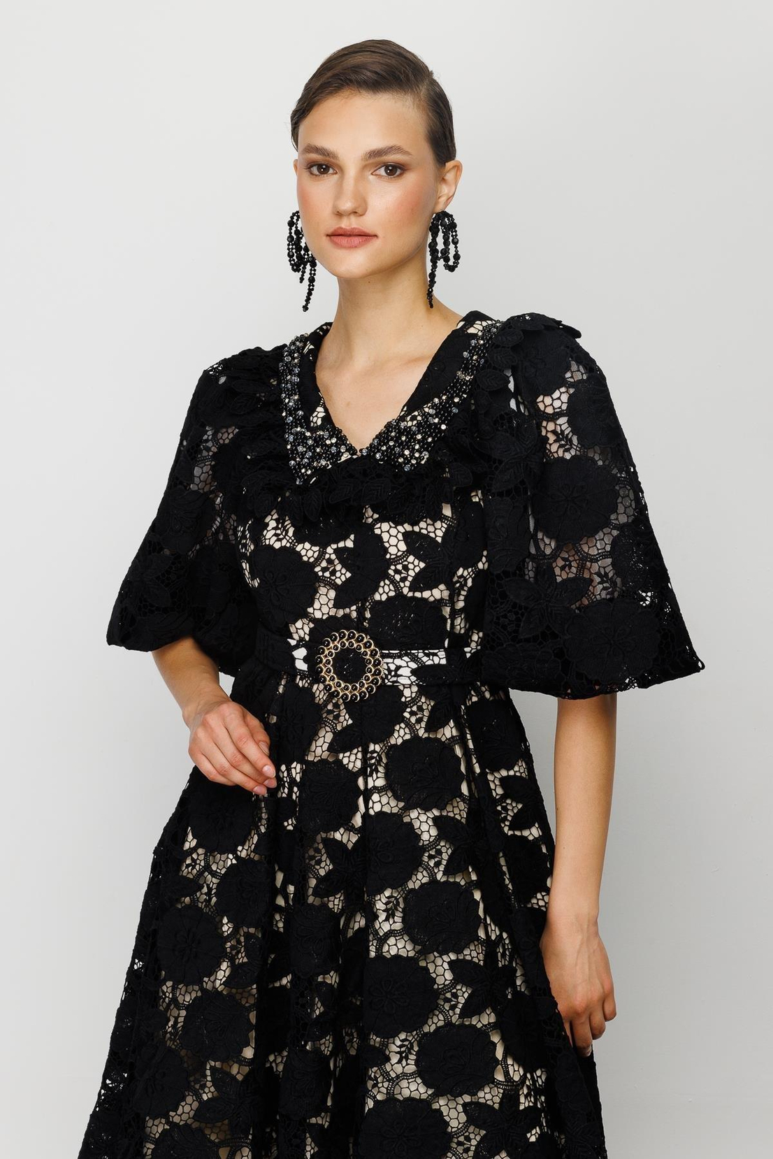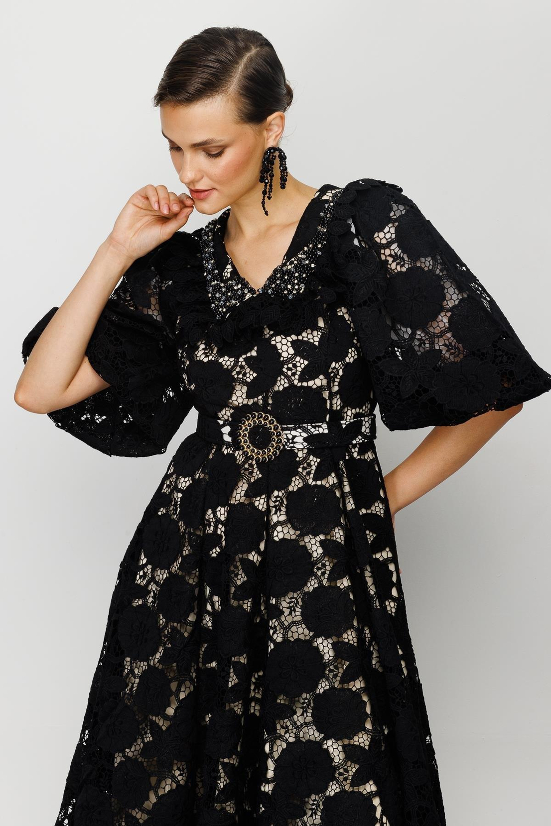 Nefeli Black Dress with Stone Embroidery Collar, Balloon Sleeves, Black Lining Nefeli Womens Stone Embroidered Collar Balloon Sleeve Ecru Dress Nefeli Womens Stone Embroidered Collar Balloon Sleeve Black Dress