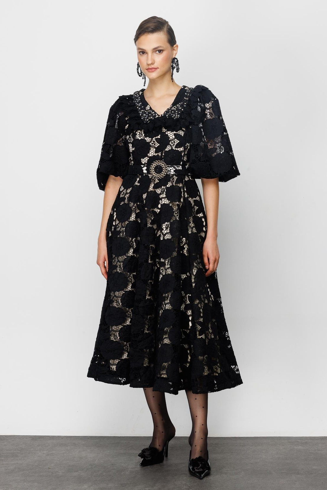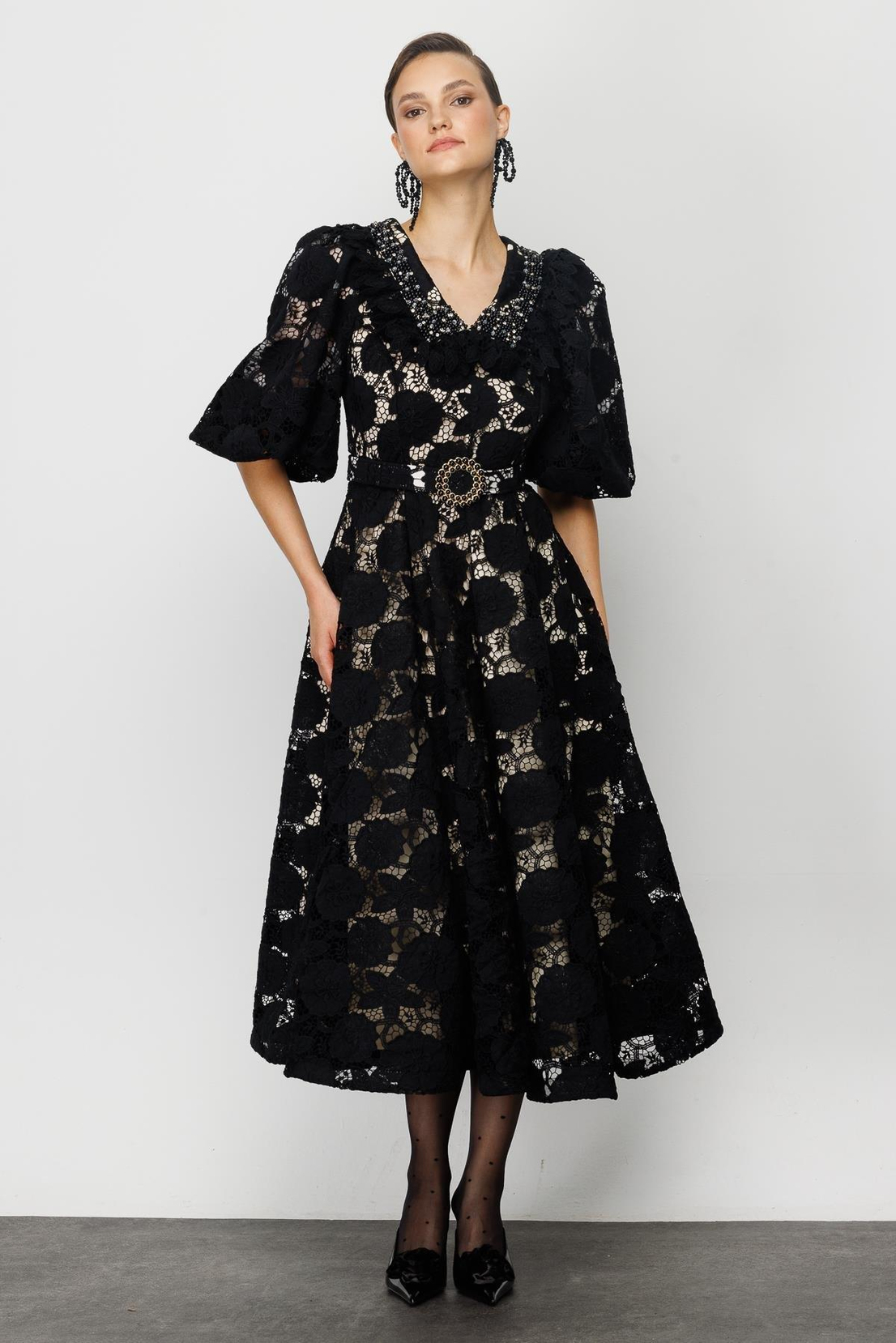 Nefeli Women's Stone Embroidered Collar Balloon Sleeve Black Dress (24K-NFL1748-002)