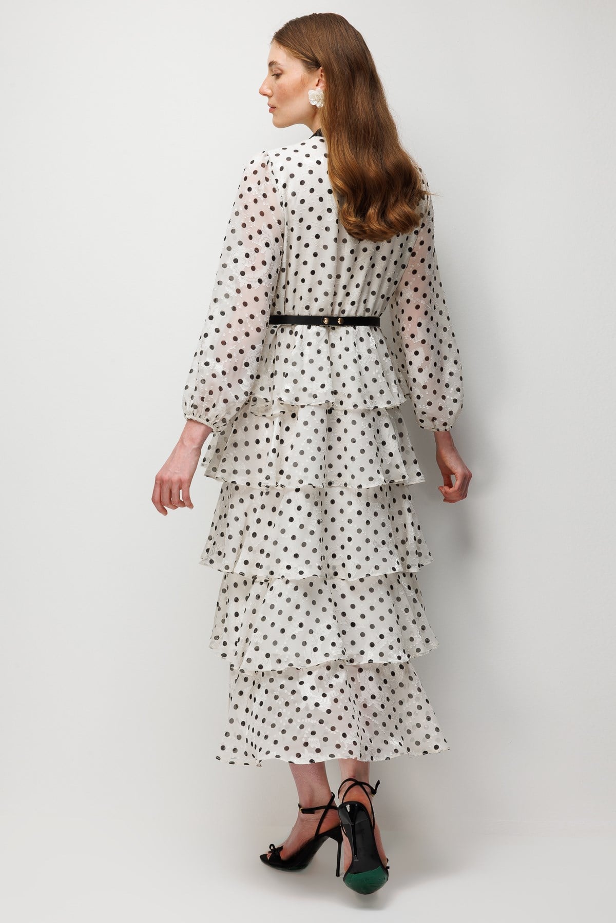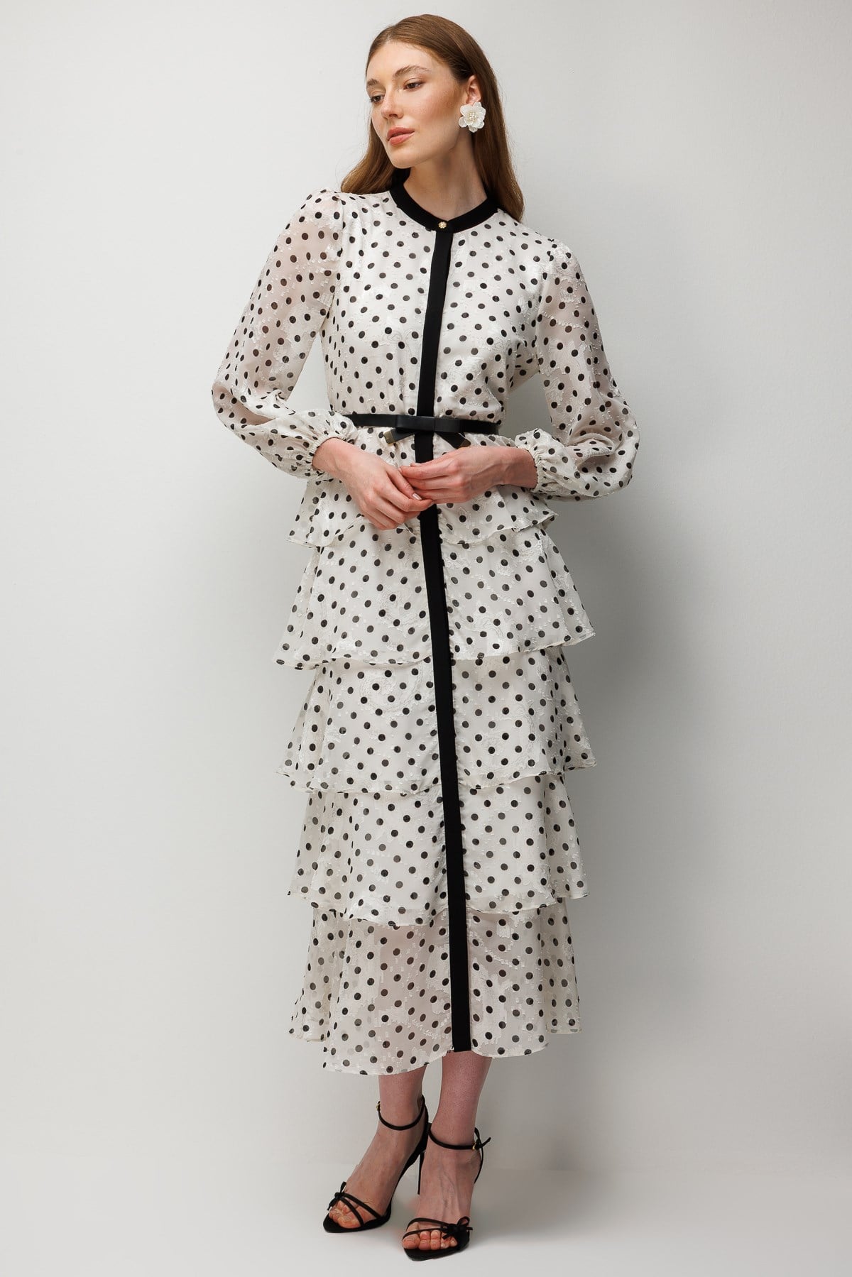 Its tiered skirt and contrasting collar details offer a look that is both sophisticated and effortlessly playful.
