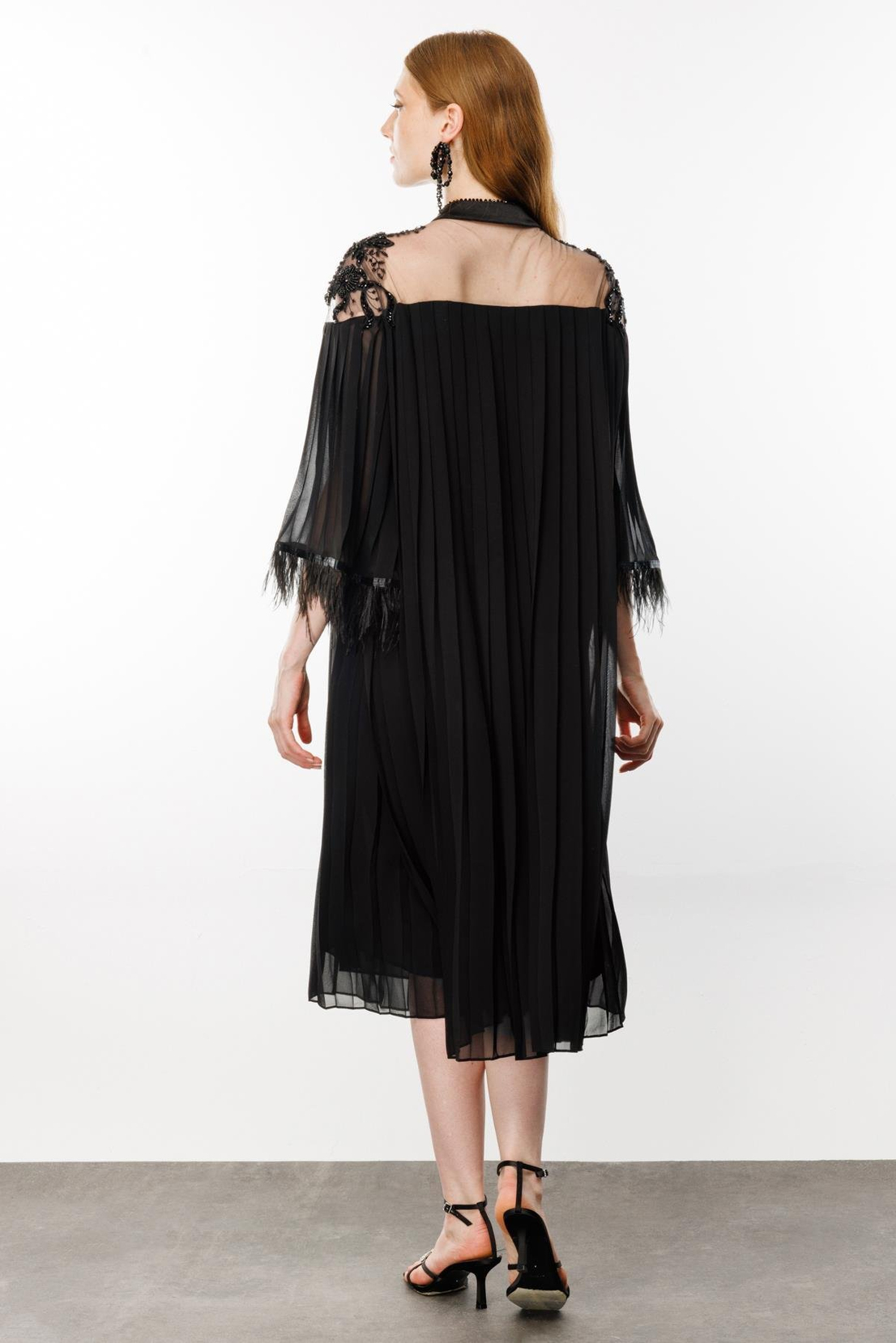 Feathered Armhole Pleated Dress BLACK Pleated Dress with Feathered Armholes POWDER