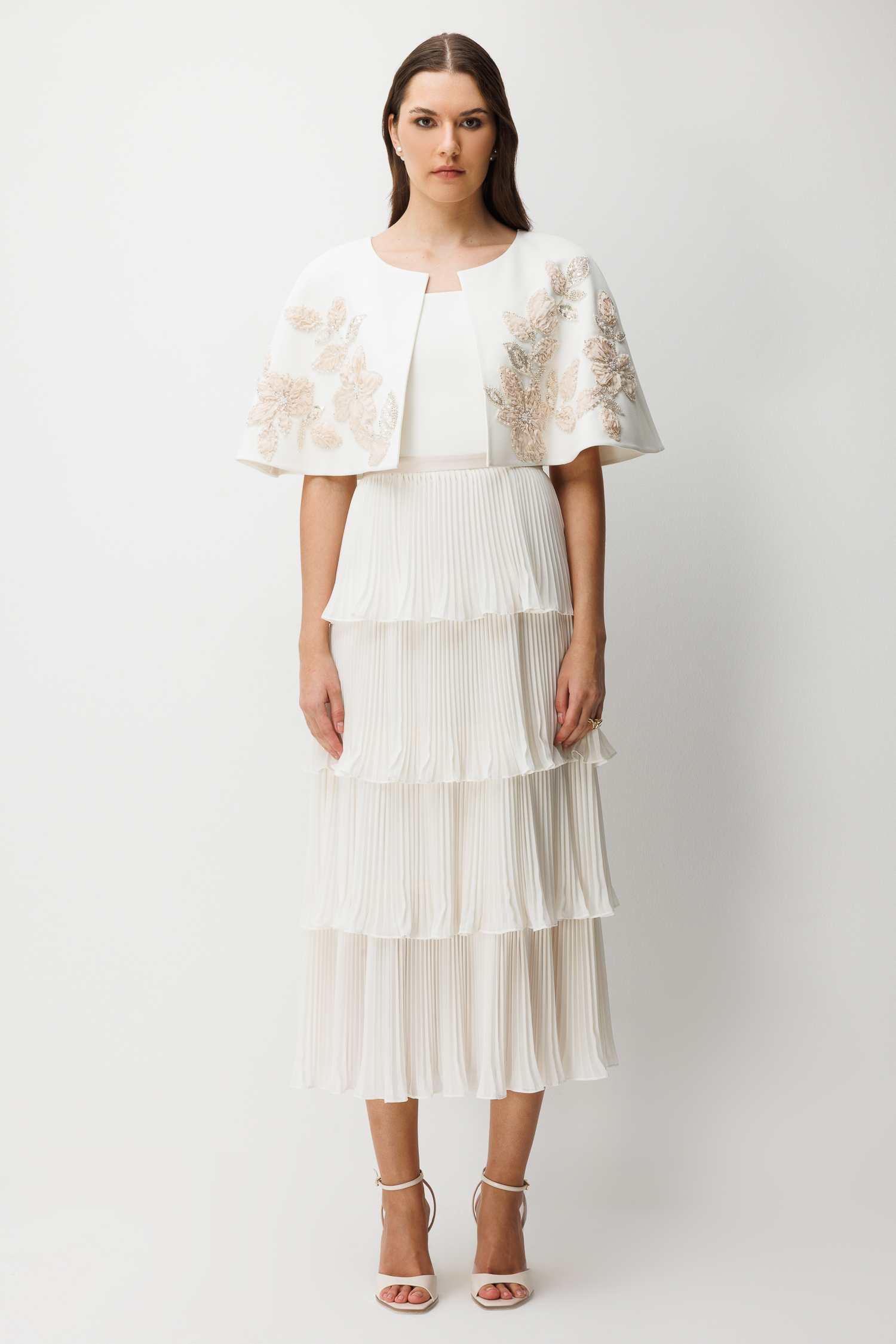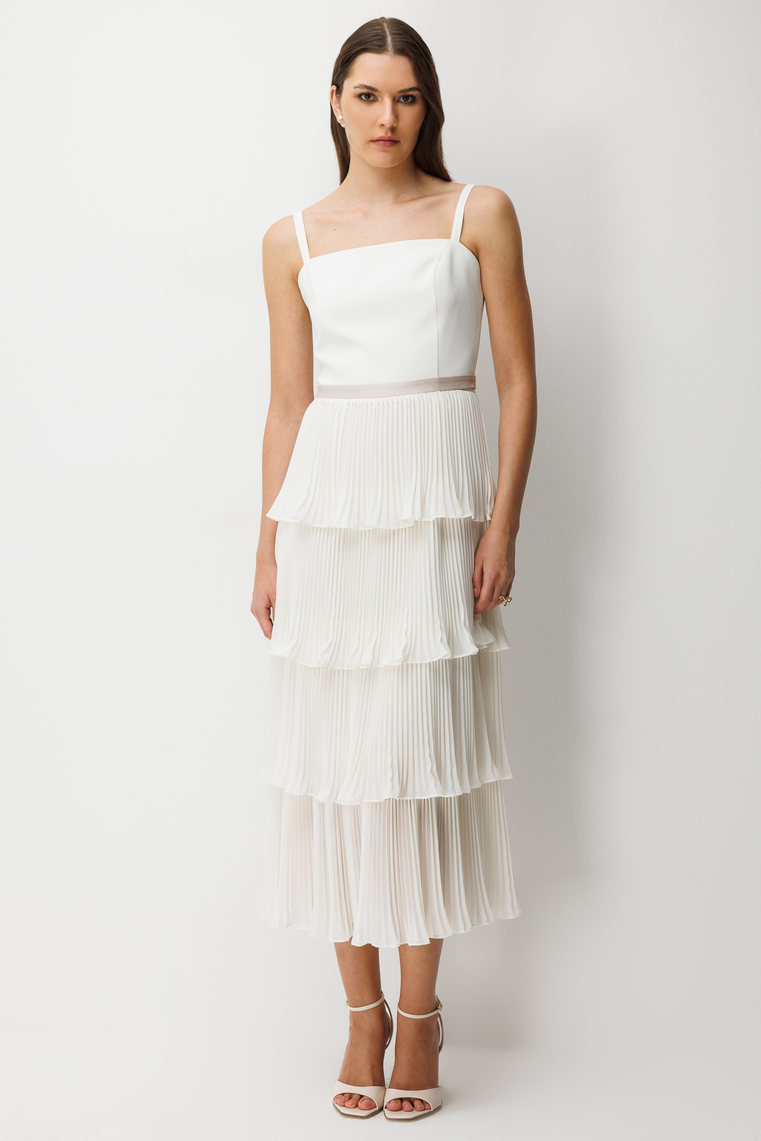 Pleated Dress: The lower part of the dress features micro-pleats throughout. The tiered construction ensures stunning fluidity and dynamism with every movement.
