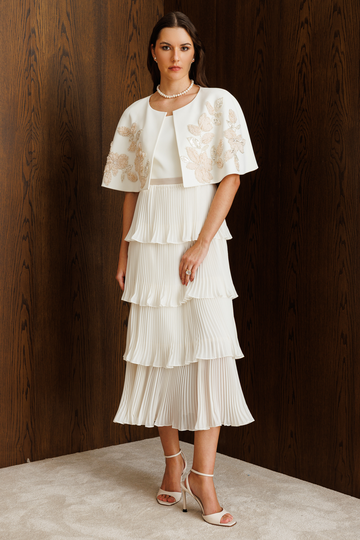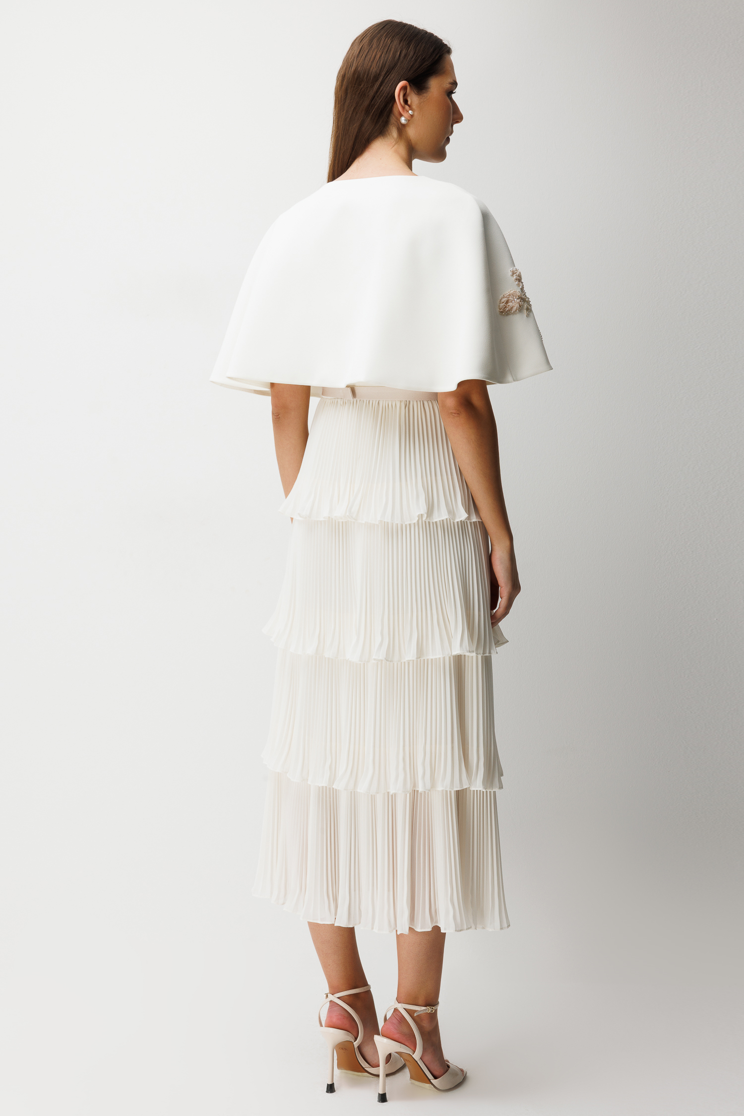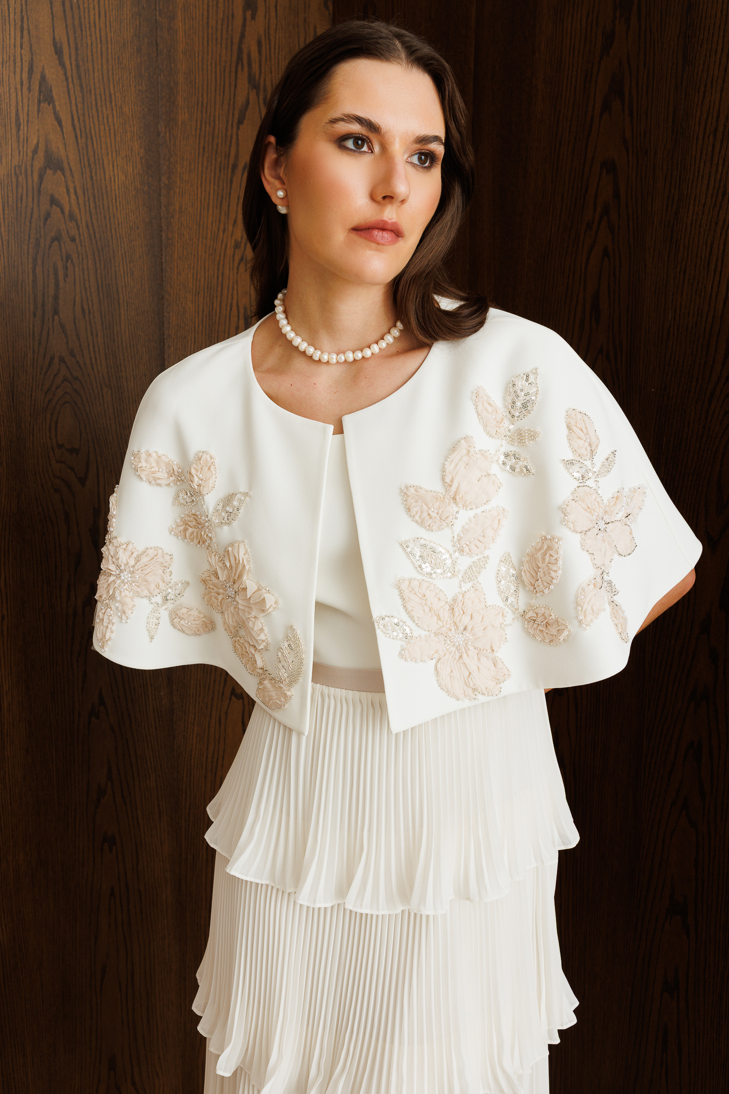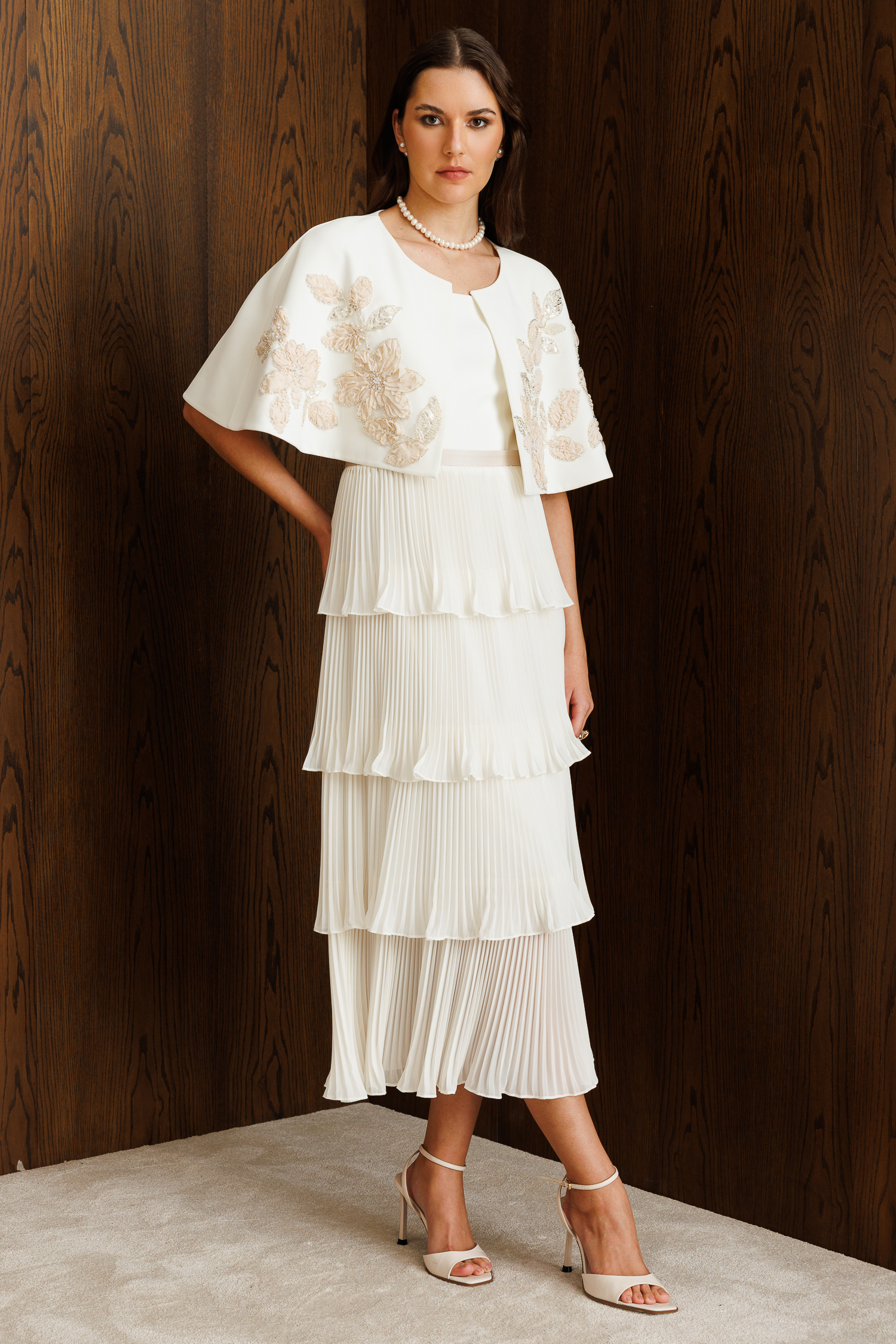 Experience elegance in its purest form. Blending a modern silhouette with romantic details, this two-piece set is designed to create a captivating look for weddings, engagements, or exclusive galas. Its fluid pleats and artisanal-feel embroideries add a poetic and artistic touch to your style.