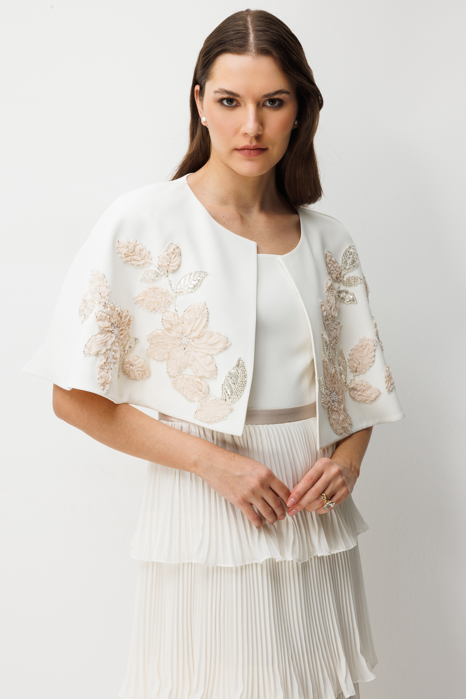 Closure: Open-front bolero; the dress features a concealed back zipper.