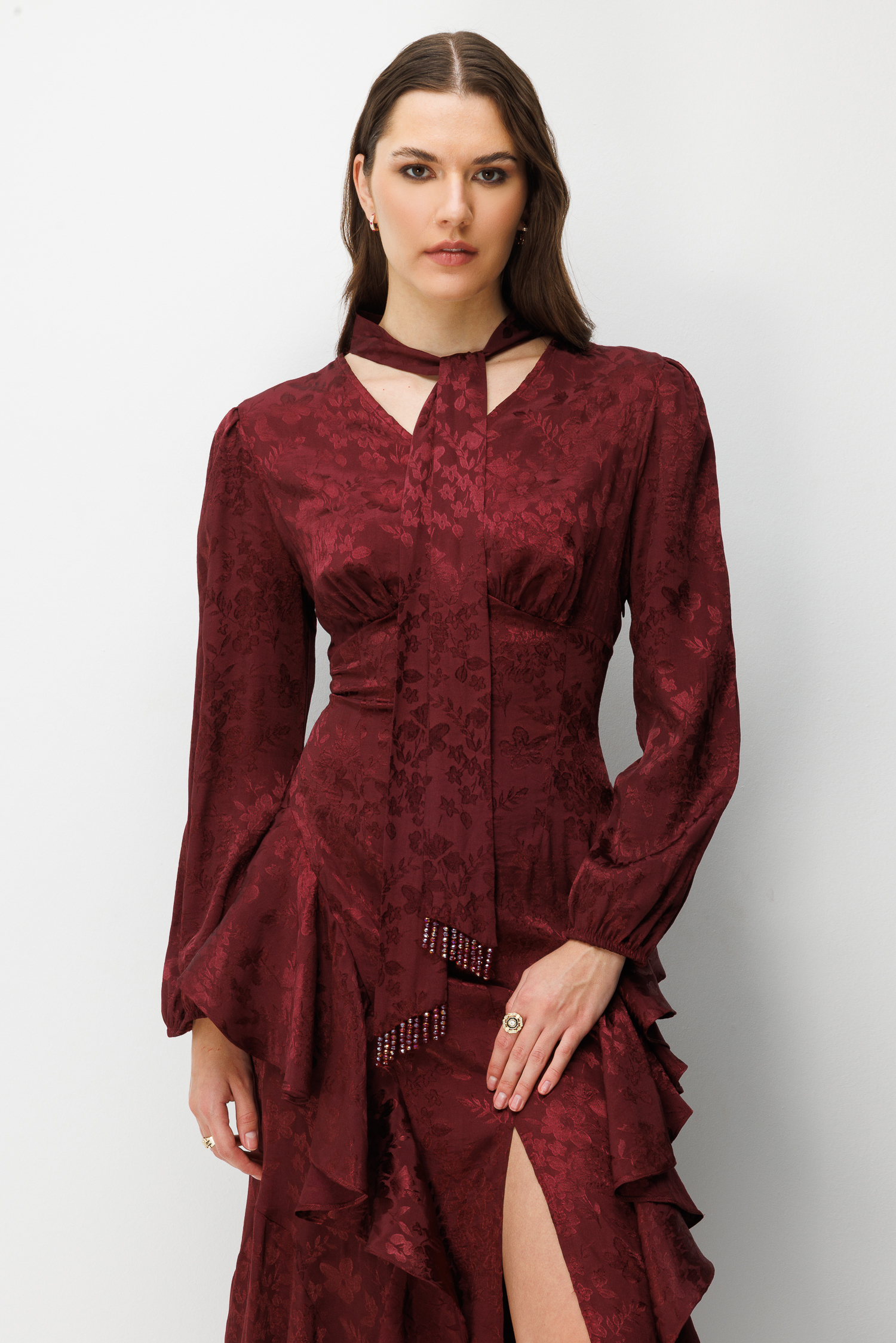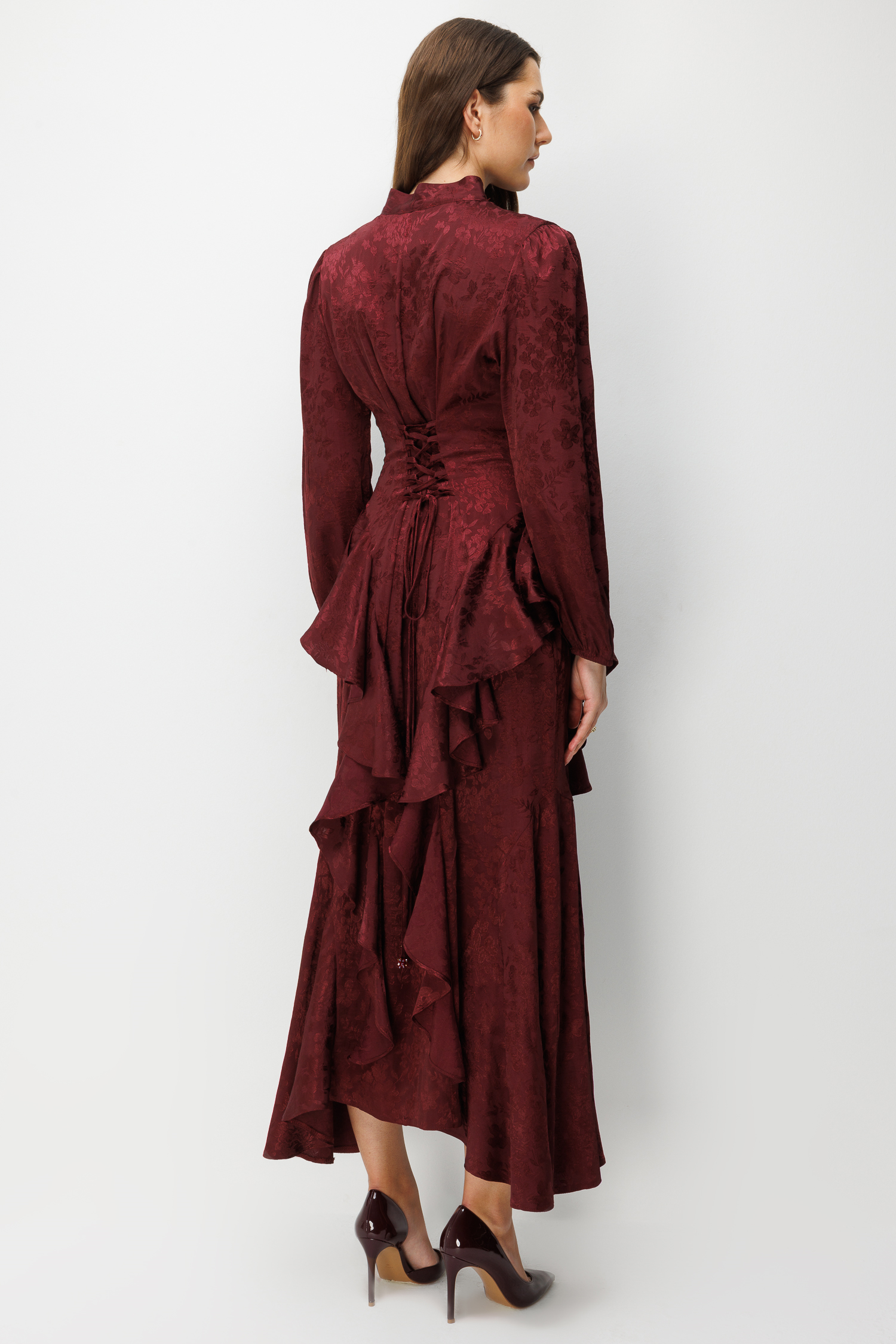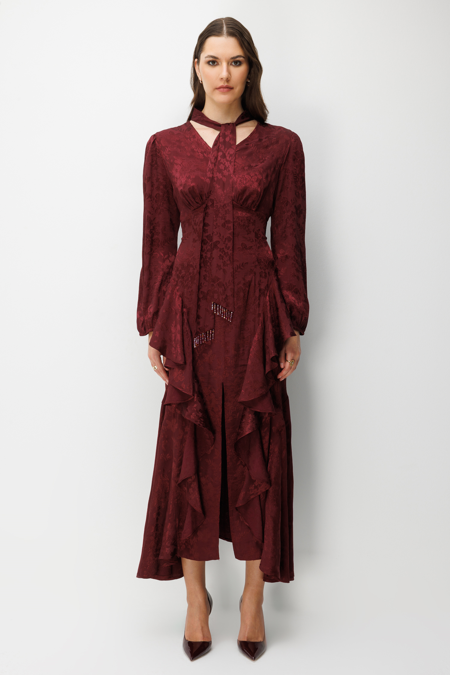 V Yaka Detaylı Volanlı Jakar Elbise BORDO (26Y3316-014)