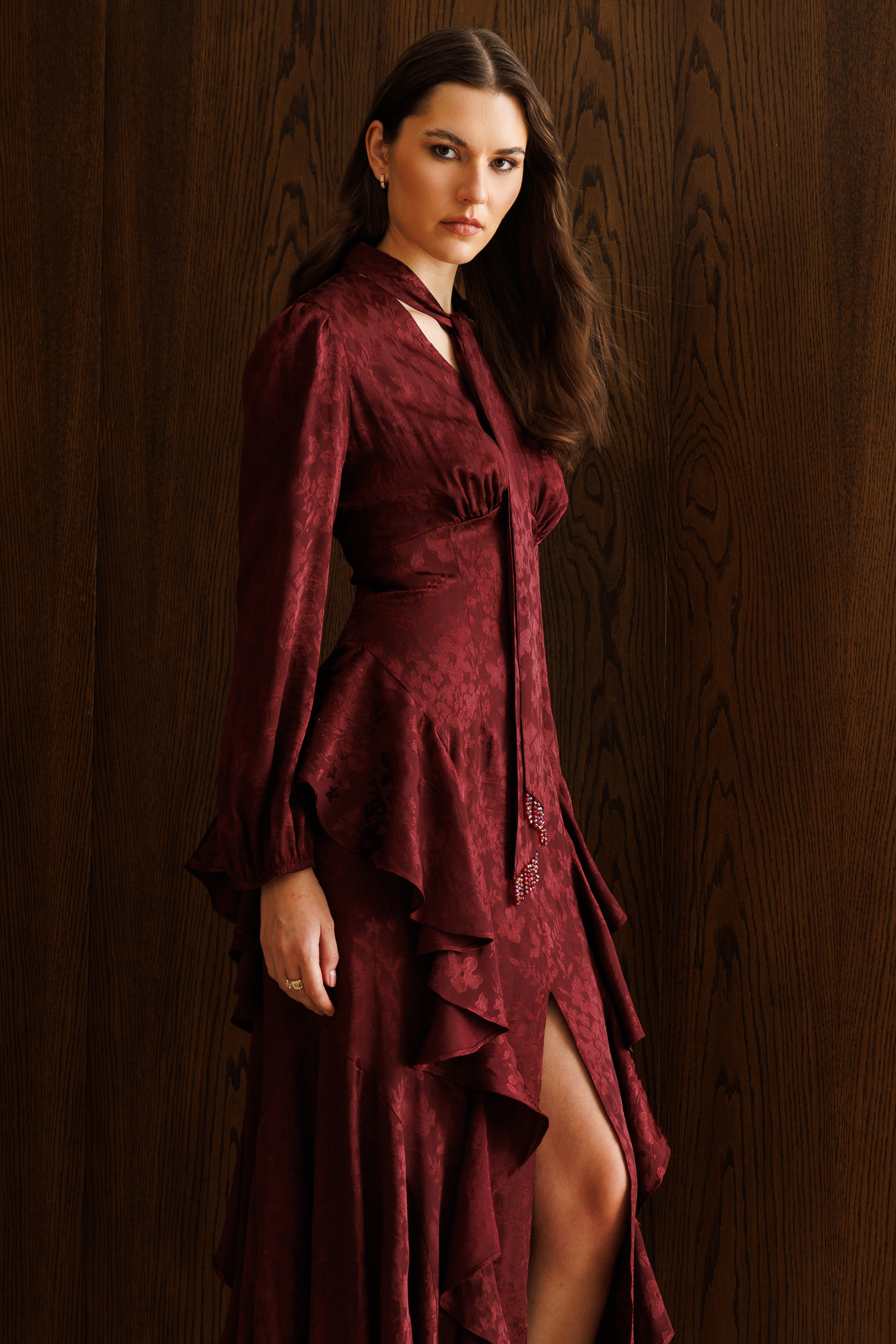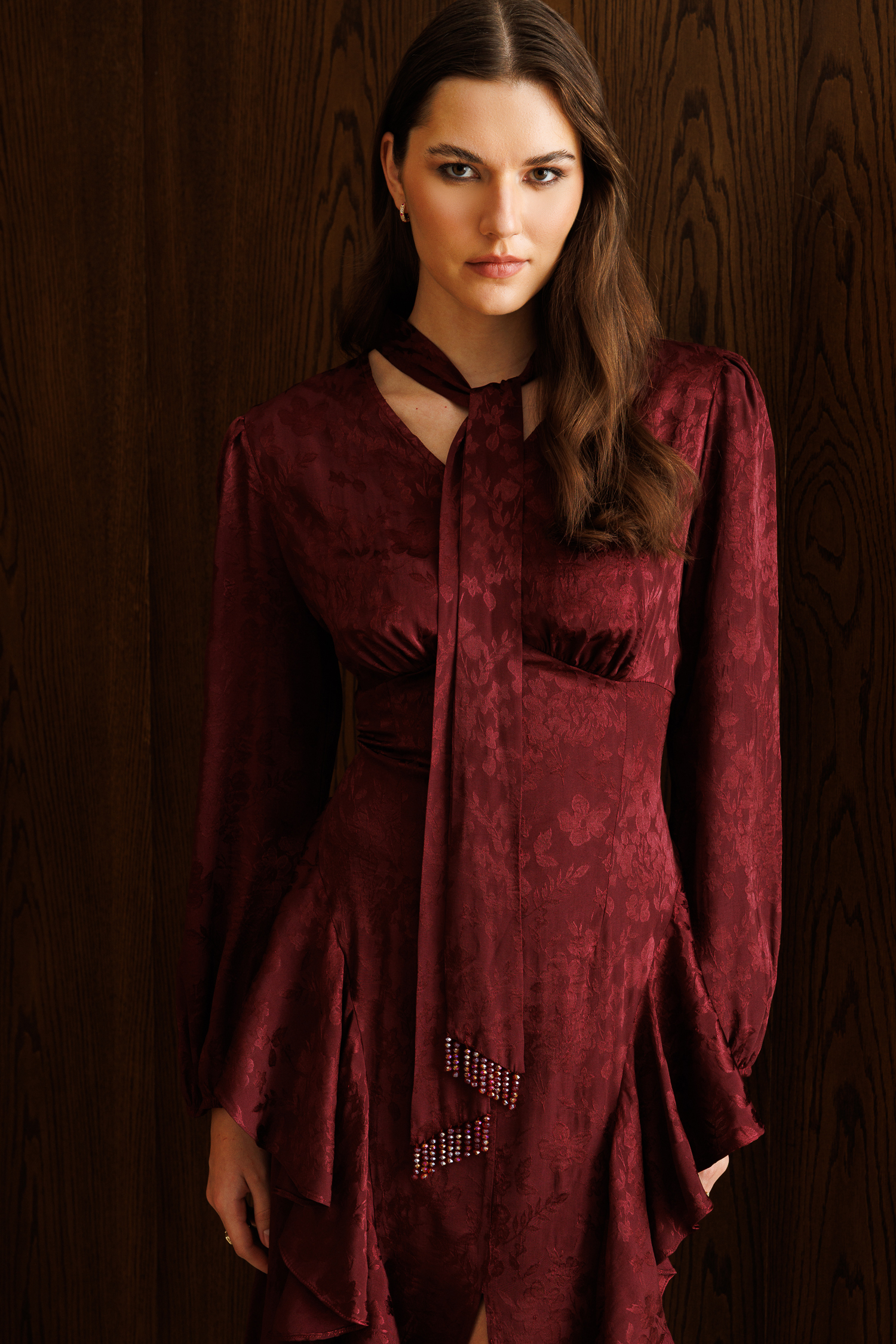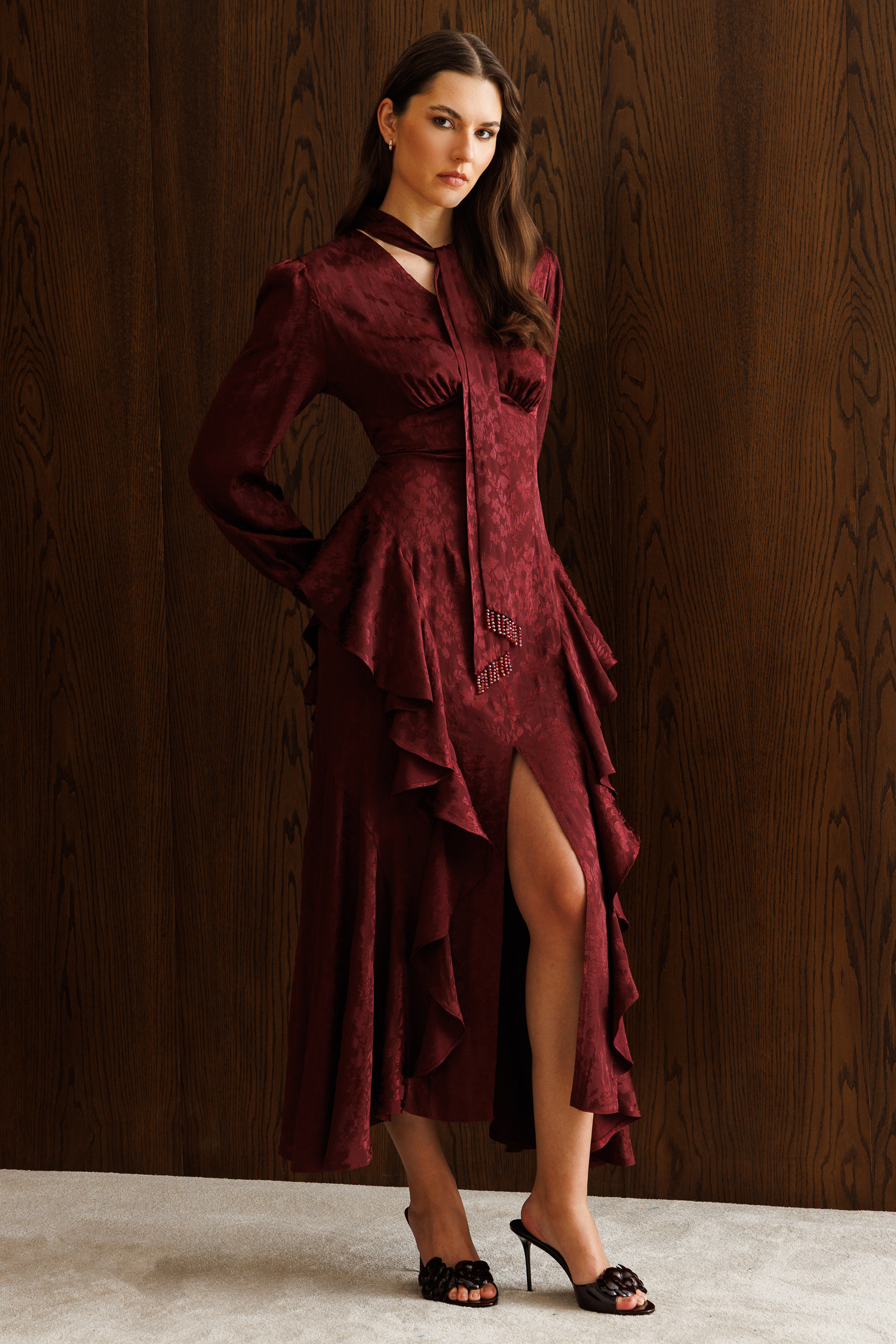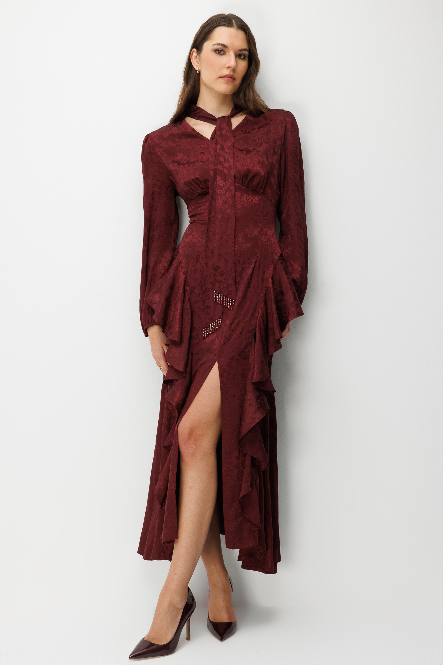 V Yaka Detaylı Volanlı Jakar Elbise BORDO (26Y3316-014)