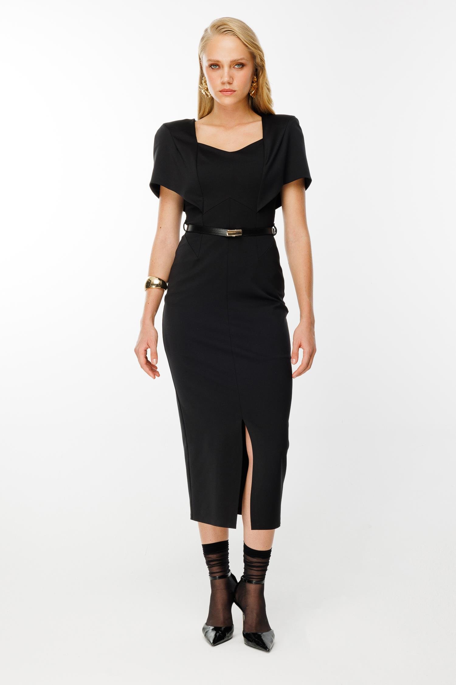 Black Front Slit Dress with Belt